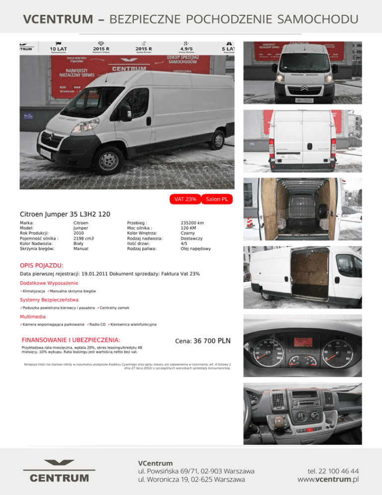 Citroen Jumper 35 L3H2 120 Marka: Model: Rok Produkcji: Pojemność silnika : Kolor Nadwozia: Skrzynia biegów: Citroen Jumper 2010 2198 cm3 Biały Manual Przebieg : Moc silnika : Kolor Wnętrza: Rodzaj nadwozia: Ilość drzwi: Rodzaj paliwa: 235200 km 120 KM Czarny Dostawczy 4/5 Olej napędowy OPIS POJAZDU: Data pierwszej rejestracji: 19.01.2011 Dokument sprzedaży: Faktura Vat 23% Dodatkowe Wyposażenie ✓Klimatyzacja ✓Manualna skrzynia biegów Systemy Bezpieczeństwa ✓Poduszka powietrzna kierowcy i pasażera ✓Centralny zamek Multimedia ✓Kamera wspomagająca parkowanie ✓Radio CD ✓Kierownica wielofunkcyjna FINANSOWANIE I UBEZPIECZENIA: Cena: 36 700 PLN Przykładowa rata miesięczna, wpłata 20%, okres leasingu/kredytu 48 miesięcy, 10% wykupu. Rata leasingu jest wartością netto bez vat. Niniejsza treść nie stanowi oferty w rozumieniu przepisów Kodeksu Cywilnego oraz opisu towaru ani zapewnienia w rozumieniu art. 4 Ustawy z dnia 27 lipca 2002r o szczególnych warunkach sprzedaży konsumenckiej. Powered by TCPDF (www.tcpdf.org)