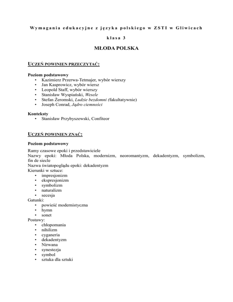Wy ma g a ni a edu ka cy jn e z język a po l ski eg o w ZST I w Gl iwi ca ch klasa 3 MŁODA POLSKA UCZEŃ POWINIEN PRZECZYTAĆ: Poziom podstawowy • Kazimierz Przerwa-Tetmajer, wybór wierszy • Jan Kasprowicz, wybór wiersz • Leopold Staff, wybór wierszy • Stanisław Wyspiański, Wesele • Stefan Żeromski, Ludzie bezdomni (fakultatywnie) • Joseph Conrad, Jądro ciemności Konteksty • Stanisław Przybyszewski, Confiteor UCZEŃ POWINIEN ZNAĆ: Poziom podstawowy Ramy czasowe epoki i przedstawiciele Nazwy epoki: Młoda Polska, modernizm, neoromantyzm, dekadentyzm, symbolizm, fin de siecle Nazwa światopoglądu epoki: dekadentyzm Kierunki w sztuce: • impresjonizm • ekspresjonizm • symbolizm • naturalizm • secesja Gatunki: • powieść modernistyczna • hymn • sonet Postawy: • chłopomania • nihilizm • cyganeria • dekadentyzm • Nirwana • synestezja • symbol • sztuka dla sztuki Podstawy filozoficzne światopoglądu epoki: • Artur Scopenhauer • Fridrich Nietzsche • Henri Bergson Nauka o języku: • stylizacja i rodzaje stylizacji • cechy języka mówionego i pisanego • odmiany terytorialne i środowiskowe polszczyzny • zapożyczenia we współczesnym języku polskim; cechy języka okresu Młodej Polski, WYMAGANIA NA POSZCZEGÓLNE OCENY: Aby otrzymać ocenę dopuszczającą, uczeń powinien umieć: 1. 2. 3. 4. 5. 6. 7. 8. 9. 10. 11. 12. 13. 14. 15. 16. Posługiwać się podręcznikiem. Prowadzić zeszyt. Odrabiać zadania domowe, przygotowywać się do lekcji. Czytać głośno i wyraźnie, z właściwą dykcją i intonacją. Redagować notatki w trakcie lekcji i samodzielnie je porządkować. Przeczytać ze zrozumieniem lektury podstawowe, pamiętając o przypisach i wyjaśnieniach. Znać inne nazwy epoki i wyjaśnić ich znaczenie. Wymienić kierunki filozoficzne, popularne w modernizmie (A. Schopenhauer, F. Nietzsche, H. Bergson) oraz przedstawić ich główne założenia. Wymienić kierunki artystyczne epoki (impresjonizm, ekspresjonizm, symbolizm, naturalizm, secesja) oraz ich podstawowe wyznaczniki. Przedstawić bohaterów literackich lektur z poziomu podstawowego (Wesele, Ludzie bezdomni(fakultatywnie), Jądro ciemności). Wskazać na główne elementy świata przedstawionego lektur z poziomu podstawowego. Określić gatunki literackie poznanych tekstów i występujące w nich środki artystyczne. Nazwać i wyjaśnić następujące pojęcia: chłopomania, cyganeria, dekadentyzm. Czytać ze zrozumieniem tekst nieliteracki, tzn.: popularnonaukowy, publicystyczny, naukowy (np. filozoficzny lub teoretycznoliteracki): wyodrębniać tezę (główną myśl) całego tekstu lub jego fragmentów (np. akapitu) określać nadawcę i adresata tekstu, określać główną funkcję tekstu, nazywać najważniejsze środki językowe, występujące w tekście, znajdować w tekście potrzebne informacje, odtwarzać je i przetwarzać, odróżniać występujące w tekście informacje od opinii. Określić cechy języka mówionego i pisanego. Określić, czym jest stylizacja i wymienić rodzaje stylizacji w poszczególnych utworach ( np. Wesele). Aby otrzymać ocenę dostateczną, uczeń musi spełniać wymagania na ocenę dopuszczająca, a ponadto powinien umieć: Wskazać na związki epoki Młodej Polski z romantyzmem. Podać przykłady impresjonizmu, symbolizmu i ekspresjonizmu w sztuce. Nazwać i zdefiniować młodopolskie prądy artystyczne i wskazać ich konkretyzacje w literaturze. 4. Charakteryzować postacie literackie. 5. Interpretować liryki młodopolskie i dostrzegać w nich nurty artystyczne i filozoficzne. 6. Wskazywać na środki artystyczne, występujące w lirykach młodopolskich i nazwać je. 7. Nauczyć się na pamięć jednego tekstu lirycznego. 8. Pisać wypracowania na temat, bez zakłóceń w komunikacji. 9. Znać na pamięć cytaty i wprowadzać je do odpowiedzi ustnych i pisemnych. 10. Zdefiniować pojęcie stylizacji i wskazać jej rodzaje w omawianych tekstach. 1. 2. 3. Aby otrzymać ocenę dobrą, uczeń musi spełniać wymagania na ocenę dopuszczającą i dostateczną, a ponadto powinien umieć: 1. Zdefiniować postawy typowe dla Młodej Polski i odnieść je do utworów literackich (dekadentyzm, schopenhaueryzm, nietzscheanizm, bergsonizm, humanizm) oraz wskazać właściwe dla nich środki artystyczne. 2. Przedstawić powiązania Młodej Polski z innymi epokami (podobieństwo z romantyzmem, sprzeczność z pozytywizmem). 3. Charakteryzować i oceniać postacie literackie 4. Dokonać analizy i interpretacji wierszy młodopolskich, wskazując typowe dla epoki motywy, postawy i środki artystyczne oraz ich funkcje. 5. Omówić młodopolskie koncepcje artysty i sztuki, ukazane w artykułach programowych oraz w utworach poetyckich. 6. Na przykładzie konkretnego utworu omówić cechy powieści młodopolskiej. 7. Na przykładzie konkretnego utworu wskazać cechy dramatu symbolicznego. 8. Nauczyć się na pamięć dwóch lirycznych tekstów młodopolskich. 9. Samodzielnie pisać wypracowania, prezentując logiczną argumentację i własne opinie. 10. Umiejętnie wprowadzać cytaty do wypowiedzi ustnych i pisemnych. 11. Redagować plany i konspekty wypracowań. 12. Czytać ze zrozumieniem tekst nieliteracki, tzn.: popularnonaukowy, publicystyczny, naukowy (np. filozoficzny lub teoretycznoliteracki): 13. rozpoznawać zasadę kompozycyjną tekstu, 14. określać różne funkcje tekstu, 15. określać funkcję środków językowych. 16. Znać i rozpoznawać odmiany terytorialne i środowiskowe polszczyzny. 17. Znać cechy stylów funkcjonalnych (potoczny, publicystyczny, naukowy i artystyczny). Aby otrzymać ocenę bardzo dobrą, uczeń musi spełniać wymagania na ocenę dopuszczająca, dostateczną i dobrą, a ponadto powinien umieć: 1. Określić, na czym polega uniwersalna wartość utworów młodopolskich. 2. Wskazać źródła i znaczenie wskazanych archetypów, toposów i symboli (topika chrześcijańska – Chrystus, Lucyfer