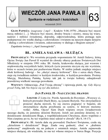 WIECZÓR JANA PAWŁA II Spotkanie w rodzinach i kościołach 63 wrzesień 2010 GŁOS PAPIEŻA: (nagranie 1.mp3 – Kraków 9.06.1979) „Musicie być mocni mocą miłości […]. Musicie być mocni, drodzy bracia i siostry, mocą tej wiary, nadziei i miłości świadomej, dojrzałej, odpowiedzialnej, która pomaga nam podejmować ów wielki dialog z człowiekiem i światem na naszym etapie dziejów - dialog z człowiekiem i światem, zakorzeniony w dialogu z Bogiem samym”. Zapalenie świecy i „Apel Jasnogórski”. BŁ. ANIELA SALAWA - SŁUŻĄCA PROWADZĄCY: We wrześniu przypada wspomnienie bł. Anieli Salawy, którą Ojciec Święty Jan Paweł II wyniósł do chwały ołtarzy podczas Światowych Dni Młodzieży w sierpniu 1991 roku. Bł. Aniela, krakowska służąca, jest wzorem i orędowniczką wszystkich ludzi, których życie pozornie niczym się nie wyróżnia, które w oczach świata jest pozbawione blasku. W niebie jednak znajduje miejsce obok królowej Jadwigi – bo „służyć znaczy królować”. Kto z serca służy Panu, staje się świadkiem miłości w każdym środowisku, w każdym powołaniu. Prośmy Maryję, Służebnicą Pańską, byśmy tak jak te święte kobiety odnajdowali prawdziwą wielkość naszego powołania. WSZYSCY: Odmawiają „Pod Twoją obronę” i śpiewają pieśń, np. Gdy klęczę przed Tobą, lub Nie bójcie się żyć dla miłości. JAN PAWEŁ II - NAUCZYCIEL PRAWDY LEKTOR: Z Listu św. Pawła Apostoła do Rzymian: „Wszyscy ci, których prowadzi Duch Boży, są synami Bożymi. Nie otrzymaliście przecież ducha niewoli, by się znowu pogrążyć w bojaźni, ale otrzymaliście ducha przybrania za synów, w którym możemy wołać: Abba, Ojcze! Sam Duch wspiera swym świadectwem naszego ducha, że jesteśmy dziećmi Bożymi. Jeżeli zaś jesteśmy dziećmi, to i dziedzicami: dziedzicami Boga, a współdziedzicami Chrystusa, skoro wspólnie z Nim cierpimy po to, by też wspólnie mieć udział w chwale” (Rz 8, 14-17). PROWADZĄCY: Bł. Aniela dała się prowadzić Duchowi Świętemu, czuła się „dzieckiem i dziedzicem” Boga. Znała swą godność, choć w „drabinie społecznej” znajdowała się na jednym z ostatnich miejsc. Aniela zajmowała miejsce służącej, ale wiedziała, że ma też własne miejsce w Sercu Boga. Pozycja służącej nie przeszkodziła jej nawiązać oblubieńczej więzi ze Stwórcą i Panem świata. Popatrzmy na swoje miejsce w życiu. Czy pozwalamy się prowadzić Duchowi Świętemu? Czy szukamy miejsca, w którym Bóg pragnie nawiązać z nami więź przyjaźni, czy też patrzymy oczyma tego świata – wciąż niezadowoleni, chcemy piąć się wzwyż po szczeblach kariery, więcej mieć, więcej znaczyć w oczach ludzi, mieć władzę nad innymi. Czy nie ulegamy złudzeniu, że w innym miejscu bylibyśmy lepsi, świętsi, bardziej kochający? Że to okoliczności zewnętrzne decydują o naszej więzi z Bogiem, o naszej godności, o naszym szczęściu? LEKTOR: Z homilii podczas Mszy św. beatyfikacyjnej (Kraków, 13 sierpnia 1991 – nagranie 2.mp3): „Słowa Pawłowe z Listu do Rzymian, przeczytane na początku, są myślą przewodnią Światowego Dnia Młodzieży na Jasnej Górze. Młodzi pielgrzymi z różnych stron świata, nade wszystko z różnych krajów Europy, podążają w tych dniach do jasnogórskiego sanktuarium. Kierują nimi słowa Apostoła: "Ci, których prowadzi Duch Boży, są synami Bożymi. Nie otrzymaliście przecież ducha niewoli (...), ale otrzymaliście ducha przybrania za synów, w którym możemy wołać: «Abba, Ojcze»". Radością Ducha Świętego jest, gdy może dawać świadectwo naszemu ludzkiemu duchowi, "że jesteśmy dziećmi Bożymi. Jeżeli zaś jesteśmy dziećmi, to i dziedzicami: dziedzicami Boga, a współdziedzicami Chrystusa". Podążając na to spotkanie młodzieży, zatrzymuję się w Krakowie wśród moich rodaków. Ileż tutaj ludzkich dzieł i ludzkich serc świadczy przez pokolenia o tym Bożym, Chrystusowym dziedzictwie! Ileż sam temu świadectwu zawdzięczam. Niech nie ustaje wśród murów starego i nowego Krakowa, zawsze królewskiego, niech nie ustaje radość Ducha Świętego, którą są umysły i serca wrażliwe na Jego Boskie świadectwo! I dlatego też wielka jest moja radość, że mogłem w dniu dzisiejszym dokonać w Krakowie beatyfikacji Anieli Salawy. Ta córka ludu polskiego, urodzona w niedalekim Sieprawiu, znaczną część swego życia związała z Krakowem. To miasto było środowiskiem jej pracy, jej cierpienia, jej dojrzewania w świętości. Związana z duchowością św. Franciszka z Asyżu, okazywała niezwykłą wrażliwość na działanie Ducha Świętego. Świadczą o tym zapiski, jakie po niej pozostały”. WSZYSCY: Trwają przez chwili w ciszy. Można zaśpiewać pieśń: Duchu Najświętszy, otwórz usta moje lub Duchu Ogniu, Duchu Żarze albo Duchu Święty wołam przyjdź. LEKTOR: (nagranie 3.mp3 – cd.) „Nam, którzy dzisiaj śpiewaliśmy w psalmie responsoryjnym: "Wszyscy zobaczcie, jak nasz Pan jest dobry", nam Chrystus mówi: pozwólcie Bogu być dobrym na Jego własną miarę. Dobro jest dobrem przez to, że się udziela, że sobą obdarowuje. Pozwólcie Bogu żywemu, który jest Ojcem, Synem i Duchem Świętym, być dobrym dla was ludzi na Jego własną miarę. Jest to miara ponadludzka. Jest to miara tajemnicy. A równocześnie ma swój ludzki wyraz. Jest to miara krzyżowej ofiary, jest to miara Eucharystii. "Chrystus was umiłował i samego siebie wydał za nas w ofierze". A tę swoją odkupieńczą ofiarę zostawił nam w Eucharystii jako dar. To w mocy tego daru, w mocy tego pokarmu pielgrzymujemy przez życie doczesne, jak kiedyś pielgrzymował Izrael po pustyni. To o tym darze świadczą prastare i najnowsze świątynie Krakowa, które ku wszystkim wołają: "Popatrzcie, jak nasz Pan jest dobry". Świątynie Krakowa! Ileż one mówiły o Bogu - o tym Bogu, który sobą pragnie obdarowywać człowieka - i