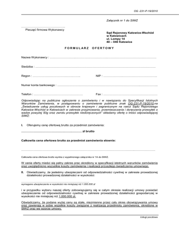 OG -231-P-19/2010 Załącznik nr 1 do SIWZ …………………………………….. Pieczęć firmowa Wykonawcy Sąd Rejonowy Katowice-Wschód w Katowicach ul. Lompy 14 40 – 040 Katowice FORMULARZ OFERTOWY Nazwa Wykonawcy : ……………………..…………………………..…………………………………………. Siedziba : ………………………………………………………………………………………………………… Regon : ………………………………….…….. NIP : ……………….…………………………….. Numer konta bankowego : ………………………………………………………………………..……………... Telefon : …………………………………………. Fax : ……………………………………………… Odpowiadając na publiczne ogłoszenie o zamówieniu i w nawiązaniu do Specyfikacji Istotnych Warunków Zamówienia, w postępowaniu o zamówienie publiczne znak OG-231-P-19/2010,na „Świadczenie usług pocztowych w obrocie krajowym i zagranicznym na rzecz Sądu Rejonowego Katowice-Wschód w Katowicach w zakresie przyjmowania, przemieszczania i doręczania przesyłek o wadze powyŜej 50g oraz zwrotu przesyłek niedoręczonych” składamy ofertę o treści odpowiadającej SIWZ: I. Oferujemy cenę ofertową brutto za przedmiot zamówienia: …………………………………….……..………. zł brutto Całkowita cena ofertowa brutto za przedmiot zamówienia słownie: …………………………………………………………………………………………………..………………… Całkowita cena ofertowa brutto wynika z wypełnionego załącznika nr 1A do SIWZ. W cenie oferty mieści się pełny zakres prac określony w specyfikacji istotnych warunków zamówienia oraz uwzględniono wszystkie koszty zamówienia i realizacji przyszłego świadczenia umownego. II. Oświadczamy, Ŝe jesteśmy ubezpieczeni od odpowiedzialności cywilnej w zakresie prowadzonej działalności prowadzonej działalności w wysokości: ………………………………………………….………. wymagane ubezpieczenie w wysokości nie mniejszej niŜ 1.000.000 zł i w przypadku wyboru naszej oferty zobowiązujemy się w całym okresie realizacji umowy posiadać ubezpieczenie od odpowiedzialności cywilnej w zakresie prowadzonej działalności gospodarczej w wysokości nie mniejszej niŜ 1.000.000 zł. Oświadczamy, Ŝe podane wyŜej ceny są stałe, niezmienne przez cały okres obowiązywania umowy oraz zawierają w sobie wszelkie koszty związane z realizacją przedmiotu zamówienia, określone w SIWZ oraz we wzorze umowy. Usługi pocztowe OG -231-P-19/2010 Deklarujemy następujące warunki realizacji zamówienia: • • • • Akceptujemy warunki i terminy płatności wskazane w SIWZ. Oświadczamy, Ŝe zapoznaliśmy się ze Specyfikacją istotnych warunków zamówienia i zobowiązujemy się do stosowania i ścisłego przestrzegania warunków w niej określonych. Oświadczamy, Ŝe uwaŜamy się za związanych niniejszą ofertą na czas wskazany w Specyfikacji istotnych warunków zamówienia, tj. 60 dni od upływu terminu składania ofert. Oświadczamy, Ŝe zawarte w Specyfikacji istotnych warunków zamówienia wzory umów zostały przez nas zaakceptowane i zobowiązujemy się w przypadku wyboru naszej oferty do zawarcia umowy na warunkach określonych we wzorze w miejscu i terminie wyznaczonym przez Zamawiającego. Oferta została złoŜona na ………….. ponumerowanych stronach. ZastrzeŜenie Wykonawcy : NiŜej wymienione dokumenty składające się na ofertę nie mogą być ogólnie udostępnione: ……………………………………………………………………………………………………………………… ……………………………………………………………………………………………………………………… ……………………………………………………………………………………………………………………… Inne informacje Wykonawcy: ……………………………………………………………………………………………………………………… ……………………………………………………………………………………………………………………… ……………………………………………………………………………………………………………………… …………………………………. ……………………….., dnia ……….….. 2010 r. Miejscowość ………………………………………………………………….. Podpis osoby (osób) upowaŜnionej do występowania w imieniu Wykonawcy ( PoŜądany czytelny podpis albo podpis i pieczątka z imieniem i nazwiskiem ). Usługi pocztowe
