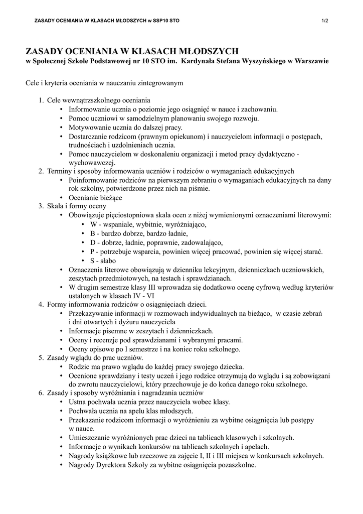 ZASADY OCENIANIA W KLASACH MŁODSZYCH w SSP10 STO 1/2 ZASADY OCENIANIA W KLASACH MŁODSZYCH w Społecznej Szkole Podstawowej nr 10 STO im. Kardynała Stefana Wyszyńskiego w Warszawie Cele i kryteria oceniania w nauczaniu zintegrowanym 1. Cele wewnątrzszkolnego oceniania • Informowanie ucznia o poziomie jego osiągnięć w nauce i zachowaniu. • Pomoc uczniowi w samodzielnym planowaniu swojego rozwoju. • Motywowanie ucznia do dalszej pracy. • Dostarczanie rodzicom (prawnym opiekunom) i nauczycielom informacji o postępach, trudnościach i uzdolnieniach ucznia. • Pomoc nauczycielom w doskonaleniu organizacji i metod pracy dydaktyczno wychowawczej. 2. Terminy i sposoby informowania uczniów i rodziców o wymaganiach edukacyjnych • Poinformowanie rodziców na pierwszym zebraniu o wymaganiach edukacyjnych na dany rok szkolny, potwierdzone przez nich na piśmie. • Ocenianie bieżące 3. Skala i formy oceny • Obowiązuje pięciostopniowa skala ocen z niżej wymienionymi oznaczeniami literowymi: • W - wspaniale, wybitnie, wyróżniająco, • B - bardzo dobrze, bardzo ładnie, • D - dobrze, ładnie, poprawnie, zadowalająco, • P - potrzebuje wsparcia, powinien więcej pracować, powinien się więcej starać. • S - słabo • Oznaczenia literowe obowiązują w dzienniku lekcyjnym, dzienniczkach uczniowskich, zeszytach przedmiotowych, na testach i sprawdzianach. • W drugim semestrze klasy III wprowadza się dodatkowo ocenę cyfrową według kryteriów ustalonych w klasach IV - VI 4. Formy informowania rodziców o osiągnięciach dzieci. • Przekazywanie informacji w rozmowach indywidualnych na bieżąco, w czasie zebrań i dni otwartych i dyżuru nauczyciela • Informacje pisemne w zeszytach i dzienniczkach. • Oceny i recenzje pod sprawdzianami i wybranymi pracami. • Oceny opisowe po I semestrze i na koniec roku szkolnego. 5. Zasady wglądu do prac uczniów. • Rodzic ma prawo wglądu do każdej pracy swojego dziecka. • Ocenione sprawdziany i testy uczeń i jego rodzice otrzymują do wglądu i są zobowiązani do zwrotu nauczycielowi, który przechowuje je do końca danego roku szkolnego. 6. Zasady i sposoby wyróżniania i nagradzania uczniów • Ustna pochwała ucznia przez nauczyciela wobec klasy. • Pochwała ucznia na apelu klas młodszych. • Przekazanie rodzicom informacji o wyróżnieniu za wybitne osiągnięcia lub postępy w nauce. • Umieszczanie wyróżnionych prac dzieci na tablicach klasowych i szkolnych. • Informacje o wynikach konkursów na tablicach szkolnych i apelach. • Nagrody książkowe lub rzeczowe za zajęcie I, II i III miejsca w konkursach szkolnych. • Nagrody Dyrektora Szkoły za wybitne osiągnięcia pozaszkolne. ZASADY OCENIANIA W KLASACH MŁODSZYCH w SSP10 STO 2/2 Ocena semestralna 1. Formy oceny • Ocena semestralna ma formę pisemną. Informuje o osiągnięciach ucznia w nauce i zachowaniu w pierwszym semestrze, zawiera wskazania do pracy w drugim semestrze. • Forma oceny opisowej zależy od nauczyciela. 2. Tryb odwoławczy • Jeżeli rodzice nie zgadzają się z oceną nauczyciela, mogą się odwołać na piśmie do Rady Pedagogicznej za pośrednictwem Dyrektora Szkoły. • Rada Pedagogiczna ma obowiązek ustalenia zasadności wniesienia odwołania i podjęcia decyzji o ewentualnej zmianie oceny. Zasady oceniania zachowania 1. Ocena uwzględnia: kulturę osobistą, stosunek do obowiązków szkolnych, przestrzeganie ustalonych norm i zasad, umiejętność współpracy i współdziałania w grupie, panowanie nad emocjami, pomoc koleżeńską. 2. W zapisie ocen cząstkowych z zachowania, w dzienniku lekcyjnym stosujemy oznaczenia: • W- wyróżniająco, • B - bez zastrzeżeń, • N - niezadawalająco 3. Opinia o zachowaniu ucznia zawarta jest w ocenie opisowej po I semestrze i na koniec roku szkolnego. Sporządza ją wychowawca klasy uwzględniając spostrzeżenia innych nauczycieli i społeczności szkolnej. 4. Po I semestrze i na koniec roku szkolnego dzieci dokonują samooceny na „Karcie samooceny”. 5. Karty samooceny otrzymują rodzice. Opracował zespół nauczania zintegrowanego: Halina Wnuk, Ewa Korczakowska, Beata Kopczyńska, Małgorzata Makowska, Teresa Hałaj, Agata Fijałkowska