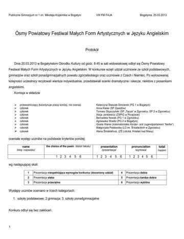 Publiczne Gimnazjum nr 1 im. Mikołaja Kopernika w Bogatyni VIII FM FAJA Bogatynia, 20.03.2013 Ósmy Powiatowy Festiwal Małych Form Artystycznych w Języku Angielskim Protokół Dnia 20.03.2013 w Bogatyńskim Ośrodku Kultury od godz. 8.45 w sali widowiskowej odbył się Ósmy Powiatowy Festiwal Małych Form Artystycznych w Języku Angielskim. W konkursie wzięli udział uczniowie ze szkół podstawowych, gimnazjów oraz szkół ponadgimnazjalnych powiatu zgorzeleckiego oraz uczniowie z Czech i Niemiec. Po wylosowanej kolejności uczestnicy recytowali wiersze indywidualnie, przedstawiali scenki dramatyczne i skecze, niektóre z piosenkami angielskimi. Komisja w składzie przewodniczący (koordynuje pracę komisji, nie ocenia) członek członek członek członek członek członek członek członek Katarzyna Staszak-Smolarek (PG 1 w Bogatyni) Anna Kielar (SP Zawidów) Tomasz Stypczyński (SP „Tęcza” w Zgorzelcu; SP 2 w Zgorzelcu) Alicja Jankiewicz (ZSPIG w Porajowie) Bernadeta Nowak (PG 1 w Zgorzelcu) Agnieszka Woeltz (PG 2 w Bogatyni) Gisela Wanie (Internationales Kinder- und Jugendparlament “Neiße”) Małgorzata Pasławska (LO im. Śniadeckich w Zgorzelcu) Alena Šindelářová, (ZŠ Lidická, Hrádek nad Nisou) oceniała występ uczniów na podstawie kryteriów poniżej: the choice of the poem /dobór tekstu/ name presentation pronunciation total /prezentacja/ /wymowa/ /razem/ 1 2 3 4 5 6 1 2 3 4 5 6 /imię i nazwisko/ 1 2 3 4 5 6 wg następującej skali: 1 Prezentacja niespełniająca wymogów konkursu (doceniony udział) 4 Prezentacja dobra 2 Prezentacja słaba 5 Prezentacja bardzo dobra 3 Prezentacja przeciętna 6 Prezentacja wybitna Występy uczniów oceniano w trzech kategoriach: 1. szkoły podstawowe; 2.gimnazja; 3. szkoły ponadgimnazjalne Konkurs odbył się bez zakłóceń. 1 Publiczne Gimnazjum nr 1 im. Mikołaja Kopernika w Bogatyni VIII FM FAJA Bogatynia, 20.03.2013 WYNIKI GIMNAZJA Lp. Imię i nazwisko uczestników Ilość osób Tytuł prezentacji Rodzaj prezentacji Czas Nauczyciel odpowiedzialny Historical Fashion Fix skecz 5 min Anna Rogalewicz- Gałucka, PG nr 1 w Zgorzelcu 5 Euphoria wiersz z piosenką 5 min. Beata Troc, M.Kosiba, PG nr 3 w Bogatyni 2 At a hotel skecz 4 min. Monika Karduszewska, Niepubliczne Gimnazjum Łużyckie w Zgorzelcu 5 The train timetable skecz 5 min. Piotr Zawadzki, Gimnazjum w Zawidowie 5 Yes or no? skecz 4 min. Klára Čiháková, ZŠ T. G. Masaryka, Hrádek nad Nisou, Republika Czeska 4 "Men`s Day" skecz 4 min. Katarzyna Staszak-Smolarek, PG nr 1 w Bogatyni III miejsce ex aequo 2 English lesson skecz 4 min. Bernadeta Nowak, PG nr 1 w Zgorzelcu III miejsce ex aequo 5 The lemmonsqueezer skecz 5 min. Gisela Wanie, Internationales Kinder- und Jugendparlament “Neiße”, Niemcy wyróżnienie 9. Julia Karska 1 Never been kissed monolog 4 min. Monika Karduszewska, Niepubliczne Gimnazjum Łużyckie w Zgorzelcu I miejsce 10. Dworak Anna, Hantke 5 „Talent Show” skecz 5 min. Agnieszka Woeltz, PG nr 2 w Bogatyni II miejsce 5 Fashion Show skecz 4 min. Alena Šindelářová, ZŠ Lidická, Hrádek nad Nisou 12. Maciej Romanowski 1 Indian poem Wiersz 5 min. Anna Rogalewicz- Gałucka, PG nr 1 w Zgorzelcu 13. Agnieszka Pawicka, Klaudia 4 „Little Red Riding Hood” scenka 5 min. Małgorzata Kosiba, PG nr 1 w Bogatyni 2 untitled skecz 4 min. Jerzy Krajewski, Niepubliczne Gimnazjum Łużyckie w Zgorzelcu 1. Justyna Mazur, Benita Gładysz, 4 Aleksandra Zimnicka, Daria Maj 2. Mirella Puchowska, Patrycja Banach, Karolina Jóźwin, Oliwia Aleksandrzak, Paulina Kałmuk 3. Konrad Rokicki, Konrad Tomaszewski 4. Adam Ptak, Sandra Piosna, Aleksandra Usik, Ewelina Kuszaj, Krystian Tyrpa 5. Sarah Ženatá, Veronika Matyjasiková, Milan Kučera, Andera Weberová, Kateřina Antošová 6. Katarzyna Doroszczak, Jakub Piątkowski, Mateusz Olizarowicz, Sandra Stal 7. Kamil Bermes Barbara Delijewska 8. Rebecca Krüger, Kevin Apelt, Alexandra Wolf, Alexander Ganz, Maria Kreisig Zuzanna, Kopaczyńska Adrianna, Sieradzka Paulina, Urban Hanna 11. Kateřina Gregorová , Lucie Blažková, Kristián Rajdl, Jan Martinec, Vojtěch Sládek Pęcikiewicz, Elżbieta Kot, Amanda Kleinschmidt 14. Aleksandra Starzyńska, Agnieszka Jankowska RAZEM 14 prezentacji 2 50 osoby 9 szkół; 13 nauczycieli Miejsce wyróżnienie Publiczne Gimnazjum nr 1 im. Mikołaja Kopernika w Bogatyni VIII FM FAJA Bogatynia, 20.03.2013 SZKOŁY PONADGIMNAZJALNE Lp. Imię i nazwisko uczestników Ilość osób Tytuł prezentacji Rodzaj prezentacji Czas Nauczyciel odpowiedzialny 1. Michał Mróz, Maria Ilczyna, Justyna Czapiga 3 Love? skecz 3 min. Justyna Cebulska LO im. Śniadeckich w Zgorzelcu 2. Bartosz Kempski, Wojciech Wiśniewski 2 A dead parrot Skecz 3 min. Anna Hantke, LO w Bogatyni II miejsce 3. Przemysław Bawół 1 Robin Williams’ stand up monolog 4-5 min Artur Florkowski, LO „Cogito” w Zgorzelcu III miejsce ex aequo 4. Maks Gubała, Wojciech Kowalik, Bartosz 3 Gardziejewski Doctor ‘Evil’ skecz 3 min. Małgorzata Pasławska, LO im. Śniadeckich w Zgorzelcu 5. Jakub Nowak, Mateusz Kasprzak 2 A Love story Scenka z piosenką 5 min. Anna Hantke, LO w Bogatyni III miejsce ex aequo 6. Nadia Jeroushi, Paul Schenke, Leona Mrackova 3 Do you speak English 3 min. Grzegorz Dusza, Schkola Jonsdorf, Niemcy wyróżnienie 7. Klara Zdonek, Magdalena Iwaniak, Łukasz Sumliński 3 This is the man’s world skecz 3 min. Małgorzata Pasławska, LO im. Śniadeckich w Zgorzelcu I miejsce 8. Gabriela Wojnarowska, Ewelina Dąbrowska, Marcin Gorczyca 3 On the train Skecz 3 min. Anna Hantke, LO w Bogatyni RAZEM 8 prezentacji 20 osób Miejsce 4 szkoły, 5 nauczycieli SZKOŁY PODSTAWOWE Lp. Imię i nazwisko uczestników Ilość osób Tytuł prezentacji Rodzaj prezentacji Czas Nauczyciel odpowiedzialny 1. Wiktoria Wąchalska, Klaudia Lorenc 2 The Post Office skcz 5 min Iga Piechocka, SP nr 5 w Zgorzelcu 2. Tomasz Bałdyga, Tomasz Wilczyński 2 Brand New Car skecz 5 min Tomasz Stypczyński, SP 2 w Zgorzelcu 3. Gabrie