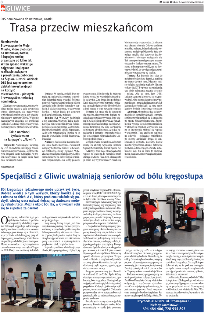 8 24 lutego 2016, nr 8, www.nowiny.gliwice.pl GliWice DTŚ nominowana do Betonowej Kostki Trasa przeciw mieszkańcom Nominowało Stowarzyszenie Moje Miasto, które plebiscyt na Betonową Kostkę i Superjednostkę organizuje od kilku lat. W ten sposób wskazuje najgorsze i najlepsze realizacje związane z przestrzenią publiczną na Śląsku. Gliwicki odcinek DTŚ jest zaprzeczeniem działań inwestycyjnych na korzyść mieszkańców – pieszych i rowerzystów, twierdzą nominujący. Zdaniem stowarzyszenia, trasa szybkiego ruchu będzie z całą pewnością służyć kierowcom, ale negatywnie wpłynie na komfort życia czy spędzania czasu w centrum Gliwic. W gronie oceniających znajdują się architekci i urbaniści, a także miejscy aktywiści. Rozstrzygnięcie plebiscytu w kwietniu. Tak o nominacji dyskutowano na fanpage`u „Nowin”: Tomasz R.: Narzekający i uważający DTŚ za chybioną inwestycję powinni mieć zakaz korzystania. Jeźdźcie starymi drogami, skoro było lepiej. Po prostu cieszy mnie, że dzięki trasie będę miał łatwiejsze życie; Łukasz: W sensie, że jeśli Pan narzeka np. na korki w centrum, to powinien Pan mieć zakaz wjazdu? Świetny pomysł! Podpowiedzmy miastu! Niech zatrudnią ludzi i będzie kontrola w korkach, i jak ktoś narzeka, to czerwona kartka, i zakaz jazdy po centrum pod karą konfiskaty pojazdu; Tomasz R.: Wszyscy będziecie z niej korzystać. Wszyscy. Takie inicjatywy już mnie wcale nie dziwią. Polaczkowatość do n-tej potęgi. Zaprojektujecie i wykonacie to lepiej? Zapraszam. A do tego zorganizujcie jeszcze na to przede wszystkim środki finansowe, mądrale; Andrzej: Jak ktoś nie ma samochodu, to nie będzie korzystał. Natomiast wszyscy będziemy musieli tę betonowo-asfaltową „rzekę” oglądać. Wdychać dochodzące z niej spaliny. Lobby samochodowe na dobre się już w mieście rozpanoszyło. Jak lobby palaczy swego czasu. Nie dało się do żadnego klubu wejść, bo wszędzie było aż biało od dymu. Z tą drogą jest podobnie. Ktoś ma egoistyczną potrzebę jeżdżenia samochodem szybko i bez korków, a inni muszą z tego powodu cierpieć; Tomasz R.: Może nie do końca mi się podoba, ale przecież to dopiero początek zagospodarowywania tego terenu! Czy ktoś się spodziewał, że natychmiast po ukończeniu tego odcinka wyrośnie tam trawa czy inny las? Dajmy sobie na to chwilę czasu. A tu już narzekanie i lamenty częstochowskie, jak to w centrum nie można będzie „dobrze spędzić czasu”. Czegokolwiek nie zrobisz, żeby tam miały za chwilę wyrosnąć kolejne Ogrody Semiramidy, to i tak będzie źle; Andrzej: Jeśli moje okna wychodzą wprost na tę drogę, to raczej nie mam dużego wyboru. Poza tym, dlaczego to ja mam się wyprowadzać? Niech się blachosmrody wyprowadzą. Ja nikomu pod oknami nie truję. Celowo podałem przykład palaczy, których słusznie wyrzucono z miejsc publicznych, żeby niepalący mogli z nich korzystać bez konieczności biernego zaciągania się. Tak samo powinno się postąpić z samochodami w ścisłym centrum miasta. Teraz to ani na spacer wyjść, ani na ławce posiedzieć, bo powietrze jest zupełnie zanieczyszczone od spalin; Tomasz Ż.: Prawda jest taka że mógł tam być piękny deptak, a parking na terenie dawnej huty. Niestety, miasto kolejny raz się nie popisało. I jestem ciekaw jak DTŚ wpłynie na palmiarnię, tzn. kiedy palmiarnia zacznie się walić i pękać. Ale co tam, jest DTŚ; Łukasz: A może kierowcy się wyprowadzą? Albo zostawią samochody poza miastem i przesiądą się na rowery lub komunikację miejską? I od razu mniej korków będzie i powietrze czystsze. Andrzej: Abstrahując już od antymiejskości samej inwestycji, to trzeba sobie uczciwie napisać, że ta droga jest po prostu źle zaprojektowana. Zupełnie nie wpisuje się w kontekst miejsca, w którym się znajduje. Zwykle jest tak, że to inwestycja próbuje się wpisać w otoczenie. Tutaj zrobiono zupełnie na odwrót – otoczenie zmieniono, po to żeby „zmieścić” drogę. W konsekwencji zepsuto, niestety, kawał miasta (wyburzenia, ekrany, betonowe pustynie, odstręczające obiekty kubaturowe, itd). Już za samo to stanowi, moim zdaniem, murowaną kandydaturę do kostki. PROMOCJA Specjaliści z Gliwic uwalniają seniorów od bólu kręgosłupa Ból kręgosłupa lędźwiowego może uprzykrzyć życie. Dobrze wiedzą o tym wszyscy, którzy borykają się z nim na co dzień. A ci, którzy problemu właśnie się pozbyli, wiedzą rzecz najważniejszą: są skuteczne metody rehabilitacji. Można ukoić ból. Ba, w Gliwicach robi się to zupełnie za darmo! O kazuje się, a dowodzą tego specjalistyczne badania, że podstawową metodą rehabilitacji zespołów bólowych kręgosłupa lędźwiowego są aktywne ćwiczenia fizyczne. Anowe technologie, jakie stosuje się w Gliwicach, w przychodni rehabilitacyjnej przy ul. Szparagowej, umożliwiają kontrolowanie przebiegu rehabilitacji oraz treningów. Mowa o metodzie z wykorzystaniem czterech nowoczesnych urządzeń Tergumed700. Dzięki nim możliwa jest dokład- na diagnoza oraz terapia odcinka lędźwiowego kręgosłupa. Inną znaną formą terapii, już bardziej konwencjonalnej, również przeprowadzanej w przychodni, jest trening stabilizacji centralnej, który ma na celu m. in. poprawę funkcjonalną mięśni. Pacjenci wykonują ćwiczenia pod okiem terapeuty – na matach i z wykorzystaniem przyborów: piłek, krążków, taśm. Największym hitem rehabilitacji przychodni, który przyciąga tłumy chętnych, są jednak urządzenia Tergumed700, oferowane przez firmę PHU TECHNOMEX Sp. z o. o. z Gliwic, jakimi pochwalić się może tylko kilka ośrodków w całej Polsce. Przed terapią na nich wykonywany jest test maksymalnej siły mięśniowej oraz maksymalnego zakresu ruchowości. Dopiero na jego podstawie tworzy się indywidualny, ściśle przystosowany do danego pacjenta, plan treningowy. I, co najważniejsze, dzięki testowi można ter
