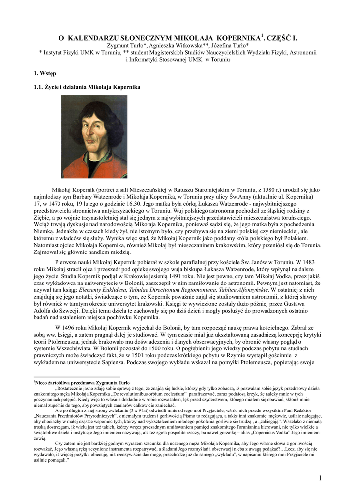 O KALENDARZU SŁONECZNYM MIKOLAJA KOPERNIKA1. CZĘŚĆ I. Zygmunt Turło*, Agnieszka Witkowska**, Józefina Turło* * Instytut Fizyki UMK w Toruniu, ** student Magisterskich Studiów Nauczycielskich Wydziału Fizyki, Astronomii i Informatyki Stosowanej UMK w Toruniu 1. Wstęp 1.1. Życie i działania Mikołaja Kopernika Mikołaj Kopernik (portret z sali Mieszczańskiej w Ratuszu Staromiejskim w Toruniu, z 1580 r.) urodził się jako najmłodszy syn Barbary Watzenrode i Mikołaja Kopernika, w Toruniu przy ulicy Św.Anny (aktualnie ul. Kopernika) 17, w 1473 roku, 19 lutego o godzinie 16.30. Jego matka była córką Łukasza Watzenrode - najwybitniejszego przedstawiciela stronnictwa antykrzyżackiego w Toruniu. Wuj polskiego astronoma pochodził ze śląskiej rodziny z Ziębic, a po wojnie trzynastoletniej stał się jednym z najwybitniejszych przedstawicieli mieszczaństwa toruńskiego. Wciąż trwają dyskusje nad narodowością Mikołaja Kopernika, ponieważ sądzi się, że jego matka była z pochodzenia Niemką. Jednakże w czasach kiedy żył, nie istotnym było, czy przebywa się na ziemi polskiej czy niemieckiej, ale któremu z władców się służy. Wynika więc stąd, że Mikołaj Kopernik jako poddany króla polskiego był Polakiem. Natomiast ojciec Mikołaja Kopernika, również Mikołaj był mieszczaninem krakowskim, który przeniósł się do Torunia. Zajmował się głównie handlem miedzią. Pierwsze nauki Mikołaj Kopernik pobierał w szkole parafialnej przy kościele Św. Janów w Toruniu. W 1483 roku Mikołaj stracił ojca i przeszedł pod opiekę swojego wuja biskupa Łukasza Watzenrode, który wpłynął na dalsze jego życie. Studia Kopernik podjął w Krakowie jesienią 1491 roku. Nie jest pewne, czy tam Mikołaj Vodka, przez jakiś czas wykładowca na uniwersytecie w Bolonii, zaszczepił w nim zamiłowanie do astronomii. Pewnym jest natomiast, że używał tam ksiąg: Elementy Euklidesa, Tabulae Directionum Regiomontana, Tablice Alfonsyńskie. W ostatniej z nich znajdują się jego notatki, świadczące o tym, że Kopernik poważnie zajął się studiowaniem astronomii, z której sławny był również w tamtym okresie uniwersytet krakowski. Księgi te wywiezione zostały dużo później przez Gustawa Adolfa do Szwecji. Dzięki temu dzieła te zachowały się po dziś dzień i mogły posłużyć do prowadzonych ostatnio badań nad ustaleniem miejsca pochówku Kopernika. W 1496 roku Mikołaj Kopernik wyjechał do Bolonii, by tam rozpocząć naukę prawa kościelnego. Zabrał ze sobą ww. księgi, a zatem pragnął dalej je studiować. W tym czasie miał już ukształtowaną zasadniczą koncepcję krytyki teorii Ptolemeusza, jednak brakowało mu doświadczenia i danych obserwacyjnych, by obronić własny pogląd o systemie Wszechświata. W Bolonii pozostał do 1500 roku. O pogłębieniu jego wiedzy podczas pobytu na studiach prawniczych może świadczyć fakt, że w 1501 roku podczas krótkiego pobytu w Rzymie wystąpił gościnnie z wykładem na uniwersytecie Sapienza. Podczas swojego wykładu wskazał na pomyłki Ptolemeusza, popierając swoje 1 Nieco żartobliwa przedmowa Zygmunta Turło „Dostatecznie jasno zdaję sobie sprawę z tego, że znajdą się ludzie, którzy gdy tylko zobaczą, iż pozwalam sobie język przedmowy dzieła znakomitego męża Mikołaja Kopernika „De revolutionibus orbium coelestium” parafrazować, zaraz podniosą krzyk, że należy mnie w tych poczynaniach potępić. Kiedy więc to właśnie dokładnie w sobie rozważałem, lęk przed szyderstwem, którego miałem się obawiać, skłonił mnie niemal zupełnie do tego, aby powziętych zamiarów całkowicie zaniechać. Ale po długim z mej strony zwlekaniu (3 x 9 lat) odwiedli mnie od tego moi Przyjaciele, wśród nich przede wszystkim Pani Redaktor „Nauczania Przedmiotów Przyrodniczych”, z niemałym trudem i gorliwością Pismo to redagująca, a także inni znakomici mężowie, usilnie nalegając, aby chociażby w małej cząstce wspomóc tych, którzy nad wykształceniem młodego pokolenia gorliwie się trudzą , a „zabiegają”. Wszelako z niemałą troską dostrzegam, iż wielu jest też takich, którzy wręcz przesadnym umiłowaniem pamięci znakomitego Torunianina kierowani, nie tylko wielkie a świątobliwe dzieła i instytucje Jego imieniem nazywają, ale też zgoła pospolite rzeczy, ba nawet gorzałkę – alias „Copernicus Vodka” Jego imieniem zowią. Czy zatem nie jest bardziej godnym wyrazem szacunku dla uczonego męża Mikołaja Kopernika, aby Jego własne słowa z gorliwością rozważać, Jego własną ręką uczynione instrumenta rozpatrywać, a śladami Jego rozmyślań i obserwacji nieba z uwagą podążać?…Lecz, aby się nie wydawało, iż więcej pożytku obiecuję, niż rzeczywiście dać mogę, przechodzę już do samego „wykładu”, w napisaniu którego moi Przyjaciele mi usilnie pomagali.” 1 zdanie zgromadzonymi obserwacjami. Jeszcze w 1501 roku wyjechał do Padwy, by tam studiować medycynę. Rozwinął tam również swoją znajomość astronomii i greki, czego skutkiem było przetłumaczenie kilku utworów, w tym listów bizantyjskiego autora Teofilakta Simokatta, które wyszły drukiem w Krakowie w 1509 roku [1]. W 1503 roku po uzyskaniu dyplomu doktora prawa kanonicznego na Uniwersytecie w Ferrarze wrócił do Polski na Warmię. Tam wuj powołał go do swojego dworu na zamku lidzbarskim i wciągnął go w wir spraw politycznych. Kopernik jako lekarz, doradca prawny i sekretarz, towarzyszył mu podczas wielu sejmików i zjazdów. W tym czasie Kopernik myślał już bardziej konkretnie o nowej koncepcji układu Wszechświata. Powstał wówczas Komentarzyk o hipotezach ruchów niebieskich. Był to wynik jego głębokich przemyśleń oraz upust wszystkiego, co w nim od lat dojrzewało, co w myślach zbierał, układał i budował. W 1510 r. Mikołaj Kopernik przeniósł się z dworu biskupiego z Lidzbarka, pozostawiając wujowi tłumaczenie n