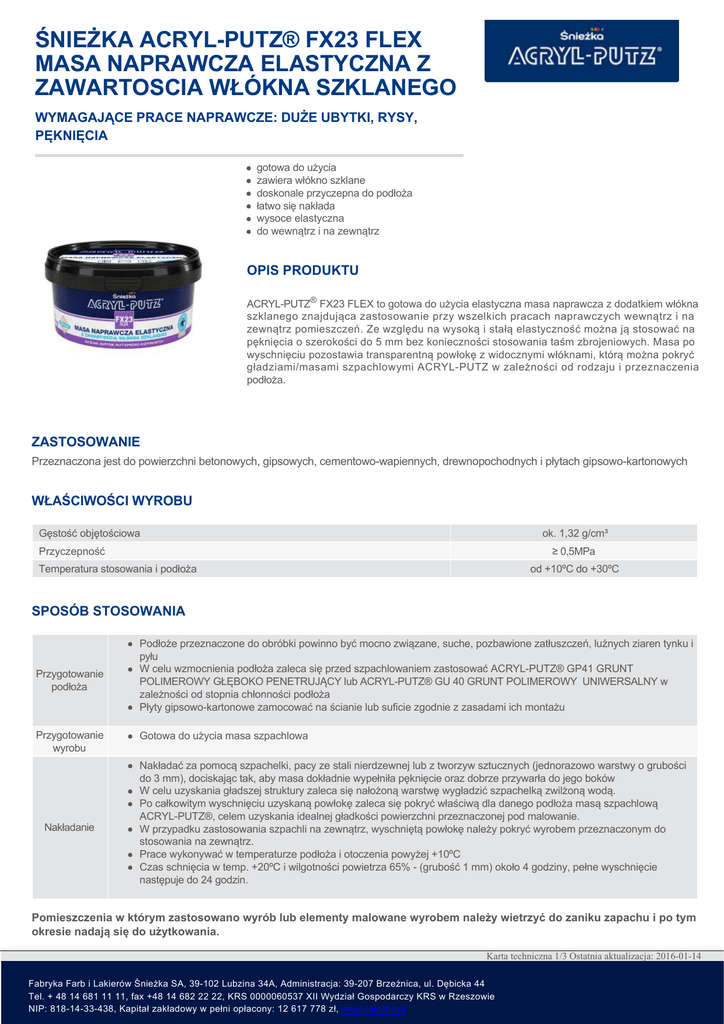 ŚNIEŻKA ACRYLPUTZ® FX23 FLEX MASA NAPRAWCZA ELASTYCZNA Z ZAWARTOSCIA WŁÓKNA SZKLANEGO WYMAGAJĄCE PRACE NAPRAWCZE: DUŻE UBYTKI, RYSY, PĘKNIĘCIA gotowa do użycia zawiera włókno szklane doskonale przyczepna do podłoża łatwo się nakłada wysoce elastyczna do wewnątrz i na zewnątrz OPIS PRODUKTU ACRYL-PUTZ® FX23 FLEX to gotowa do użycia elastyczna masa naprawcza z dodatkiem włókna szklanego znajdująca zastosowanie przy wszelkich pracach naprawczych wewnątrz i na zewnątrz pomieszczeń. Ze względu na wysoką i stałą elastyczność można ją stosować na pęknięcia o szerokości do 5 mm bez konieczności stosowania taśm zbrojeniowych. Masa po wyschnięciu pozostawia transparentną powłokę z widocznymi włóknami, którą można pokryć gładziami/masami szpachlowymi ACRYLPUTZ w zależności od rodzaju i przeznaczenia podłoża. ZASTOSOWANIE Przeznaczona jest do powierzchni betonowych, gipsowych, cementowowapiennych, drewnopochodnych i płytach gipsowokartonowych WŁAŚCIWOŚCI WYROBU Gęstość objętościowa ok. 1,32 g/cm³ Przyczepność ≥ 0,5MPa Temperatura stosowania i podłoża od +10ºC do +30ºC SPOSÓB STOSOWANIA Przygotowanie podłoża Przygotowanie wyrobu Nakładanie Podłoże przeznaczone do obróbki powinno być mocno związane, suche, pozbawione zatłuszczeń, luźnych ziaren tynku i pyłu W celu wzmocnienia podłoża zaleca się przed szpachlowaniem zastosować ACRYLPUTZ® GP41 GRUNT POLIMEROWY GŁĘBOKO PENETRUJĄCY lub ACRYLPUTZ® GU 40 GRUNT POLIMEROWY UNIWERSALNY w zależności od stopnia chłonności podłoża Płyty gipsowokartonowe zamocować na ścianie lub suficie zgodnie z zasadami ich montażu Gotowa do użycia masa szpachlowa Nakładać za pomocą szpachelki, pacy ze stali nierdzewnej lub z tworzyw sztucznych (jednorazowo warstwy o grubości do 3 mm), dociskając tak, aby masa dokładnie wypełniła pęknięcie oraz dobrze przywarła do jego boków W celu uzyskania gładszej struktury zaleca się nałożoną warstwę wygładzić szpachelką zwilżoną wodą. Po całkowitym wyschnięciu uzyskaną powłokę zaleca się pokryć właściwą dla danego podłoża masą szpachlową ACRYLPUTZ®, celem uzyskania idealnej gładkości powierzchni przeznaczonej pod malowanie. W przypadku zastosowania szpachli na zewnątrz, wyschniętą powłokę należy pokryć wyrobem przeznaczonym do stosowania na zewnątrz. Prace wykonywać w temperaturze podłoża i otoczenia powyżej +10ºC Czas schnięcia w temp. +20ºC i wilgotności powietrza 65% (grubość 1 mm) około 4 godziny, pełne wyschnięcie następuje do 24 godzin. Pomieszczenia w którym zastosowano wyrób lub elementy malowane wyrobem należy wietrzyć do zaniku zapachu i po tym okresie nadają się do użytkowania. Karta techniczna 1/3 Ostatnia aktualizacja: 2016-01-14 Fabryka Farb i Lakierów Śnieżka SA, 39102 Lubzina 34A, Administracja: 39207 Brzeźnica, ul. Dębicka 44 Tel. + 48 14 681 11 11, fax +48 14 682 22 22, KRS 0000060537 XII Wydział Gospodarczy KRS w Rzeszowie NIP: 8181433438, Kapitał zakładowy w pełni opłacony: 12 617 778 zł, www.sniezka.pl PARAMETRY MALOWANIA DLA POSZCZEGÓLNYCH METOD PARAMETRY NAKŁADANIA METODY NAKŁADANIA grubość jednej warstwy zalecana ilość warstw zależności od ubytku do 3mm 1 szpachelka metalowa OKRES PRZYDATNOŚCI 12 miesięcy od daty produkcji OPAKOWANIA 0,5kg, 1,4kg WYDAJNOŚĆ Około 1,3kg/m² przy grubości warstwy 1 mm. KOLORYSTYKA transparentna LZO brak NORMY, BADANIA I ATESTY ZN-SN-016:2015 ZN-SN-016:2009 WSKAZÓWKI BHP I PPOŻ BEZPIECZEŃSTWO: Zawiera 4,5-dichloro-2-oktylo-2H-izotiazol-3-on, mieszanina 5-chloro-2-metylo-2H-izotiazol-3-onu [WE 247-500-7] i 2-metyol-2H -izotiazol-3-onu [WE 220-239-6] (3:1), tetrahydro-1,3,4,6-tetrakis(hydroksymetylo)imidazo[4,5-d]imidazol-2,5(1 H, 3H)-dion. Może powodować reakcję alergiczną skóry. Działa szkodliwie na organizmy wodne, powodując długotrwałe skutki. Chronić przed dziećmi. Stosować rękawice ochronne/odzież ochronną/ochronę oczu/ochronę twarzy. W PRZYPADKU KONTAKTU ZE SKÓRĄ: Umyć dużą ilością wody. W przypadku wystąpienia podrażnienia skóry lub wysypki: Zasięgnąć porady/zgłosić się pod opiekę lekarza. Wyprać zanieczyszczoną odzież przed ponownym użyciem. Zawartość/pojemnik usuwać zgodnie z obowiązującymi przepisami. Przechowywać w szczelnie zamkniętych opakowaniach w temperaturze od +5°C do +30°C. Chronić przed mrozem i nasłonecznieniem. UWAGA! Informacje zawarte w karcie technicznej mają na celu zapewnienie optymalnego wykorzystania produktu, jednak nie są podstawą do odpowiedzialności prawnej Producenta, gdyż warunki wykonawstwa pozostają poza jego kontrolą. Wszelka ingerencja w skład produktu jest niedopuszczalna i może w znaczny sposób obniżyć jakość stosowanego materiału. W przypadku połączenia z wyrobami innych Producentów nie ponosimy żadnej odpowiedzialności. Przedstawione powyżej informacje podane zostały w dobrej wierze, według aktualnego stanu wiedzy i doświadczenia praktycznego. Producent zastrzega sobie prawo do zmiany treści w kolejnych edycjach bez wcześniejszego informowania o tym fakcie odbiorców. Karta techniczna 2/3 Ostatnia aktualizacja: 2016-01-14 Fabryka Farb i Lakierów Śnieżka SA, 39102 Lubzina 34A, Administracja: 39207 Brzeźnica, ul. Dębicka 44 Tel. + 48 14 681 11 11, fax +48 14 682 22 22, KRS 0000060537 XII Wydział Gospodarczy KRS w Rzeszowie NIP: 8181433438, Kapitał zakładowy w pełni opłacony: 12 617 778 zł, www.sniezka.pl Karta techniczna 3/3 Ostatnia aktualizacja: 2016-01-14 Fabryka Farb i Lakierów Śnieżka SA, 39102 Lubzina 34A, Administracja: 39207 Brzeźnica, ul. Dębicka 44 Tel. + 48 14 681 11 11, fax +48 14 682 22 22, KRS 0000060537 XII Wydział Gospodarczy KRS w Rzeszowie NIP: 8181433438, Kapitał zakładowy w pełni opłacony: 12 617 778 zł, www.sniezka.pl