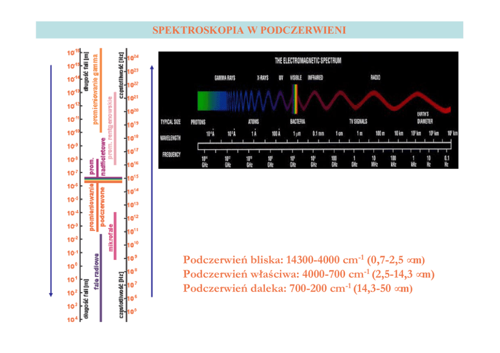 SPEKTROSKOPIA W PODCZERWIENI Podczerwień bliska: 14300-4000 cm-1 (0,7-2,5 µm) Podczerwień właściwa: 4000-700 cm-1 (2,5-14,3 µm) Podczerwień daleka: 700-200 cm-1 (14,3-50 µm) WIELKOŚCI CHARAKTERYZUJĄCE PROMIENIOWANIE ELEKTROMAGNETYCZNE Właściwości falowe Prędkość w próżni Okres drgań Częstotliwość drgań Długość fali Liczba falowa c=3x108 m/s T [s] ν [Hz] λ=c/ν ν= c/λ= cν ν [cm-1] Właściwości korpuskularne Energia promieniowania E= hν Związek między falowym a korpuskularnym opisem promieniowania E=hν= hc/λ h=6.62x10-34 [Js] PODSTAWOWE POJĘCIA • Pomiar spektrometryczny – rejestracja sygnałów detektora, proporcjonalnych do intensywności zjawiska absorpcji – pomiar NMR i EPR • Pomiar spektrofotometryczny – porównanie intensywności wiązki padającej i przechodzącej przez dany układ. W celu opisu tego zjawiska stosuje się dwie wielkości: Absorbancja – A Transmitancja - T Transmitancja – stosunek intensywności promieniowania monochromatycznego po przejściu przez próbkę I do jego intensywności początkowej I0 T = I/I0 Absorbancja – logarytm z odwrotności transmitancji – jest wprost proporcjonalna do ilości cząsteczek absorbujących znajdujących się na drodze promieniowania czyli do stężenia roztworu A = log(1/T) = log(I0/I) Absorbancja jest wielkością addytywną PRAWO LAMBERTA-BEERA Absorbancja jest wprost proporcjonalna do stężenia i grubości warstwy roztworu: A=εcl gdzie: c – stężenie [mol/dm3], l – długość drogi optycznej [cm], ε - molowy współczynnik absorbcji charakterystyczny dla związku i rozpuszczalnika 1 νos = 2π f mr [Hz] m 1 m2 mr = m + m 1 2 Co to są drgania normalne? Drganie normalne jest to jednoczesny ruch wszystkich zrębów atomowych cząsteczki odbywający się z jednakową częstością i w zgodnej fazie ENERGIA OSCYLACJI DROBIN WIELOATOMOWYCH Jądra drobin wieloatomowych wykonują oscylacje zmieniające zarówno długości wiązań, jak kąty między nimi; oscylacje drobiny n - atomowej są równoważne: 3n-5 (drobiny o budowie liniowej) 3n-6 (drobiny o budowie nieliniowej) oscylacjom harmonicznym. DRGANIA NORMALNE CZĄSTECZKI WODY drgania rozciągające symetryczne 3657 cm-1 drgania rozciągające asymetryczne 3756 cm-1 drgania nożycowe 1595 cm-1 DRGANIA NORMALNE GRUPY CH2 ROZCIĄGAJĄCE νas asymetryczne 2920 cm-1 DEFORMACYJNE W PŁASZCZYŹNIE νs δs symetryczne 2850 cm-1 ρ nożycowe wahadłowe scissoring rocking cm-1 1470 DEFORMACYJNE POZA PŁASZCZYZNĄ + ω + + τ - - rozciągające wachlarzowe skręcające wagging twisting 1350-1180 cm-1 1300 cm-1 720 cm-1 REGUŁY WYBORU DLA PRZEJŚĆ W SPEKTROSKOPII IR Fotony promieniowania muszą mieć energię równą różnicy energii wibracyjnych poziomów energetycznych hν=∆E Przejście zachodzi tylko wtedy, gdy kwantowa liczba oscylacji ϑ zmienia się o 1, 2, 3 ... ∆ϑ=+1 ∆ϑ=+1, +2, +3 dla oscylatora harmonicznego dla oscylatora anharmonicznego Przejścia między stanami kwantowymi są widoczne w spektroskopii IR tylko dla takich oscylatorów, w których w czasie drgania zmieni się moment dipolowy molekuły, czyli Cl Cl POŁOŻENIE PASM W IR RODZAJE DRGAŃ W IR GRUPY FUNKCYJNE W IR ABSORPCJA DRGAŃ ROZCIĄGAJĄCYCH WIĄZAŃ POJEDYNCZYCH I WIELOKROTNYCH szkieletowe C=C w związkach aromatycznych wiązanie z „H” np. C-H, O-H, N-H wiązanie „-” np. C-C, C-N C-O, C-X Ar-H poza płaszczyznę wiązanie „≡” np. C≡C, C≡N wiązanie „=” np. C=C, C=N, C=O INTERPRETACJA WIDM IR 1. Na podstawie najbardziej charakterystycznych pasm (co do położenia i kształtu) stawiamy wstępną hipotezę o istnieniu w cząsteczce konkretnych wiązań i grup. 4000-1500 cm-1 – obszar grup funkcyjnych: 4000-2500 cm-1 – drgania walencyjne wiązań O-H, N-H, C-H, S-H 2500-2000 cm-1 – drgania walencyjne układu C=C=C i wiązań potrójnych C≡N i C≡C 2000-1500 cm-1 – drgania walencyjne wiązań podwójnych C=C, C=O, C=N, N=N, drgania deformacyjne wiązań N-H i O-H z wody 1500-650 cm-1 – obszar daktyloskopowy (fingerprint), trudny w interpretacji, drgania walencyjne wiązań C-C, C-N, C-O, drgania deformacyjne C-H 2. Hipotezę tę weryfikujemy, szukając w oparciu o tzw. tablice korelacyjne (opis występowania i charakterystyki poszczególnych pasm drgań walencyjnych i deformacyjnych danego wiązania) wszystkich bądź większości pasm związanych z danym ugrupowaniem. 3. Ważnym jest, by hipotetyczne drgania były potwierdzone co najmniej 2-3 pasmami w widmie, inaczej bowiem prawdopodobieństwo postawionej przez nas hipotezy jest nikłe, wiemy bowiem że wiele częstości grupowych się zazębia bądź wręcz pokrywa. 4. W czasie weryfikacji wstępnej hipotezy zwracamy uwagę nie tylko na położenie pasm mających "uprawdopodobnić" nasze założenia, ale także dużą wagę przywiązujemy do kształtu tych pasma. Chodzi tu zarówno o natężenie jak i szerokość pasma. Pasma widm IR są bowiem bardzo czułe na różnego typu oddziaływania międzycząsteczkowe, w szczególności na wiązania wodorowe. deformacyjne OH rozciągające C-O deformacyjne OH rozciągające O-H rozciągające C-H aldehyd keton kwas karboksylowy ester rozciągające C-H rozciągające C-O 1100-1300 cm-1 rozciągające C-H (Ar) rozciągające O=C-H rozciągające C-H (Alif.) C=C (Ar) podstawienie mono w pierścieniu aromatycznym 1. CH3(CH2)10CH3 2. CH2=CH-(CH2)9CH3 3. CH2 H3C C CH CH2 4. CH≡C-(CH2)4CH3 5. CH3 CH3 6. OH H2C 7. O H3C C CH3 8. O H C CH2 6 CH3 9. O HO C CH2 4 10. O C O CH3 CH3 11. O C NH2 12. CH3 H2N CH2 CH CH2 CH2 CH2 NH2 13. NO 2 14. H H3C C C N ZWIĄZEK 1 w CCl4 film ZWIĄZEK 2 w CCl4 film