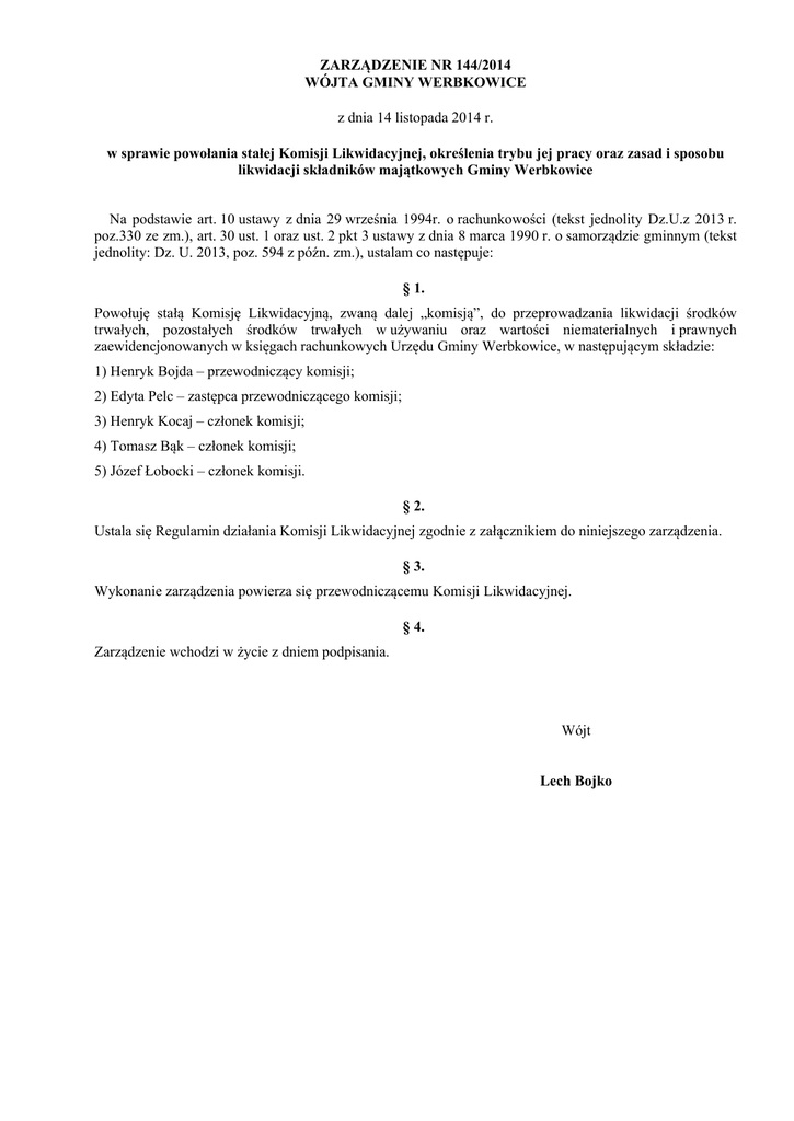 ZARZĄDZENIE NR 144/2014 WÓJTA GMINY WERBKOWICE z dnia 14 listopada 2014 r. w sprawie powołania stałej Komisji Likwidacyjnej, określenia trybu jej pracy oraz zasad i sposobu likwidacji składników majątkowych Gminy Werbkowice Na podstawie art. 10 ustawy z dnia 29 września 1994r. o rachunkowości (tekst jednolity Dz.U.z 2013 r. poz.330 ze zm.), art. 30 ust. 1 oraz ust. 2 pkt 3 ustawy z dnia 8 marca 1990 r. o samorządzie gminnym (tekst jednolity: Dz. U. 2013, poz. 594 z późn. zm.), ustalam co następuje: § 1. Powołuję stałą Komisję Likwidacyjną, zwaną dalej „komisją”, do przeprowadzania likwidacji środków trwałych, pozostałych środków trwałych w używaniu oraz wartości niematerialnych i prawnych zaewidencjonowanych w księgach rachunkowych Urzędu Gminy Werbkowice, w następującym składzie: 1) Henryk Bojda – przewodniczący komisji; 2) Edyta Pelc – zastępca przewodniczącego komisji; 3) Henryk Kocaj – członek komisji; 4) Tomasz Bąk – członek komisji; 5) Józef Łobocki – członek komisji. § 2. Ustala się Regulamin działania Komisji Likwidacyjnej zgodnie z załącznikiem do niniejszego zarządzenia. § 3. Wykonanie zarządzenia powierza się przewodniczącemu Komisji Likwidacyjnej. § 4. Zarządzenie wchodzi w życie z dniem podpisania. Wójt Lech Bojko Załącznik do Zarządzenia Nr 144/2014 Wójta Gminy Werbkowice z dnia 14 listopada 2014r. Regulamin działania Komisji Likwidacyjnej §1 1. Komisja dokonuje czynności likwidacyjnych majątku znajdującego się na stanie ewidencyjnym Urzędu Gminy Werbkowice. 2. Komisja wykonuje powierzone jej zadania w składzie co najmniej trzyosobowym, przy czym w pracach Komisji obowiązkowo uczestniczy przewodniczący Komisji lub zastępca Przewodniczącego Komisji. 3. W celu sprawnego przeprowadzenia likwidacji, komisja może korzystać z pomocy pracowników gospodarczych i obsługi zatrudnionych w Urzędzie Gminy Werbkowice. §2 1. Zgłoszenie braku przydatności gospodarczej poszczególnych rzeczowych składników majątku (środków trwałych, wyposażenia, wartości niematerialnych i prawnych) następuje poprzez pisemne złożenie wniosku do Sekretarza Gminy przez Wnioskodawcę. Wzór wniosku stanowi załącznik nr 1 do regulaminu. 2. Do wniosku dołącza się dokumentację techniczną, ekspertyzy, opinie – umożliwiające ocenę przydatności rzeczowych składników majątku do ewentualnego dalszego użytkowania. W przypadku, kiedy opłata za wykonanie powyższej dokumentacji przekracza wartość ocenianego składnika majątku, dokumentacja nie jest wymagana. 3. Do sprzętu komputerowego przeznaczonego do likwidacji wymagana jest opinia niezależnego eksperta spoza Urzędu. 4. Sprzęt zbędny do czasu zagospodarowania lub fizycznej likwidacji przechowuje się w Urzędzie Gminy. §3 1. Przewodniczący Komisji po otrzymaniu wniosku od Sekretarza Gminy wraz z niezbędną dokumentacją ustala termin i miejsce posiedzenia Komisji. 2. Do zakresu zadań Komisji należy: 1) analiza dostarczonej dokumentacji w celu oceny przydatności składnika do dalszego użytkowania, a w razie konieczności oględziny proponowanego do likwidacji składnika majątkowego, zużytego lub zbędnego; 2) zbadanie, czy zgłoszone do likwidacji rzeczowe składniki majątku były użytkowane zgodnie z ich przeznaczeniem, właściwie konserwowane, zabezpieczone przed zniszczeniem, zepsuciem itp.; 3) ustalenie sposobu likwidacji zgłoszonych do wycofania z dalszego użytkowania rzeczowych składników poprzez: zgniecenie, spalenie, złomowanie, sprzedanie; 4) dokonanie fizycznej likwidacji zużytych składników majątkowych, stanowiących własność Urzędu Gminy Werbkowice; 5) sporządzenie protokołu likwidacyjnego z przeprowadzonej likwidacji, którego wzór stanowi załącznik nr 2 do niniejszego regulaminu; 6) wypełnienie druku „Likwidacja środka trwałego” LT, którego wzór stanowi załącznik nr 3 do niniejszego regulaminu. §4 1. Na podstawie oględzin i dokumentów Komisja sporządza protokół likwidacyjny zgodnie z załącznikiem nr 2 do regulaminu. Do protokołu dołącza się wszystkie niezbędne dokumenty. 2. Dowód „LT” oraz protokół likwidacyjny wystawia się w trzech egzemplarzach, jeden komplet dla Referatu Finansowego, drugi dla wnioskującego o likwidację, trzeci dla Komisji. Protokół likwidacyjny podpisują członkowie Komisji. 3. Protokół wraz z dowodem „LT” przekazywany jest Wójtowi Gminy, w celu akceptacji likwidacji rzeczowego składnika majątkowego. 4. Po zatwierdzeniu przez Wójta Gminy, protokół likwidacyjny wraz z dołączonym dowodem „LT” jest przekazywany do Referatu Finansowego, w celu wyksięgowania danego składnika majątku z ewidencji księgowej i wycofania z użytkowania. §5 1. Fizycznej likwidacji zużytych składników majątku dokonuje się w trybie sprzedaży na surowce wtórne albo poprzez zniszczenie, zgodnie ze sposobem określonym w protokole likwidacyjnym. 2. Fizycznej likwidacji składników majątku dokonuje Komisja w obecności pracownika odpowiedzialnego. 3. Pracownik prowadzący ewidencję analityczną, którą objęty jest likwidowany przedmiot pozbawia sprzęt numerów inwentarzowych po przeprowadzonej kasacji. 4. Dowodem dokonania fizycznej likwidacji składników majątkowych jest Protokół fizycznej likwidacji składników majątkowych, sporządzony przez Komisję Likwidacyjną zgodnie z załącznikiem nr 4 do regulaminu. 4. W przypadku gdy przedmiotem fizycznej likwidacji jest sprzęt komputerowy, urządzenia, aparatura, baterie, akumulatory, które podlegają utylizacji zgodnie z odrębnymi przepisami Komisja udziela zlecenia specjalistycznemu podmiotowi, celem dokonania utylizacji. Dokumentacja dotycząca przyjęcia do utylizacji stanowi załącznik do protokołu likwidacyjnego. 5. Dowodem utylizacji zużytego sprzętu elektronicznego może być również zaświadczenie wystawione przez sklep, któremu zużyty sprzęt przekazano przy zak