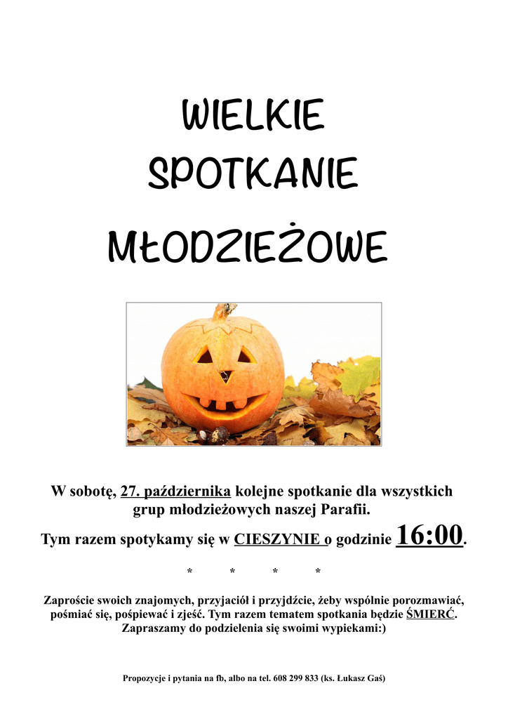 WIELKIE SPOTKANIE MŁODZIEŻOWE W sobotę, 27. października kolejne spotkanie dla wszystkich grup młodzieżowych naszej Parafii. Tym razem spotykamy się w CIESZYNIE o godzinie * * * 16:00. * Zaproście swoich znajomych, przyjaciół i przyjdźcie, żeby wspólnie porozmawiać, pośmiać się, pośpiewać i zjeść. Tym razem tematem spotkania będzie ŚMIERĆ. Zapraszamy do podzielenia się swoimi wypiekami:) Propozycje i pytania na fb, albo na tel. 608 299 833 (ks. Łukasz Gaś)