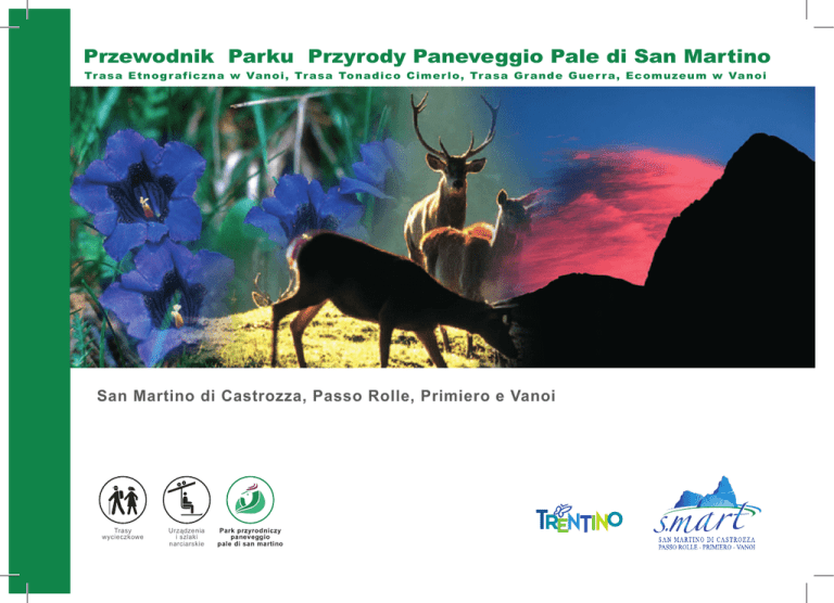 Przewodnik Parku Przyrody Paneveggio Pale di San Martino Tr a s a E t n o g r a f i c z n a w Va n o i , Tr a s a To n a d i c o C i m e r l o , Tr a s a G r a n d e G u e r r a , E c o m u z e u m w Va n o i San Martino di Castrozza, Passo Rolle, Primiero e Vanoi Trasy wycieczkowe Urządzenia i szlaki narciarskie Park przyrodniczy paneveggio pale di san martino Przewodnik Par ku Przyr ody Paneve ggio Pale di San Mar tino Cechy ogólne Park Przyrody Paneveggio Pale w San Martino jest położony na terenie górskim, na powierzchni 20.000 hektarów . Na jego obszarze można podziwiać różowe ściany Dolomitów i kontrastujące z nimi ciemne głazy rozjaśnione przez niewielkie jeziora pochodzenia polodowcowego w Lagorai i na Cima Bocche. Poniżej rozmieszczone pasmo zielonych lasów i łąk wysokogórskich wzbogacają ten przepiękny krajobraz. Val Venegia Trudne do przebycia doliny, wąwozy wyżłobione przez strumienie , surowe i kamieniste płaskowyże i lodowce, łagodne pastwiska alpejskie i kwieciste łąki współżyją z przeźroczystymi taflami wodnymi i sugestywnymi wiekowymi lasami. Jest tu wiele świadectw obecności człowieka z czasów antycznych i jego fascynującej histori, szlaki, urocze zakątki oraz małe interesujące muzea. Jesień w Val Canali s t r. 2 Park powstał w 1967 i od tego czasu stale się rozwija, przyczynia się do tego zwiększenie przychylnej opini ze stony coraz liczniejszej liczby osób które przybywają aby go zwiedzić. Usytuowany we wschodniej części Provincia di Trento, jest on podzielony na trzy strefy geograficzne a w każdej z nich dominuje inny kraobraz. Od północy porośnięty przez Bór w Paneveggio, słynny z powodu obecności chronionej jodły . Strona południowowschodnia obejmuje część pasma Pale di San Martino, a zachodnia porfirowe pasmo Lagorai. Przewodnik Par ku Przyr ody Paneve ggio Pale di San Mar tino La Pala di San Martino widziana z Płaskowyżu s t r. 3 Przewodnik Par ku Przyr ody Paneve ggio Pale di San Mar tino Ośrodki dla osób zwiedzających park Umożliwiają one wstępne zapoznanie się z parkiem. Każdy z tych Ośrodków to małe muzeum w którym można zasięgnąć informacji odnośnie organizowanych inicjatyw, nabyć publikacje i poznać lepiej te specyficzne zagadnienia. Villa Welsperg Punto Info San Martino di Castrozza 1. Villa Welsperg, usytuowana zaraz za ujściem z doliny Val Canali w niewielkiej odległości od jeziora o tej samej nazwie.Od 1996 roku jest siedzibą Parku. W miejscowości tej znajduje się nowoczesny ośrodek dla zwiedzających, w jednej z sal można podziwiać mapę plastyczną parku, salę video oraz salę w której można poznać historię dynasti Książąt Welsperg (swego czasu właścicieli tego budynku), salę z akwarium oraz tą ze zbiorem eksponatów naturalnych z tego terenu (eksponaty z drewna, drzeworyty, krzewy i głazy). Bogata Biblioteka imienia Dino Buzzati, pozwala osobom zwiedzającym poznanie i poszerzenie ich wiedzy o górach. 2. Punkt Info Parco w San Martino di Castrozza, mały, pełen wdzięku i ciekawych informacji. Pozwala na lepsze poznanie natury i wpływu jaki ma na nią klimat, geologii, paleontologii oraz chronionego środowiska typowego na tej wysokości. Ciekawostką tego Ośrodka jest mały park oraz jezioro w którym można obserwować roślinność podwodną, ogródek skalny oraz lokalne odkrycia archeologiczne. 3. Ośrodek Terra Foresta di Paneveggio odnowiony niedawno w niewielkiej odległości od jeziora Forte Buso, wzdłuż drogi nr.50 z Predazzo Passo s t r. 4 Przewodnik Par ku Przyr ody Paneve ggio Pale di San Mar tino Ośrodki dla osób zwiedzających park Rolle. Można tu poznać wielkie lasy świerkowe, znane jako Lasy Skrzypców ze względu na jakość i rezonans drzewa poszukiwanego przez lutników do wytwarzania akustycznego pudła instrumentów muzycznych. Interesująca wystawa przedstawia zwierzęta żyjące w tych lasach takie jak głuszec czy jeleń a w niewielkiej odległości na ogrodzonym terenie można osoboście podziwiać te wspaniałe okazy. Bezpośrednio z ośrodka dla zwiedzających zaczyna się szlak na łonie natury z wytyczonymi i zilustrowanymi punktami obserwacji. Ośrodek dla zwiedzających w Paneveggio Wschód słońca w górach Parku s t r. 5 Przewodnik Par ku Przyr ody Paneve ggio Pale di San Mar tino Trasy tematyczne w Parku Trasa Etnograficzna w Vanoi Turyści na Trasie Etnograficznej w Vanoi Muzeum na świeżym powietrzu, to syntetyczny opis Trasy Etnograficznej w Vanoi. Trasa rozciąga się od miejscowości Caorìa, na wysokości 845 m. i Malga Miesnott di sopra, położona tysiąc metrów wyżej. Trasa ta została nazwana podróżą w czasie i przestrzeni, ponieważ pozwala mieszkańcom powrócić do zapomnianej przeszłości, a gościom poznanie historii tej ziemi oraz zmian jakie zaszły pod wpływem czynników ekonomicznych i socjalnych. Na trasie zostały zaznaczone cztery typy krajobrazu: la Val, i Pradi, il Bosc e la Montagna, wytyczone na podstawie badań etnograficznych, historycznych i socjalnych. Trasa Etnograficzna to jedna z propozycji Ecomuzeum w Vanoi. Wzdłuż tras i miejsc, które można zwiedzać od lipca do września, są przedstawione trzy spośród siedmiu tematów poruszanych przez Ecomuzeum: drewno , trawa i zmienność. Pozostałe cztery przedstawione w innych ośrodkach Ecomuzeum, wdłuż Doliny Vanoi, są to świętość, woda, kamień i wojny (patrz str. 20). Trasa historyczno kulturalna z Tonadico do Cimerlo na drodze historii Ruiny Castel Pietra s t r. 6 To nie tylko przechadzka po Parku to również propozycja poznania tego terenu i jego historii. Specyficzne oznakowanie ma na celu pogłębienie bezpośredniego kontaktu osób z terenem, zaciekawienia i zachęcenia do lektury i refleksji. Realizowana trasa jest podzielona na odcinki, zaczyna się w miejscowości Tonadico i prowadzi przez Przewodnik Par ku Przyr ody Paneve ggio Pale di San Mar tino Trasy tematyczne w Parku sugestywną do