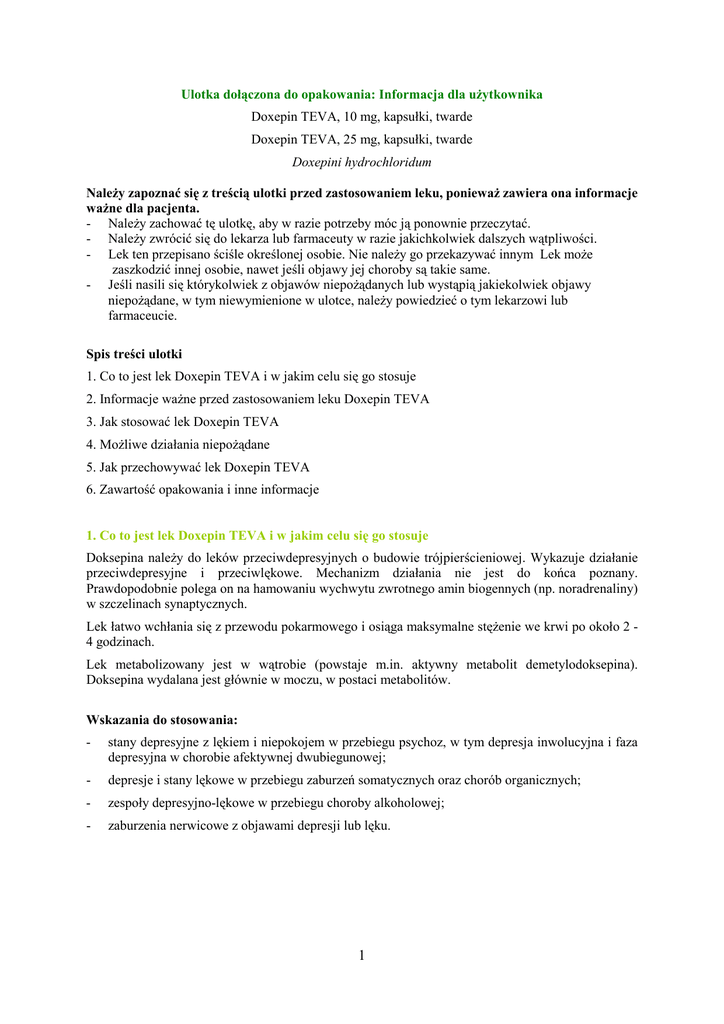 Ulotka dołączona do opakowania: Informacja dla uŜytkownika Doxepin TEVA, 10 mg, kapsułki, twarde Doxepin TEVA, 25 mg, kapsułki, twarde Doxepini hydrochloridum NaleŜy zapoznać się z treścią ulotki przed zastosowaniem leku, poniewaŜ zawiera ona informacje waŜne dla pacjenta. - NaleŜy zachować tę ulotkę, aby w razie potrzeby móc ją ponownie przeczytać. - NaleŜy zwrócić się do lekarza lub farmaceuty w razie jakichkolwiek dalszych wątpliwości. - Lek ten przepisano ściśle określonej osobie. Nie naleŜy go przekazywać innym Lek moŜe zaszkodzić innej osobie, nawet jeśli objawy jej choroby są takie same. - Jeśli nasili się którykolwiek z objawów niepoŜądanych lub wystąpią jakiekolwiek objawy niepoŜądane, w tym niewymienione w ulotce, naleŜy powiedzieć o tym lekarzowi lub farmaceucie. Spis treści ulotki 1. Co to jest lek Doxepin TEVA i w jakim celu się go stosuje 2. Informacje waŜne przed zastosowaniem leku Doxepin TEVA 3. Jak stosować lek Doxepin TEVA 4. MoŜliwe działania niepoŜądane 5. Jak przechowywać lek Doxepin TEVA 6. Zawartość opakowania i inne informacje 1. Co to jest lek Doxepin TEVA i w jakim celu się go stosuje Doksepina naleŜy do leków przeciwdepresyjnych o budowie trójpierścieniowej. Wykazuje działanie przeciwdepresyjne i przeciwlękowe. Mechanizm działania nie jest do końca poznany. Prawdopodobnie polega on na hamowaniu wychwytu zwrotnego amin biogennych (np. noradrenaliny) w szczelinach synaptycznych. Lek łatwo wchłania się z przewodu pokarmowego i osiąga maksymalne stęŜenie we krwi po około 2 4 godzinach. Lek metabolizowany jest w wątrobie (powstaje m.in. aktywny metabolit demetylodoksepina). Doksepina wydalana jest głównie w moczu, w postaci metabolitów. Wskazania do stosowania: - stany depresyjne z lękiem i niepokojem w przebiegu psychoz, w tym depresja inwolucyjna i faza depresyjna w chorobie afektywnej dwubiegunowej; - depresje i stany lękowe w przebiegu zaburzeń somatycznych oraz chorób organicznych; - zespoły depresyjno-lękowe w przebiegu choroby alkoholowej; - zaburzenia nerwicowe z objawami depresji lub lęku. 1 2. Informacje waŜne przed zastosowaniem leku Doxepin TEVA Kiedy nie stosować leku Doxepin TEVA Jeśli u pacjenta występują: - nadwraŜliwość na trójpierścieniowe leki przeciwdepresyjne, doksepinę lub którykolwiek składnik leku Doxepin TEVA; - mania; - cięŜkie choroby wątroby; - pacjentka karmi piersią; - jaskra; - skłonność do zatrzymania moczu; - stosowanie inhibitorów MAO jednocześnie lub w ciągu ostatnich 2 tygodni. Kiedy zachować szczególną ostroŜność stosując lek Doxepin TEVA Lekarz zastosuje schemat dawkowania jeden raz na dobę z ostroŜnością u pacjentów ze współistniejącymi chorobami, takŜe u pacjentów zaŜywających inne leki. Jest to szczególnie waŜne w przypadku stosowania leków o działaniu przeciwcholinergicznym. Schemat ten będzie dostosowany ostroŜnie równieŜ u pacjentów w podeszłym wieku, w zaleŜności od stanu klinicznego. Pacjenci tacy są szczególnie podatni na wystąpienie działań niepoŜądanych, takich jak: pobudzenie, splątanie (dezorientacja), niedociśnienie ortostatyczne (występujące przy nagłej zmianie pozycji z leŜącej lub siedzącej na stojącą). Dawkę początkową lekarz ustali ostroŜnie, pod ścisłą kontrolą reakcji pacjenta. Zastosowanie połowy dawki podtrzymującej moŜe wystarczyć dla osiągnięcia właściwej reakcji klinicznej. Podczas leczenia lekiem Doxepin TEVA moŜe wystąpić senność oraz nasilenie reakcji na alkohol. W przypadku nasilenia się objawów psychozy lub wystąpienia objawów manii, naleŜy natychmiast skontaktować się z lekarzem, który moŜe zadecydować o zmniejszeniu dawki leku Doxepin TEVA lub o zastosowaniu dodatkowego leku. ChociaŜ ze stosowaniem doksepiny wiąŜe się mniejsze ryzyko wpływu na układ krąŜenia w porównaniu z innymi trójpierścieniowymi lekami przeciwdepresyjnymi, wymagane jest zachowanie ostroŜności w przypadku pacjentów z cięŜkimi zaburzeniami sercowo-naczyniowymi (blok serca, arytmia, świeŜy zawał mięśnia sercowego). Lek Doxepin TEVA naleŜy ostroŜnie stosować u pacjentów z zaburzeniami czynności wątroby i (lub) nerek. Konieczne jest zachowanie ostroŜności w przypadku pacjentów z napadami padaczkowymi w przeszłości. U pacjentów z łagodnym rozrostem gruczołu krokowego moŜe zwiększyć się skłonność do zatrzymania moczu Inne leki i lek Doxepin TEVA Doksepina, podobnie jak inne trójpierścieniowe leki przeciwdepresyjne metabolizowana jest w wątrobie przez układ cytochromu P-450 (izoenzym CYP 2D6). Inhibitory lub substraty CYP2D6 (np. chinidyna, selektywne inhibitory wychwytu zwrotnego serotoniny) podane jednocześnie, mogą zwiększać stęŜenie trójpierścieniowych leków przeciwdepresyjnych we krwi. Podczas jednoczesnego stosowania z innymi lekami przeciwdepresyjnymi, alkoholem, lekami przeciwlękowymi naleŜy wziąć pod uwagę moŜliwość nasilenia działania farmakologicznego. Wiadomo, Ŝe inhibitory monoaminooksydazy mogą potęgować działanie innych leków i nasilać ich 2 reakcje niepoŜądane, dlatego doksepina nie moŜe być podawana jednocześnie, ani w ciągu 2 tygodni od zaprzestania stosowania inhibitorów MAO. Cymetydyna powoduje znaczące wahania stęŜenia stacjonarnego doksepiny we krwi. Doksepiny nie naleŜy podawać w skojarzeniu z lekami sympatykomimetycznymi, takimi jak efedryna, izoprenalina, noradrenalina, fenylefryna, fenylopropanolamina. Leki znieczulające ogólnie i miejscowo (zawierające sympatykomimetyki) podawane podczas terapii trójpierścieniowymi lekami przeciwdepresyjnymi zwiększają ryzyko arytmii i niedociśnienia lub nadciśnienia. JeŜeli zabieg chirurgiczny jest konieczny, lekarz anestezjolog musi być poinformowany, Ŝe pacjent jest obecnie leczony przeciwdepresyjnie. Doksepina moŜe osłabiać działanie leków przeciwnadciśnieniowych, takich jak debryzochina
