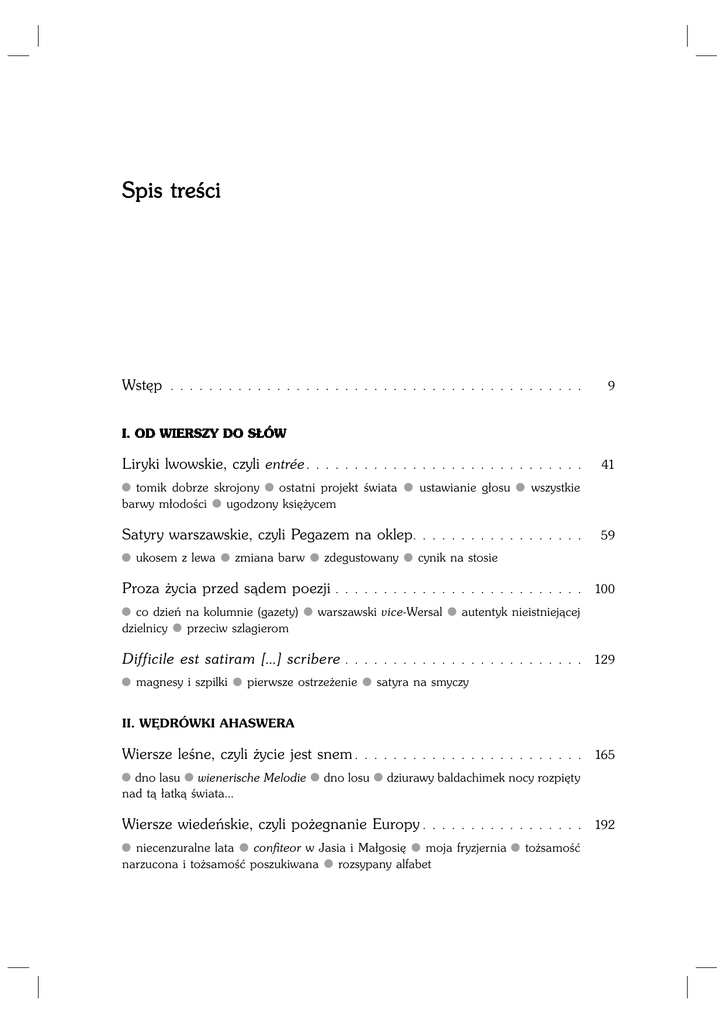 Spis treści Wstęp . . . . . . . . . . . . . . . . . . . . . . . . . . . . . . . . . . . . . . . . . . . 9 I. OD WIERSZY DO SŁÓW Liryki lwowskie, czyli entrée . . . . . . . . . . . . . . . . . . . . . . . . . . . . . tomik dobrze skrojony ostatni projekt świata barwy młodości ugodzony księżycem ustawianie głosu wszystkie Satyry warszawskie, czyli Pegazem na oklep. . . . . . . . . . . . . . . . . . ukosem z lewa zmiana barw zdegustowany 41 59 cynik na stosie Proza życia przed sądem poezji . . . . . . . . . . . . . . . . . . . . . . . . . . 100 co dzień na kolumnie (gazety) dzielnicy przeciw szlagierom warszawski vice-Wersal autentyk nieistniejącej Difficile est satiram […] scribere . . . . . . . . . . . . . . . . . . . . . . . . . 129 magnesy i szpilki pierwsze ostrzeżenie satyra na smyczy II. WĘDRÓWKI AHASWERA Wiersze leśne, czyli życie jest snem . . . . . . . . . . . . . . . . . . . . . . . . 165 dno lasu wienerische Melodie nad tą łatką świata… dno losu dziurawy baldachimek nocy rozpięty Wiersze wiedeńskie, czyli pożegnanie Europy . . . . . . . . . . . . . . . . . 192 niecenzuralne lata confiteor w Jasia i Małgosię moja fryzjernia narzucona i tożsamość poszukiwana rozsypany alfabet tożsamość Wiersze jerozolimskie. Gwiazdy mnie oszukały . . . . . . . . . . . . . . . . 246 zwój, zwitek depresja Martwego Morza poezja imienia / imię poezji kraj-kamień spojrzenie w głąb długi, załamujący się ciemny korytarz pamięci Chila, śpiew pod wodami czuję już w nogach skurcz Ahaswera język ryby Ostatnia dekada. Listki z drzewa poznania. . . . . . . . . . . . . . . . . . . 313 kpię, ale pytam sprawdzian z mimikry ile lądu mi starczy? Riesenrad rymy dziecięce sny, marzenia, wspomnienia streszczajmy się zdanie z tytułem lapidarium, żwir pogoń za ecce homo 22 czterowiersze i jeden poznanie dzienne, poznanie nocne III. OD SŁÓW DO MYŚLI 1. 2. 3. 4. 5. 6. 7. 8. 9. 10. 11. 12. 13. 14. 15. Tajemnica początku Myśli nieuczesanych . . . Praforma . . . . . . . . . . . . . . . . . . . . . Poetyka dwoistości . . . . . . . . . . . . . . . Lektura wśród drzew . . . . . . . . . . . . . . Aforyzm między Październikiem a Marcem . . Rozwiązałem prastarą krzyżówkę (uniwersalia) Epoka Wielkiego Retuszu (PRL) . . . . . . . . Znak zapytania herbem wolności. . . . . . . . Wskazówki dla poszukiwaczy prawdy . . . . . Nie-książka . . . . . . . . . . . . . . . . . . . . Moce i przemoce umysłu . . . . . . . . . . . . Myślę, że jestem . . . . . . . . . . . . . . . . . Kabalista przy kawie . . . . . . . . . . . . . . Rozbiórkowa cegła wieży Babel . . . . . . . . Akrobata śmiechu i łez . . . . . . . . . . . . . . . . . . . . . . . . . . . . . . . . . . . . . . . . . . . . . . . . . . . . . . . . . . . . . . . . . . . . . . . . . . . . . . . . . . . . . . . . . . . . . . . . . . . . . . . . . . . . . . . . . . . . . . . . . . . . . . . . . . . . . . . . . . . . . . . . . . . . . . . . . . . . . . . . . . . . . . . . . . . . . . . . . . . . . . . . . . . . . . . . . . . . . . . . . . . . . . . . . . . . . . . . . . . . . . . . . . . . . . . . . . . . . . . . . . . . . . . . . . . . . . . . . . . . . . . . . . . . . . . . . . . . . . . . . . . . . . . . . . . . . . . . . . 417 432 440 447 465 504 520 534 550 562 595 615 635 673 709 Zakończenie . . . . . . . . . . . . . . . . . . . . . . . . . . . . . . . . . . . . . . . . 741 Bibliografia . . . . . . . . . . . . . . . . . . . . . . . . . . . . . . . . . . . . . . . . . 744 Indeks osób . . . . . . . . . . . . . . . . . . . . . . . . . . . . . . . . . . . . . . . . . 758 Indeks rzeczowy . . . . . . . . . . . . . . . . . . . . . . . . . . . . . . . . . . . . . . 770