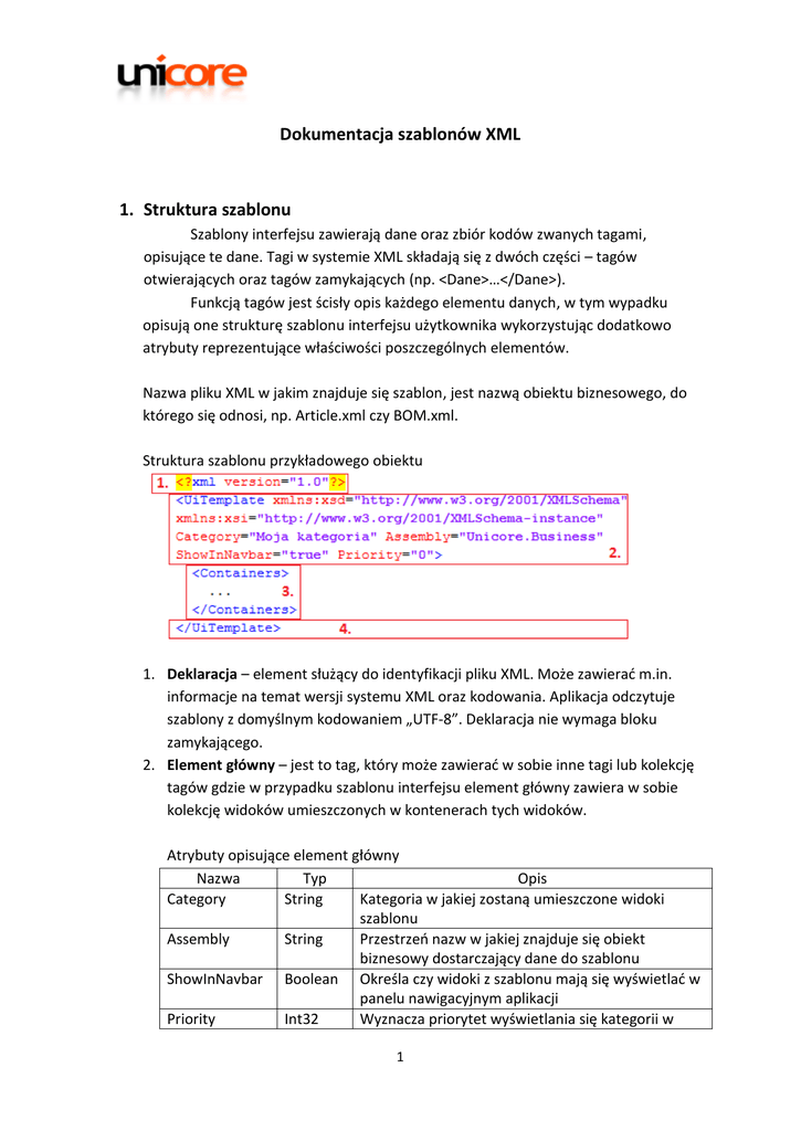 Dokumentacja szablonów XML 1. Struktura szablonu Szablony interfejsu zawierają dane oraz zbiór kodów zwanych tagami, opisujące te dane. Tagi w systemie XML składają się z dwóch części – tagów otwierających oraz tagów zamykających (np. <Dane>…</Dane>). Funkcją tagów jest ścisły opis każdego elementu danych, w tym wypadku opisują one strukturę szablonu interfejsu użytkownika wykorzystując dodatkowo atrybuty reprezentujące właściwości poszczególnych elementów. Nazwa pliku XML w jakim znajduje się szablon, jest nazwą obiektu biznesowego, do którego się odnosi, np. Article.xml czy BOM.xml. Struktura szablonu przykładowego obiektu 1. Deklaracja – element służący do identyfikacji pliku XML. Może zawierać m.in. informacje na temat wersji systemu XML oraz kodowania. Aplikacja odczytuje szablony z domyślnym kodowaniem „UTF-8”. Deklaracja nie wymaga bloku zamykającego. 2. Element główny – jest to tag, który może zawierać w sobie inne tagi lub kolekcję tagów gdzie w przypadku szablonu interfejsu element główny zawiera w sobie kolekcję widoków umieszczonych w kontenerach tych widoków. Atrybuty opisujące element główny Nazwa Typ Opis Category String Kategoria w jakiej zostaną umieszczone widoki szablonu Assembly String Przestrzeń nazw w jakiej znajduje się obiekt biznesowy dostarczający dane do szablonu ShowInNavbar Boolean Określa czy widoki z szablonu mają się wyświetlać w panelu nawigacyjnym aplikacji Priority Int32 Wyznacza priorytet wyświetlania się kategorii w 1 panelu nawigacyjnym aplikacji. 3. Zbiór widoków – kolekcja widoków, które wchodzą w skład szablonu 4. Blok zamykający element główny – koniec definicji szablonu interfejsu. 2. Widoki Widoki umieszcza się pomiędzy tagami <Containers>…</Containers> w elemencie głównym szablonu (UiTemplate). Przykład kontenera widoku: Opis poszczególnych atrybutów Nazwa Typ Name String ContainerType Enum Text String RootMenu ShowInNavbar Boolean AllowPreFilter Boolean Priority Int32 View String Opis Jest nazwą dla kontenera widoku. Musi być unikalna. Określa typ widoku jaki będzie reprezentował dany kontener (poniżej opis) Etykieta widoku wyświetlana w panelu nawigacyjnym aplikacji (dla kontenera typu „Form” oznaczać będzie tytuł okna a dla kontenera typu „Menu” etykietę pozycji w menu określanym przez atrybut „RootMenu”) Dla kontenera typu „Menu” określa etykietę menu nadrzędnego w jakiej ma się znaleźć Określa czy widok ma być widoczny w panelu nawigacyjnym aplikacji (nie dotyczy kontenera typu „Form” i „Menu”) Określa czy dla danego widoku będzie można definiować filtry bazodanowe redukujące ilość dostarczanych danych (dotyczy tylko kontenerów typu „List”, „Pivot” oraz „Scheduler”) Wyznacza kolejność w jakiej ma zostać wyświetlony widok w panelu nawigacyjnym aplikacji (nie dotyczy kontenerów typu „Form” i „Menu”) Dla kontenera typu „Menu” określa nazwę (atrybut „Name”) kontenera jaki ma zostać 2 Category String wyświetlony Kategoria w jakiej znajdzie się widok w panelu nawigacyjnym aplikacji Typy widoków „List” – widok tabeli. Przykład widoku tabeli: Kontener repezentujący widok tabularyczny składa się z jednego elementu o typie „UiDataGrid” umieszczonego w bloku „<Items>”, w którego skład wchodzą kontrolki przeznaczone do interakcji z użytkownikiem. Dokładny opis kontrolki „UiDataGrid” znajduje się w dziale „Kontrolki”. Ten typ widoku wywołać można z pozycji w panelu nawigacyjnym aplikacji gdzie etykietę określa atrybut „Text”, kolejność na liście atrybut „Priority” a kategorię w jakiej docelowo ma się znaleźć „Category”. Widok stosuje się do reprezentacji danych w tabeli umieszczonej w głównej części aplikacji. „Pivot” – widok tabeli przestawnej Przykład widoku tabeli przestawnej 3 Widok tabeli przestawnej jest skonstruowany dokładnie w taki sam sposób jak widok tabeli z ta różnicą, że typem kontenera jest „Pivot”, a elementem umieszczonym w bloku „Items” jest „UiPivotGrid”, którego dokładny opis znajduje się w dziale „Kontrolki”. Zastosowaniem tego widoku jest tworzenie zestawień danych. „Scheduler” – widok kalendarza Przykład widoku kalendarza Widok kalendarza daje możliwość przedstawienia w przejrzysty sposób zdarzeń na osi czasu z uwzględnieniem zasobów oraz różnych reprezentacji widoków czasu. Dokładny opis kontrolki „UiScheduler” znajduje się w dziale „Kontrolki”. „Form” – widok okna 4 Widok okna różni się od pozostałych widoków, ponieważ w bloku „Items” nie znajdują się kontrolki tylko kontenery typu „UiPanel” kategoryzujące kontrolki, które się w nich znajdują. Panele reprezentują zakładki w oknie. Ten typ widoku nie jest umieszczany w panelu nawigacyjnym. Wywołuje się go np. klikając w pozycję tabeli w widoku „List”. Okno reprezentuje właściwości konkretnego obiektu biznesowego. UiPanel – kontener będący reprezentacją zakładki w oknie oraz pojemnik na kontrolki. Jedna z jego cech jest możliwość stworzenia siatki, na której będą umieszczone kontrolki się w nim znajdujące. Siatkę definiuje się za pomocą tagów „<ColumnDefinitoin>” oraz „<RowDefinitions>”. Każda pozycja znajdująca się w tych blokach reprezentuje kolumnę lub wiersz na siatce. Dodatkowo panel posiada możliwość przewijania zawartości jeżeli jeśli kontrolek jest zbyt dużo, służy do tego atrybut „Scrollable”, który przyjmuje wartości logiczne (np. Scrollable=”true”) Przykład panelu znajdującego się bloku „Items” kontenera okna ColumnDefinitions – kolekcja definicji kolumn. Jako elementy przyjmuje tagi „ColumnDefinition”, które mają jeden atrybut „Width”. Atrybut „Width” przyjmuje następujące wartości: „*” – dopasuj do siatki (rozciągnięcie kolumny tak aby po