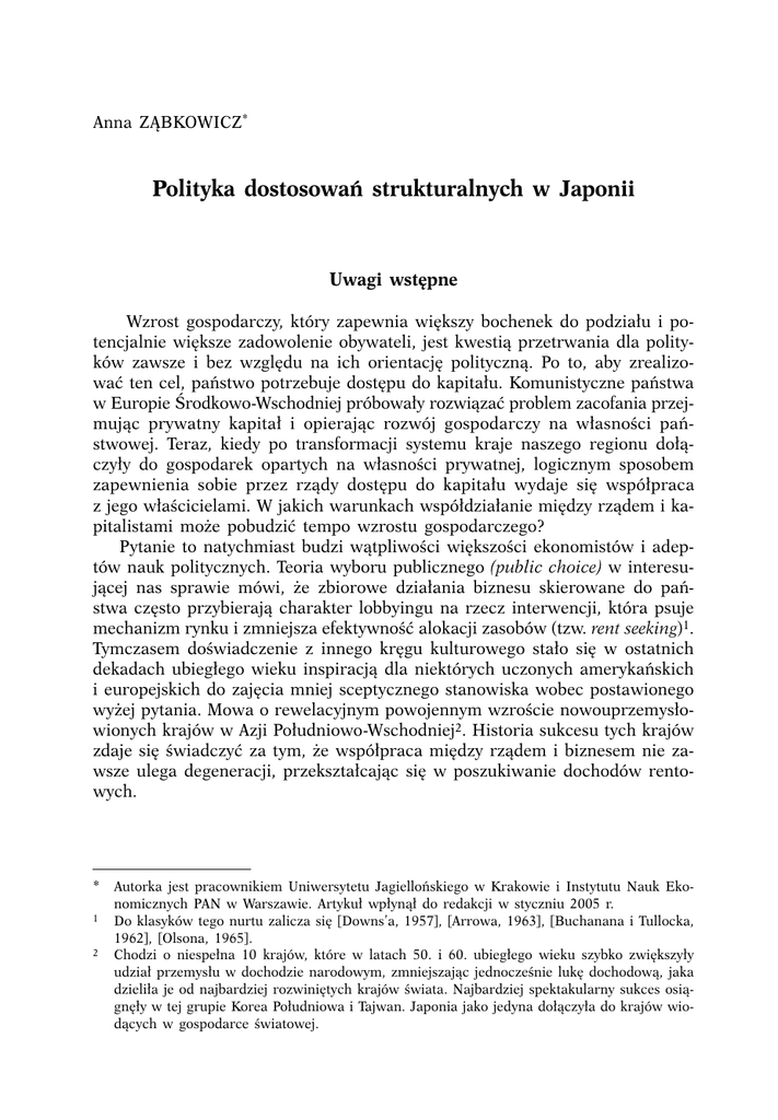 Anna ZÑBKOWICZ* Polityka dostosowaƒ strukturalnych w Japonii Uwagi wst´pne Wzrost gospodarczy, który zapewnia wi´kszy bochenek do podzia∏u i potencjalnie wi´ksze zadowolenie obywateli, jest kwestià przetrwania dla polityków zawsze i bez wzgl´du na ich orientacj´ politycznà. Po to, aby zrealizowaç ten cel, paƒstwo potrzebuje dost´pu do kapita∏u. Komunistyczne paƒstwa w Europie Ârodkowo-Wschodniej próbowa∏y rozwiàzaç problem zacofania przejmujàc prywatny kapita∏ i opierajàc rozwój gospodarczy na w∏asnoÊci paƒstwowej. Teraz, kiedy po transformacji systemu kraje naszego regionu do∏àczy∏y do gospodarek opartych na w∏asnoÊci prywatnej, logicznym sposobem zapewnienia sobie przez rzàdy dost´pu do kapita∏u wydaje si´ wspó∏praca z jego w∏aÊcicielami. W jakich warunkach wspó∏dzia∏anie mi´dzy rzàdem i kapitalistami mo˝e pobudziç tempo wzrostu gospodarczego? Pytanie to natychmiast budzi wàtpliwoÊci wi´kszoÊci ekonomistów i adeptów nauk politycznych. Teoria wyboru publicznego (public choice) w interesujàcej nas sprawie mówi, ˝e zbiorowe dzia∏ania biznesu skierowane do paƒstwa cz´sto przybierajà charakter lobbyingu na rzecz interwencji, która psuje mechanizm rynku i zmniejsza efektywnoÊç alokacji zasobów (tzw. rent seeking)1. Tymczasem doÊwiadczenie z innego kr´gu kulturowego sta∏o si´ w ostatnich dekadach ubieg∏ego wieku inspiracjà dla niektórych uczonych amerykaƒskich i europejskich do zaj´cia mniej sceptycznego stanowiska wobec postawionego wy˝ej pytania. Mowa o rewelacyjnym powojennym wzroÊcie nowouprzemys∏owionych krajów w Azji Po∏udniowo-Wschodniej2. Historia sukcesu tych krajów zdaje si´ Êwiadczyç za tym, ˝e wspó∏praca mi´dzy rzàdem i biznesem nie zawsze ulega degeneracji, przekszta∏cajàc si´ w poszukiwanie dochodów rentowych. * 1 2 Autorka jest pracownikiem Uniwersytetu Jagielloƒskiego w Krakowie i Instytutu Nauk Ekonomicznych PAN w Warszawie. Artyku∏ wp∏ynà∏ do redakcji w styczniu 2005 r. Do klasyków tego nurtu zalicza si´ [Downs’a, 1957], [Arrowa, 1963], [Buchanana i Tullocka, 1962], [Olsona, 1965]. Chodzi o niespe∏na 10 krajów, które w latach 50. i 60. ubieg∏ego wieku szybko zwi´kszy∏y udzia∏ przemys∏u w dochodzie narodowym, zmniejszajàc jednoczeÊnie luk´ dochodowà, jaka dzieli∏a je od najbardziej rozwini´tych krajów Êwiata. Najbardziej spektakularny sukces osiàgn´∏y w tej grupie Korea Po∏udniowa i Tajwan. Japonia jako jedyna do∏àczy∏a do krajów wiodàcych w gospodarce Êwiatowej. 54 GOSPODARKA NARODOWA Nr 4/2005 W niniejszym artykule zostanà przedstawione wnioski ze studium przypadku Japonii [Zàbkowicz, 2004]. Przyk∏ad Japonii, najwi´kszej pot´gi gospodarczej Azji Po∏udniowo-Wschodniej, emanowa∏ na stosunki mi´dzy rzàdami i biznesem w innych krajach regionu, z których wi´kszoÊç to by∏e kolonie Japonii lub wspó∏czeÊnie g∏ówni odbiorcy japoƒskich inwestycji [Jomo, 2001, s. 461]. Prawie wszystkie gospodarki tego regionu wyró˝nia∏y si´ w powojennych dekadach tempem wzrostu gospodarczego. Pionierem i przodownikiem by∏a Japonia, której zrujnowana wojnà gospodarka do po∏owy lat 70. powi´kszy∏a swe rozmiary (pod wzgl´dem wytwarzanego produktu) 55-krotnie, rosnàc w szczytowym okresie Êrednio co roku o ponad 11% (tabl. 1). Prawie wszystkie gospodarki regionu podlega∏y zarazem polityce przemys∏owej3, co sugeruje, ˝e polityka wzgl´dem w∏aÊcicieli kapita∏u ulokowanego w przemyÊle by∏a wa˝nym elementem tamtejszej strategii wzrostu [Stiglitz, 2001, s. 519]. Z tych wzgl´dów, przy wszystkich zastrze˝eniach, jakie mo˝e uczyniç badacz specyficznych warunków tych krajów, przedstawione wnioski zdajà si´ mieç zastosowanie nie tylko do analizowanego przypadku, ale do najszybciej po wojnie rozwijajàcego si´ regionu Êwiata. Tablica 1 Realne tempo wzrostu PKN w powojennej Japonii 1953-55 7,0 1955-60 8,6 1960-65 10,6 1965-70 11,2 1970-75 4,6 1975-80 5,1 1980-85 3,9 èród∏o: Raporty Economic Planning Agency: National Income Accounts i Annual Report on National Accounts Kierunki ingerencji rzàdu w stosunki przemys∏owe Japonia, uboga w bogactwa naturalne, w wyniku kl´ski poniesionej w drugiej wojnie Êwiatowej straci∏a kolonie zamorskie, a wraz z nimi kontrol´ nad zasobami surowców w Mand˝urii, Korei, na Tajwanie. Wobec ca∏kowitego rozbrojenia narzuconego przez zwyci´zców mo˝liwoÊç rozwiàzywania problemu drogà podbojów zosta∏a zamkni´ta. Odtàd Japonia musia∏a p∏aciç za surowce zamiast transferowaç je z kolonii. Celem nadrz´dnym, dla którego paƒstwo w Japonii zapewni∏o sobie wp∏yw na gospodark´, by∏o przezwyci´˝enie wàskiego gard∏a wzrostu ubogiej w zasoby naturalne i zale˝nej od handlu zagranicznego gospodarki, jakim by∏ niedostatek dewiz. Aby pokonaç t´ barier´ Japonia musia∏a zmobilizowaç wewn´trzne zasoby kapita∏u i osiàgnàç takà wartoÊç sprzeda˝y eksportowej, która pokrywa∏aby potrzeby importowe przy wymaganej stopie wzrostu. Innymi s∏owy, jej gospodarka musia∏a byç konkurencyjna. 3 Chocia˝ trudno stwierdziç, ˝e w regionie realizowano jednà recept´, polityka przemys∏owa typu bran˝owego oparta o ukierunkowany kredyt by∏a praktykowana w najwi´kszych oprócz Chin gospodarkach regionu: w Japonii, Korei Po∏udniowej, Singapurze i na Tajwanie [World Bank, 1996, s. 86]. Anna Zàbkowicz, Polityka dostosowaƒ strukturalnych w Japonii 55 Z historycznej perspektywy widaç, ˝e osiàgni´ciu pozycji konkurencyjnej s∏u˝y∏y dzia∏ania rzàdu skierowane explicite do sektora przemys∏u, splecione z regulacjà handlu zagranicznego i politykà bezpieczeƒstwa ekonomicznego. Zarobiç na niezb´dne surowce Japonia mog∏a tylko sprzedajàc na zagranicznych rynkach produkty przemys∏u przetwórczego, gdy˝ rozwój gospodarki rolnej napotyka w tym kraju na wyjàtkowe bariery naturalne. Wzrost produkcji i produktywnoÊci