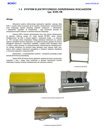 www.monat.pl 1.3 SYSTEM ELEKTRYCZNEGO OGRZEWANIA ROZJAZDÓW typ: EOR-1M Wstęp Stosowanie systemu elektrycznego ogrzewania rozjazdów, zwanego dalej EOR, w sposób istotny przyczynia się do poprawy niezawodności i bezpieczeństwa ruchu kolejowego poprzez likwidację zagrożeń związanych z zaśnieżeniem i oblodzeniem rozjazdów. W konsekwencji – jego stosowanie prowadzi do zmniejszenia kosztów własnych w zakresie transportu kolejowego. Systemy EOR w bilansie zainstalowanej mocy (dla potrzeb nietrakcyjnych) są głównym odbiorcą energii. Ich udział stanowi 90÷95% całych potrzeb energetycznych, ale tylko w okresie opadów i nawiewania śniegu – co ostanowi ok. 10% rocznego okresu eksploatacji. Dlatego jednakowe traktowanie np. potrzeb systemu oświetlenia terenów kolejowych, czy zasilania budynku nastawni lub dworca (obciążenia całoroczne i stosunkowo niewielkie) i systemu EOR (obciążenie duże w krótkim czasie) prowadzi do przewymiarowania transformatorów energetycznych, ich niskiego obciążenia (na poziomie biegu jałowego) przez większą część roku, dużych zmian napięcia widocznych szczególnie w zmianach natężenia oświetlenia w momencie załączania i wyłączania EOR. Zastosowane - w przedstawianym systemie - rozwiązania pozwalają na jego bardziej ekonomiczną eksploatację. System EOR-1M oferuje oprócz spełniania zasadniczej funkcji oczyszczania rozjazdów z lodu i śniegu nowe możliwości w zakresie ograniczenia kosztów eksploatacji, kosztów inwestycji wieloetapowych lub rozbudowy systemu. 1. Rozdzielnica MN-GR-01 2. Skrzynia transformatorów kolejowych STK 3. Przetwornik pogodowy MN-B-02 www.monat.pl Opis ogólny Patrząc od strony rozjazdu, system EOR-1M składa się z następujących elementów: grzałek (montowanych na rozjeździe), czujników śniegu (montowanych na rozjazdach wzorcowych), skrzyń transformatorów kolejowych separacyjnych typu STK, z których są zasilane grzałki (montowanych przy rozjazdach), rozdzielnic EOR typu MN-GR-01, z których są zasilane skrzynie STK poszczególnych rozjazdów (montowanych w rejonach zgrupowania rozjazdów - głowicach), centrów sterowania lokalnego monitorujących i pozwalających zdalnie sterować rozdzielnicami EOR i ich poszczególnymi rozjazdami (zlokalizowanych w nastawniach stacji kolejowych lub posterunków odgałęźnych), centrów sterowania i monitorowania zdalnego obejmującego swoim nadzorem konkretny odcinek linii kolejowej z wieloma stacjami (montowanych np. w nastawniach LCS). Elementy systemu są połączone poprzez: kablowe linie energetyczne, kablowe linie sterownicze (sterowanie przekaźnikowe), linie transmisji danych (zależnie od lokalnej sytuacji – kable telekomunikacyjne, światłowody, GSM). Charakterystyka System odróżnia od innych aplikacji tego typu podwójne rozproszenie: inteligencji (tzn. niezależne, małe sterowniki obsługujące poszczególne odpływy rozdzielnicy albo część wspólną tzn. zasilanie i obsługę przetworników) aparatury (tzn. wyposażenie odpływów elektryczne i elektroniczne zostało przeniesione z rozdzielnicy do skrzyń transformatorowych, które w systemie EOR są integralnie związane z odbiorami). Dodatkowo w tym systemie zastosowano dla jednej rozdzielnicy: dwa czujniki śniegu (montowane na rozjazdach wzorcowych), podwójny system sterowania – przekaźnikowego i cyfrowego. Na uwagę zasługuje również nowatorska konstrukcja skrzyni transformatorowej, która pozwoliła na fizyczne oddzielenie obwodów wtórnych transformatorów od obwodów pierwotnych i transformatorów separacyjnych od pozostałych aparatów. Ponadto pozwala ona na montaż większej ilości transformatorów bez istotnego zwiększenia gabarytów zewnętrznych (co jest szczególnie ważne dla 3-fazowego zasilania odpływów i dla dużych rozjazdów). Wszystkie te zmiany wprowadzono, aby uprościć projektowanie systemu, ułatwić i obniżyć koszty jego rozbudowy lub przebudowy i zredukować koszty eksploatacji. Jest to możliwe, gdyż: zamawiany jest jeden typ rozdzielnic (MN-GR-01) – ilość obsługiwanych rozjazdów jest ograniczona tylko max sumarycznym prądem obciążenia na fazę – 160A, wystarczy określić typy rozjazdów i ich ilość, aby otrzymać odpowiednio wyposażone zestawy (skrzyń transformatorowych STK z właściwymi transformatorami i pozostałą aparaturą, zestaw grzałek i uchwytów), projektowanie i układanie linii kablowych jest proste jak projektowanie linii oświetleniowych (magistralne połączenia kablowe zamiast promieniowych), dwa czujniki pogodowe na rozdzielnicę pozwalają na podział rozjazdów na dwie strefy grzania, co zmniejsza współczynnik jednoczesności z kj=1 do min. kj=0,5 (jeżeli mocami obie grupy są jednakowe i ta grupa, której czujnik później wykryje śnieg, załączy się po wygrzaniu pierwszej), w systemie tym czujniki wyłączają ogrzewanie, gdy nie ma śniegu z czasowym marginesem bezpieczeństwa (1÷3h), a nie w momencie osiągnięcia temperatury wyłączenia (zwykle 3÷5°C); w temperaturach bardzo niskich instalacje tradycyjne EOR mogą być załączone przez kilka dni, gdyż szyny nie osiągają temperatur dodatnich, gdy jednocześnie śnieg – w wyniku ogrzewania i zjawiska sublimacji – zwykle zostaje usunięty po kilku godzinach, zalecane w tym systemie dwa zasilania rozdzielnic (całoroczne 1-fazowe o mocy ok. 50W i zimowe 3-fazowe o mocy wynikającej z zapotrzebowania systemu ∑ P x kj ) pozwalają na wyłączanie zasilania po stronie SN transformatorów zasilania zimowego (aby zredukować straty biegu jałowego), rozbudowa systemu o kilka nowych ogrzewanych rozjazdów, wiąże się tylko z ich wyposażeniem elektrycznym (skrzynie STK z grzałkami i uchwytami), podłączeniem do linii kablowych magistralnych rozdzielnicy i aktualizacją oprogramowania w centrum sterowania lokalnego (oczywiście, gdy istnieje „zapas” mocy w rozdzielnicy i kabel magistralny też ma „zapas” na w