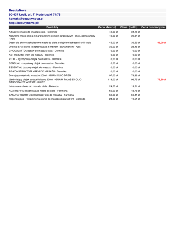 BeautyNova 90-437 Łódź, ul. T. Kościuszki 74/78 [email protected] http://beautynova.pl/ Produkty Cena (brutto) Cena (netto) Arbuzowe masło do masażu ciała - Bielenda 42,00 zł 34,15 zł Naturalne masło shea z marokańskim olejkiem arganowym i ekstr. pomarańczy - Apis 49,00 zł 39,84 zł Deser dla skóry czekoladowe masło do ciała z olejkiem babassu i chili -Apis 45,00 zł 36,59 zł Oriental SPA oliwka rozgrzewająca z imbirem i cynamonem - Apis 35,00 zł 28,46 zł CHOCOLATTO zestaw do masażu ciała - Dermika 0,00 zł 0,00 zł ABT Reduktor krem do masażu - Dermika 0,00 zł 0,00 zł VITAL - egzotyczny olejek do masażu - Dermika 0,00 zł 0,00 zł SENSUAL - zmysłowy olejek do masażu - Dermika 0,00 zł 0,00 zł ESSENTIAL bazowy olejek do masażu - Dermika 0,00 zł 0,00 zł RE-KONSTRUKTOR KREM DO MASAŻU - Dermika 0,00 zł 0,00 zł 97,00 zł 78,86 zł 119,00 zł 96,75 zł Luksusowa oliwka do masażu ciała - Bielenda 24,00 zł 19,51 zł ACAI REFIRM Ujędrniające masło do ciała - Farmona 60,00 zł 48,78 zł SAKURA YOUTH Odmładzający olej do masażu - Farmona 62,00 zł 50,41 zł Regenerująco – witaminowa oliwka do masażu ciała 500 ml - Bielenda 24,00 zł 19,51 zł Drenujący olejek do masażu 200ml - GUAM OLIO DREN Ujędrniający olejek antycellulitowy 200ml - GUAM TALASSO OLIO RASSODANTE ANTICELLULITE Cena promocyjna 43,00 zł 76,50 zł