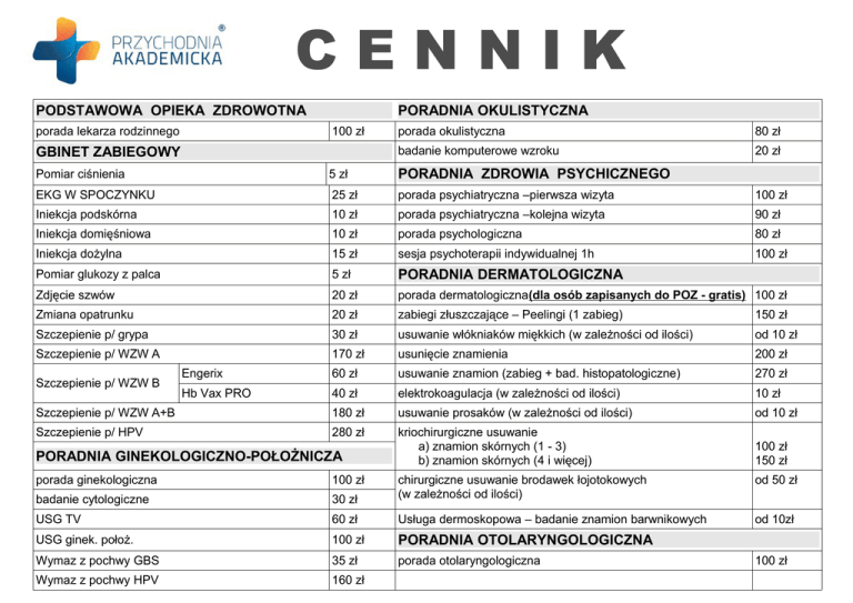 CENNIK PODSTAWOWA OPIEKA ZDROWOTNA porada lekarza rodzinnego PORADNIA OKULISTYCZNA 100 zł GBINET ZABIEGOWY porada okulistyczna 80 zł badanie komputerowe wzroku 20 zł Pomiar ciśnienia 5 zł PORADNIA ZDROWIA PSYCHICZNEGO EKG W SPOCZYNKU 25 zł porada psychiatryczna –pierwsza wizyta 100 zł Iniekcja podskórna 10 zł porada psychiatryczna –kolejna wizyta 90 zł Iniekcja domięśniowa 10 zł porada psychologiczna 80 zł Iniekcja dożylna 15 zł sesja psychoterapii indywidualnej 1h 100 zł Pomiar glukozy z palca 5 zł PORADNIA DERMATOLOGICZNA Zdjęcie szwów 20 zł porada dermatologiczna(dla osób zapisanych do POZ - gratis) 100 zł Zmiana opatrunku 20 zł zabiegi złuszczające – Peelingi (1 zabieg) 150 zł Szczepienie p/ grypa 30 zł usuwanie włókniaków miękkich (w zależności od ilości) od 10 zł Szczepienie p/ WZW A 170 zł usunięcie znamienia 200 zł Engerix 60 zł usuwanie znamion (zabieg + bad. histopatologiczne) 270 zł Hb Vax PRO 40 zł elektrokoagulacja (w zależności od ilości) 10 zł Szczepienie p/ WZW A+B 180 zł usuwanie prosaków (w zależności od ilości) od 10 zł Szczepienie p/ HPV 280 zł kriochirurgiczne usuwanie a) znamion skórnych (1 - 3) b) znamion skórnych (4 i więcej) 100 zł 150 zł Szczepienie p/ WZW B PORADNIA GINEKOLOGICZNO-POŁOŻNICZA porada ginekologiczna 100 zł od 50 zł 30 zł chirurgiczne usuwanie brodawek łojotokowych (w zależności od ilości) badanie cytologiczne USG TV 60 zł Usługa dermoskopowa – badanie znamion barwnikowych od 10zł USG ginek. położ. 100 zł PORADNIA OTOLARYNGOLOGICZNA Wymaz z pochwy GBS 35 zł porada otolaryngologiczna Wymaz z pochwy HPV 160 zł 100 zł PORADNIA ŻYWIENIOWA Porada dietetyczna (dla osób zapisanych do POZ - gratis) 30 zł Wypełnienie światłoutwardzalne (2 powierzchnia) 200 zł Analiza składu ciała 30 zł Wypełnienie światłoutwardzalne (3 powierzchnia) 300 zł Konsultacja dietetyczna z analizą składu ciała 100 zł Opatrunek czasowy 100 zł Konsultacja dietetyczna bez analizy składu ciała 70 zł Opatrunek leczniczy 120 zł Jadłospis 1 tygodniowy plus przepisy 60 zł Pokrycie bezpośrednie miazgi 150 zł Jadłospis 2 tygodniowy plus przepisy 80 zł Leczenie nadwrażliwości 1 zęba 20 zł Ekstyrpacja – 1 kanał 100 zł PORADNIA MEDYCYNY PRACY Wizyta u lekarza w zakresie Medycyny Pracy 40 zł Ekstyrpacja – 2 kanały 150 zł Badanie kandydatów na kierowców kat. A, B 200 zł Ekstyrpacja – 3 kanały 180 zł Zaświadczenie dla Izb Lekarskich i Pielęgniarskich 40zł Endo – czasowe wypełnienie 1 kanału 100 zł Badanie psychotechniczne 90 zł Endo – czasowe wypełnienie 2 kanałów 150 zł Badanie audiometryczne 35 zł Endo – czasowe wypełnienie 3 kanałów 180 zł Opracowanie i wypełnienie 1 kanałów 250 zł PORADNIA STOMATOLOGICZNA Konsultacja periodontologiczna 100 zł Opracowanie i wypełnienie 2 kanałów 400 zł Konsultacja endodontyczna 100 zł Opracowanie i wypełnienie 3 kanałów 500 zł Konsultacja protetyczna 100 zł Rekonstrukcja zęba 300 zł Leczenie suchego zębodołu 100 zł Rekonstrukcja zęba na ćwieku okołomiazgowym 300 zł Znieczulenie miejscowe 30 zł Dewitalizacja miazgi z opatrunkiem 100 zł Znieczulenie przewodowe 30 zł Amputacja przyżyciowa miazgi 100 zł Przegląd stomatologiczny 100 zł Lakowanie zęba stałego 150 zł Wypełnienie chemoutwardzalne (szyjka) 120 zł Lakierowanie jednego zęba 75 zł Wypełnienie chemoutwardzalne (1 powierzchnia) 150 zł Scaling z całej jamy ustnej 200 zł Wypełnienie chemoutwardzalne (2 powierzchnia) 200 zł Scaling jednego łuku zębowego 100 zł Wypełnienie chemoutwardzalne (3 powierzchnia) 250 zł Piaskowanie zębów z całej jamy ustnej 200 zł Wypełnienie światłoutwardzalne (szyjka) Scaling ultradźwiękowy + piaskowanie 250 zł Odbudowa kąta siecznego zęba przedniego 200 zł 150 zł Wypełnienie światłoutwardzalne (1 powierzchnia) 170 zł Wybielanie nakładkowe 900 zł Wybielanie pojedynczego zęba przebarwionego + licówka 400 zł Usunięcie zęba w znieczuleniu 150 zł Szynowanie zębów rozchwianych (1 ząb) 150 zł Odbudowa brakującego zęba na poprzecznych włóknach szklanych (1,2,3) 600 zł Leczenie zmian paradentalnych (1 zabieg) 100 zł Korona akrylowa 250 zł Korona metalowa porcelanowa 750 zł Most metal-porcelana 1 punkt 750 zł Wkład koronowo-korzeniowy 400 zł Korona pełnoceramiczna 1500 zł Proteza akrylowa ilość zębów do 5 500 zł Proteza akrylowa ilość zębów od 5-6 600 zł Proteza akrylowa ilość zębów od 5-8 1000 zł Proteza acetalowa 1200 zł Proteza nylonowa 1200 zł Ważny od: STYCZEŃ 2016