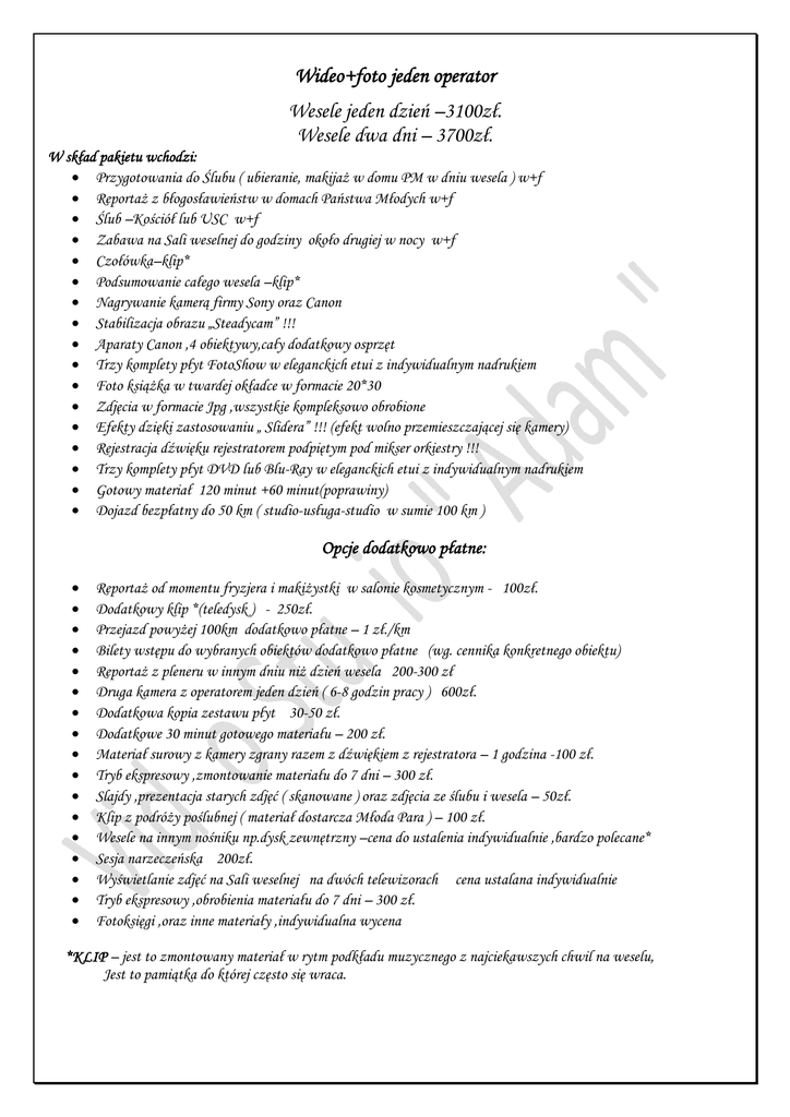 Wideo+foto jeden operator Wesele jeden dzień –3100zł. Wesele dwa dni – 3700zł. W skład pakietu wchodzi: Przygotowania do Ślubu ( ubieranie, makijaż w domu PM w dniu wesela ) w+f Reportaż z błogosławieństw w domach Państwa Młodych w+f Ślub –Kościół lub USC w+f Zabawa na Sali weselnej do godziny około drugiej w nocy w+f Czołówka–klip* Podsumowanie całego wesela –klip* Nagrywanie kamerą firmy Sony oraz Canon Stabilizacja obrazu „Steadycam” !!! Aparaty Canon ,4 obiektywy,cały dodatkowy osprzęt Trzy komplety płyt FotoShow w eleganckich etui z indywidualnym nadrukiem Foto książka w twardej okładce w formacie 20*30 Zdjęcia w formacie Jpg ,wszystkie kompleksowo obrobione Efekty dzięki zastosowaniu „ Slidera” !!! (efekt wolno przemieszczającej się kamery) Rejestracja dźwięku rejestratorem podpiętym pod mikser orkiestry !!! Trzy komplety płyt DVD lub Blu-Ray w eleganckich etui z indywidualnym nadrukiem Gotowy materiał 120 minut +60 minut(poprawiny) Dojazd bezpłatny do 50 km ( studio-usługa-studio w sumie 100 km ) Opcje dodatkowo płatne: Reportaż od momentu fryzjera i makiżystki w salonie kosmetycznym - 100zł. Dodatkowy klip *(teledysk ) - 250zł. Przejazd powyżej 100km dodatkowo płatne – 1 zł./km Bilety wstępu do wybranych obiektów dodatkowo płatne (wg. cennika konkretnego obiektu) Reportaż z pleneru w innym dniu niż dzień wesela 200-300 zł Druga kamera z operatorem jeden dzień ( 6-8 godzin pracy ) 600zł. Dodatkowa kopia zestawu płyt 30-50 zł. Dodatkowe 30 minut gotowego materiału – 200 zł. Materiał surowy z kamery zgrany razem z dźwiękiem z rejestratora – 1 godzina -100 zł. Tryb ekspresowy ,zmontowanie materiału do 7 dni – 300 zł. Slajdy ,prezentacja starych zdjęć ( skanowane ) oraz zdjęcia ze ślubu i wesela – 50zł. Klip z podróży poślubnej ( materiał dostarcza Młoda Para ) – 100 zł. Wesele na innym nośniku np.dysk zewnętrzny –cena do ustalenia indywidualnie ,bardzo polecane* Sesja narzeczeńska 200zł. Wyświetlanie zdjęć na Sali weselnej na dwóch telewizorach cena ustalana indywidualnie Tryb ekspresowy ,obrobienia materiału do 7 dni – 300 zł. Fotoksięgi ,oraz inne materiały ,indywidualna wycena *KLIP – jest to zmontowany materiał w rytm podkładu muzycznego z najciekawszych chwil na weselu, Jest to pamiątka do której często się wraca.