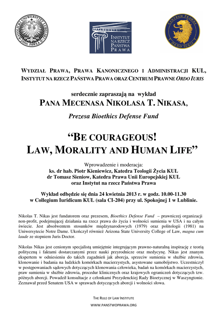 WYDZIAŁ PRAWA, PRAWA KANONICZNEGO I ADMINISTRACJI KUL, INSTYTUT NA RZECZ PAŃSTWA PRAWA ORAZ CENTRUM PRAWNE ORDO IURIS serdecznie zapraszają na wykład PANA MECENASA NIKOLASA T. NIKASA, Prezesa Bioethics Defense Fund “BE COURAGEOUS! LAW, MORALITY AND HUMAN LIFE” Wprowadzenie i moderacja: ks. dr hab. Piotr Kieniewicz, Katedra Teologii Życia KUL dr Tomasz Sieniow, Katedra Prawa Unii Europejskiej KUL oraz Instytut na rzecz Państwa Prawa Wykład odbędzie się dnia 24 kwietnia 2013 r. w godz. 10.00-11.30 w Collegium Iuridicum KUL (sala CI-204) przy ul. Spokojnej 1 w Lublinie. Nikolas T. Nikas jest fundatorem oraz prezesem, Bioethics Defense Fund – prawniczej organizacji non-profit, podejmującej działania na rzecz prawa do życia i wolności sumienia w USA i na całym świecie. Jest absolwentem stosunków międzynarodowych (1979) oraz politologii (1981) na Uniwersytecie Notre Dame. Ukończył również Arizona State University College of Law, magna cum laude ze stopniem Juris Doctor. Nikolas Nikas jest cenionym specjalistą umiejętnie integrującym prawno-naturalną inspirację z teorią polityczną i faktami dostarczanymi przez nauki przyrodnicze oraz medycynę. Nikas jest znanym ekspertem w odniesieniu do takich zagadnień jak aborcja, sprzeciw sumienia w służbie zdrowia, klonowanie i badania na ludzkich komórkach macierzystych, asystowane samobójstwo. Uczestniczył w postępowaniach sądowych dotyczących klonowania człowieka, badań na komórkach macierzystych, praw sumienia w służbie zdrowia, procedur klinicznych oraz krajowych ograniczeń dotyczących tzw. późnych aborcji. Powadził konsultacje z członkami Prezydenckiej Rady Bioetycznej w Waszyngtonie. Zeznawał przed Senatem USA w sprawach dotyczących aborcji i wolności słowa. THE RULE OF LAW INSTITUTE WWW.PANSTWOPRAWA.ORG