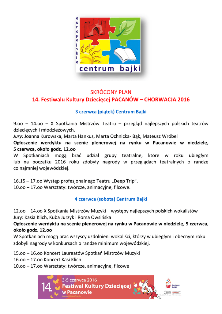 SKRÓCONY PLAN 14. Festiwalu Kultury Dziecięcej PACANÓW – CHORWACJA 2016 3 czerwca (piątek) Centrum Bajki 9.oo – 14.oo – X Spotkania Mistrzów Teatru – przegląd najlepszych polskich teatrów dziecięcych i młodzieżowych. Jury: Joanna Kurowska, Marta Hankus, Marta Ochnicka- Bąk, Mateusz Wróbel Ogłoszenie werdyktu na scenie plenerowej na rynku w Pacanowie w niedzielę, 5 czerwca, około godz. 12.oo W Spotkaniach mogą brać udział grupy teatralne, które w roku ubiegłym lub na początku 2016 roku zdobyły nagrody w przeglądach teatralnych o randze co najmniej wojewódzkiej. 16.15 – 17.oo Występ profesjonalnego Teatru „Deep Trip”. 10.oo – 17.oo Warsztaty: twórcze, animacyjne, filcowe. 4 czerwca (sobota) Centrum Bajki 12.oo – 14.oo X Spotkania Mistrzów Muzyki – występy najlepszych polskich wokalistów Jury: Kasia Klich, Kuba Jurzyk i Roma Owsińska Ogłoszenie werdyktu na scenie plenerowej na rynku w Pacanowie w niedzielę, 5 czerwca, około godz. 12.oo W Spotkaniach mogą brać wszyscy uzdolnieni wokaliści, którzy w ubiegłym i obecnym roku zdobyli nagrody w konkursach o randze minimum wojewódzkiej. 15.oo – 16.oo Koncert Laureatów Spotkań Mistrzów Muzyki 16.oo – 17.oo Koncert Kasi Klich 10.oo – 17.oo Warsztaty: twórcze, animacyjne, filcowe 5 czerwca (niedziela) Rynek Prowadzący: Katarzyna Zielińska i Kacper Kuszewski 10.oo – Msza Święta w Bazylice w Pacanowie 11.3o – Bajkowy Korowód 12.oo – Powitanie, wręczanie nagród w konkursach 13.oo – Występ gościa specjalnego z Chorwacji KUD „Šumari” 13.3o – Koziołkowe figle 13.5o – Czytanie książki „Biały klaun” przez Dominikę Ostałowską 14.oo – Występ Mażoretek 14.3o – Spektakl teatralny „Krawiec Niteczka” 15.oo – Urodziny Koziołka Matołka 15.2o – Laureaci Spotkań Mistrzów Muzyki 15.3o – Występ zespołu „Diamenty Powiśla” 15.4o – Koziołkowe figle 16.oo – Przedszkolaki z Pacanowa 16.1o – Występ gościa specjalnego z Chorwacji KUD „Sumari” 16.4o – Występ zespołu „Diamenty Powiśla” 16.5o – Czytanie książki „Mała encyklopedia domowych potworów” 17.oo – Koziołkowe figle 17.3o – Koncert Margaret Zapraszamy także do stref tematycznych: Strefa wiedzy naukowy plac zabaw, wystawa robotów, edukacyjne gry na tablicach interaktywnych; Strefa twórczości warsztaty twórcze, filcowe, garncarskie, ceramiczne, kowalstwa artystycznego, cyrkowe, filcowanie na mokro, malowanie tkanin i art. recyclingu, pająkowe konstrukcje, decupage. Strefa książki czytanie bajek oraz warsztaty plastyczne i animacyjne Strefa rodziców warsztaty twórcze Strefa zabawy wesoła piaskownica, zabawy animacyjne, zabawy ruchowe, malowanie twarzy, gigantyczne bańki mydlane, budowanie z ogromnych klocków cegieł, bump, klocki kreatywne oraz wesołe miasteczko.