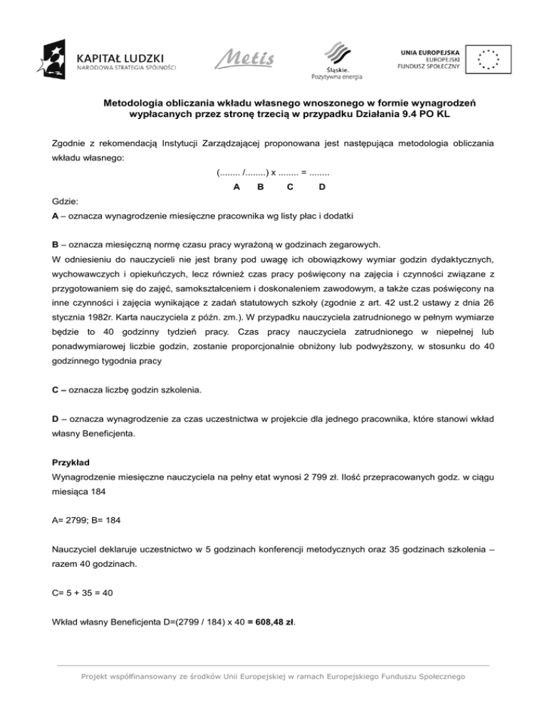 Metodologia obliczania wkładu własnego wnoszonego w formie wynagrodzeń wypłacanych przez stronę trzecią w przypadku Działania 9.4 PO KL Zgodnie z rekomendacją Instytucji Zarządzającej proponowana jest następująca metodologia obliczania wkładu własnego: (........ /........) x ........ = ........ A B C D Gdzie: A – oznacza wynagrodzenie miesięczne pracownika wg listy płac i dodatki B – oznacza miesięczną normę czasu pracy wyrażoną w godzinach zegarowych. W odniesieniu do nauczycieli nie jest brany pod uwagę ich obowiązkowy wymiar godzin dydaktycznych, wychowawczych i opiekuńczych, lecz również czas pracy poświęcony na zajęcia i czynności związane z przygotowaniem się do zajęć, samokształceniem i doskonaleniem zawodowym, a także czas poświęcony na inne czynności i zajęcia wynikające z zadań statutowych szkoły (zgodnie z art. 42 ust.2 ustawy z dnia 26 stycznia 1982r. Karta nauczyciela z późn. zm.). W przypadku nauczyciela zatrudnionego w pełnym wymiarze będzie to 40 godzinny tydzień pracy. Czas pracy nauczyciela zatrudnionego w niepełnej lub ponadwymiarowej liczbie godzin, zostanie proporcjonalnie obniżony lub podwyższony, w stosunku do 40 godzinnego tygodnia pracy C – oznacza liczbę godzin szkolenia. D – oznacza wynagrodzenie za czas uczestnictwa w projekcie dla jednego pracownika, które stanowi wkład własny Beneficjenta. Przykład Wynagrodzenie miesięczne nauczyciela na pełny etat wynosi 2 799 zł. Ilość przepracowanych godz. w ciągu miesiąca 184 A= 2799; B= 184 Nauczyciel deklaruje uczestnictwo w 5 godzinach konferencji metodycznych oraz 35 godzinach szkolenia – razem 40 godzinach. C= 5 + 35 = 40 Wkład własny Beneficjenta D=(2799 / 184) x 40 = 608,48 zł. Projekt współfinansowany ze środków Unii Europejskiej w ramach Europejskiego Funduszu Społecznego