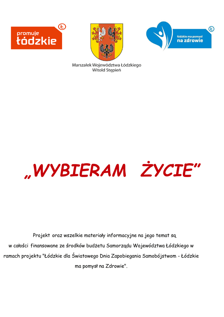 „WYBIERAM ŻYCIE” Projekt oraz wszelkie materiały informacyjne na jego temat są w całości finansowane ze środków budżetu Samorządu Województwa Łódzkiego w ramach projektu "Łódzkie dla Światowego Dnia Zapobiegania Samobójstwom - Łódzkie ma pomysł na Zdrowie". „Globalny” wskaźnik samobójstw wynosi około 16 na 100 000 populacji - co 40 sekund jedna osoba popełnia samobójstwo na świecie Zgodnie z definicją WHO (Światowej Organizacji Zdrowia) samobójstwo jest aktem o skutku śmiertelnym, który zmarły ze świadomością i oczekiwaniem takiego skutku sam zaplanował i wykonał w celu spowodowania zmian przez siebie pożądanych. Wczesne sygnały ostrzegawcze: • Wycofywanie się z kontaktów z rodziną i przyjaciółmi, • Zainteresowanie lub wręcz zaabsorbowanie śmiercią; • Wyraźne zmiany osobowości i poważne zmiany nastroju; • Trudności z koncentracją; • Zmiana dotychczasowych zwyczajów dotyczących jedzenia i snu (utrata apetytu lub objadanie się, bezsenność lub nadmierna senność); • Utrata zainteresowania rozrywkami; • Częste uskarżanie się na fizyczne dolegliwości, przeważnie powiązane z emocjami, jak bóle głowy, bóle żołądka lub uczucie zmęczenia; • Nieustanne znudzenie; • Utrata zainteresowań dla rzeczy i spraw, które dotychczas były istotne (np. zaniechanie dbałości o wygląd). Sygnały alarmujące – wysokiego zagrożenia: • Rozmawianie o samobójstwie lub o jego planowaniu; • Wzrost impulsywności: nagłe impulsywne działania, jak akty agresji i przemocy, zachowania buntownicze lub ucieczkowe (wynikające z ogromnego napięcia emocjonalnego); • Nagłe ekscesy alkoholowe lub narkotykowe (będące próbą „znieczulenia się" w cierpieniu lub formą „wołania o pomoc"); • Odrzucanie pomocy; poczucie, że udzielenie pomocy jest już niemożliwe; • Oskarżanie się „Jestem złym człowiekiem" lub poczucie „zepsucia (gnicia) w środku"; • Wypowiadanie komunikatów na temat beznadziejności życia, braku wyjścia, własnej bezwartościowości; • Odrzucanie otrzymywanych pochwał lub nagród; • Rzucanie co jakiś czas komunikatów typu: „Niedługo przestanę być dla ciebie problemem", „To nie ma znaczenia", „To już na nic się nie zda" lub „Już się nie zobaczymy"; • Nagłe przejście z depresji do stanu pogody i zadowolenia. Zwykle oznacza to, że po okresie walki wewnętrznej, człowiek podjął już decyzję o ucieczce od problemów i zakończeniu swego życia; • Rozdawanie swoich ulubionych przedmiotów; oddawanie domowych zwierzaków w dobre ręce; • Sporządzanie testamentu; • Wypowiadanie komunikatów takich jak: „Jestem niczym", „Nie warto się mną zajmować", „Chciałbym umrzeć", "Zamierzam się zabić", „Nie powinnam się urodzić". WAŻNE TELEFONY 116 111 Bezpłatny kryzysowy telefon zaufania dla dzieci i młodzieży Można dzwonić codziennie w godzinach 12.00-22.00. Ze strony www można też (po zalogowaniu) wysłać e-mail do specjalisty. Masz problem i szukasz osoby, do której możesz się z nim zwrócić? Czujesz się samotny, potrzebujesz wsparcia i rozmowy z życzliwą osobą? Zadzwoń lub napisz wiadomość. 116 123 Bezpłatny kryzysowy telefon zaufania dla dorosłych Można dzwonić codziennie w godzinach 14.00-22.00. (od poniedziałku do niedzieli, z wyjątkiem dni świątecznych !) Telefon dla osób, które z różnych powodów nie mają możliwości bezpośredniego kontaktu z psychologiem, udziela pomocy osobom doświadczającym kryzysu emocjonalnego, samotnym, cierpiącym z powodu depresji, bezsenności, chronicznego stresu. 800 12 12 12 Bezpłatny telefon zaufania dla dzieci i młodzieży Rzecznika Praw Dziecka Można dzwonić: od poniedziałku do piątku w godzinach 8.15-20.00. Jeśli zadzwonisz na ten numer w godzinach nocnych, możesz przedstawić swój problem i pozostawić numer telefonu, a następnego dnia na pewno oddzwonimy. Pod numer Dziecięcego Telefonu Zaufania mogą również dzwonić osoby dorosłe, by zgłosić problemy dzieci. 22 668 70 00 Niebieska Linia - Ogólnopolskie Pogotowie dla Ofiar Przemocy w Rodzinie. Poradnia działa w dni powszednie w godzinach 12.00 - 18.00 oraz w soboty i niedziele w godzinach 10.00 - 16.00; Jeśli jesteś świadkiem lub doświadczasz przemocy fizycznej, psychicznej lub innej w rodzinie, szkole, pracy lub Twoim otoczeniu, możesz anonimowo uzyskać informację gdzie szukać pomocy, jak rozwiązać problem, porozmawiać ze specjalistą psychologiem lub prawnikiem. E-mail: [email protected] Pomocne strony internetowe i instytucje Monar.org - Organizacja pozarządowa, która od 30 lat pomaga bezdomnym, samotnym, chorym, uzależnionym, zakażonym wirusem HIV oraz wykluczonym społecznie, w tym więźniom. Monar prowadzi zarówno ośrodki stacjonarne jak i pobytu dziennego oraz noclegownie, szpital, poradnie i punkty konsultacyjne. Ponad 50 placówek posiada uprawnienia do prowadzenia terapii i rehabilitacji osób z problemem narkotykowym. StopDepresji.pl - Coraz więcej osób choruje na depresję - sprawdź czy nie masz objawów. Depresja to choroba, którą leczy się farmakologicznie, zalecana też jest psychoterapia. Często depresja powoduje niechęć do leczenia, wynika to z jej objawów: bezsilności i utraty wiary w możliwość poprawy. Nieleczona depresja zabiera nam siły do normalnego funkcjonowania, powoduje myśli samobójcze. Punkt Interwencji Kryzysowej „Antidotum” przy Środowiskowym Hufcu Pracy ul. Milionowa 96 bl.13 tel. 0-42 672 23 02 Czynny: środa 11:00–19:00 Punkt Interwencji Kryzysowej przy Powiatowym Centrum Pomocy Rodzinie Powiatu Łódzkiego Wschodniego Al. Piłsudskiego 135 92-318 Łódź tel. 0-42 676 34 99 Centrum Służby Rodzinie w Łodzi ul. Broniewskiego 1a 93-162 Łódź tel. 0-42 682 20 22, 0-42 684 14 60 Fundacja Wsparcia Psychospołecznego w Łodzi ul. Zachodnia 97 lok.12 tel. 794 430 463 Stowarzyszenie wspierania rozwoju dzieci i młodzieży p