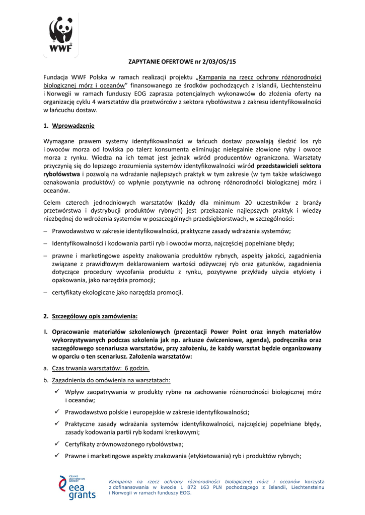 ZAPYTANIE OFERTOWE nr 2/03/OS/15 Fundacja WWF Polska w ramach realizacji projektu „Kampania na rzecz ochrony różnorodności biologicznej mórz i oceanów” finansowanego ze środków pochodzących z Islandii, Liechtensteinu i Norwegii w ramach funduszy EOG zaprasza potencjalnych wykonawców do złożenia oferty na organizację cyklu 4 warsztatów dla przetwórców z sektora rybołówstwa z zakresu identyfikowalności w łańcuchu dostaw. 1. Wprowadzenie Wymagane prawem systemy identyfikowalności w łańcuch dostaw pozwalają śledzić los ryb i owoców morza od łowiska po talerz konsumenta eliminując nielegalnie złowione ryby i owoce morza z rynku. Wiedza na ich temat jest jednak wśród producentów ograniczona. Warsztaty przyczynią się do lepszego zrozumienia systemów identyfikowalności wśród przedstawicieli sektora rybołówstwa i pozwolą na wdrażanie najlepszych praktyk w tym zakresie (w tym także właściwego oznakowania produktów) co wpłynie pozytywnie na ochronę różnorodności biologicznej mórz i oceanów. Celem czterech jednodniowych warsztatów (każdy dla minimum 20 uczestników z branży przetwórstwa i dystrybucji produktów rybnych) jest przekazanie najlepszych praktyk i wiedzy niezbędnej do wdrożenia systemów w poszczególnych przedsiębiorstwach, w szczególności: Prawodawstwo w zakresie identyfikowalności, praktyczne zasady wdrażania systemów; Identyfikowalności i kodowania partii ryb i owoców morza, najczęściej popełniane błędy; prawne i marketingowe aspekty znakowania produktów rybnych, aspekty jakości, zagadnienia związane z prawidłowym deklarowaniem wartości odżywczej ryb oraz gatunków, zagadnienia dotyczące procedury wycofania produktu z rynku, pozytywne przykłady użycia etykiety i opakowania, jako narzędzia promocji; certyfikaty ekologiczne jako narzędzia promocji. 2. Szczegółowy opis zamówienia: I. Opracowanie materiałów szkoleniowych (prezentacji Power Point oraz innych materiałów wykorzystywanych podczas szkolenia jak np. arkusze ćwiczeniowe, agenda), podręcznika oraz szczegółowego scenariusza warsztatów, przy założeniu, że każdy warsztat będzie organizowany w oparciu o ten scenariusz. Założenia warsztatów: a. Czas trwania warsztatów: 6 godzin. b. Zagadnienia do omówienia na warsztatach: Wpływ zaopatrywania w produkty rybne na zachowanie różnorodności biologicznej mórz i oceanów; Prawodawstwo polskie i europejskie w zakresie identyfikowalności; Praktyczne zasady wdrażania systemów identyfikowalności, najczęściej popełniane błędy, zasady kodowania partii ryb kodami kreskowymi; Certyfikaty zrównoważonego rybołówstwa; Prawne i marketingowe aspekty znakowania (etykietowania) ryb i produktów rybnych; Kampania na rzecz ochrony różnorodności biologicznej mórz i oceanów korzysta z dofinansowania w kwocie 1 872 163 PLN pochodzącego z Islandii, Liechtensteinu i Norwegii w ramach funduszy EOG. Aspekty jakości produktów rybołówstwa; Zagadnienia związane z prawidłowością deklarowania wartości odżywczej ryb; Kontrowersje związane z fałszowaniem nazw gatunków ryb; Zagadnienia dotyczące procedury wycofania produktu z rynku; Pozytywne przykłady użycia etykiety i opakowania, jako narzędzia promocji; Pytania, dyskusja, ewaluacja. c. Podręcznik dla uczestników, którego objętość nie powinna przekroczyć 40 stron formatu A4, powinien zawierać informacje na temat wszystkich zagadnień poruszanych w czasie szkolenia wskazane w punkcie b powyżej ze szczególnym zwróceniem uwagi na: Prawodawstwo w zakresie identyfikowalności, praktyczne zasady wdrażania systemów; Identyfikowalności i kodowania partii ryb, najczęściej popełniane błędy; Prawne i marketingowe aspekty znakowania produktów rybnych, aspekty jakości, zagadnienia związane z prawidłowym deklarowaniem wartości odżywczej ryb oraz gatunków, zagadnienia dotyczące procedury wycofania produktu z rynku, pozytywne przykłady; Użycia etykiety i opakowania, jako narzędzia promocji, certyfikaty ekologiczne jako narzędzia promocji. Skład i druk podręcznika leży po stronie Zleceniodawcy. II. Organizacja i przeprowadzenie 4 warsztatów dla przedstawicieli sektora rybołówstwa na terenie Polski. a. Wszystkie warsztaty muszą odbyć się w okresie lipiec 2015-marzec 2016 (dokładne terminy zostaną ustalone po rozstrzygnięciu konkursu ofert i podpisaniu Umowy). b. Każdy warsztat musi być przygotowany dla minimum 20 osób z branży przetwórstwa i dystrybucji produktów rybnych (rekrutacja uczestników po stronie Zleceniobiorcy we współpracy ze Zleceniodawcą). c. Miejsce organizacji warsztatów: 2 warsztaty w Trójmieście oraz 2 warsztaty w Szczecinie. d. W ramach warsztatów Zleceniobiorca zapewnia przerwę kawową oraz obiad dla uczestników. 3. Termin realizacji zamówienia Termin opracowania scenariusza warsztatów: 30 kwietnia 2015 Termin opracowania podręcznika dla uczestników warsztatów oraz materiałów szkoleniowych: 22 maja 2015 Termin realizacji warsztatów: lipiec 2015 - marzec 2016 (szczegółowe terminy warsztatów zostaną ustalone po podpisaniu Umowy). Kampania na rzecz ochrony różnorodności biologicznej mórz i oceanów korzysta z dofinansowania w kwocie 1 872 163 PLN pochodzącego z Islandii, Liechtensteinu i Norwegii w ramach funduszy EOG. 4. Wymogi wobec wykonawcy: Udokumentowane kompetencje i doświadczenie w zakresie wdrażania i audytowania w ramach minimum dwóch z wymienionych systemów: MSC, ASC, ISO 22000, IFS/BRC, GlobalGAP AQUACULTURE (oferenci, którzy nie prześlą dokumentów poświadczających nie będą brani pod uwagę). Oferenci muszą posiadać niezbędną wiedzę i doświadczenie oraz dysponować potencjałem technicznym i zasobami kadrowi zapewniającymi profesjonalne wykonanie zamówienia (poświadczonymi w oświadczeniu). Udokumentowane doświadczenie w zakresie przygotowania, organizacji i prowadzenia szkoleń z zakresu minimum dwóch z wymienionyc