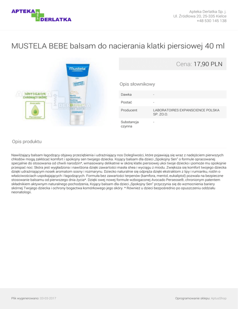 Apteka Derlatka Sp. j. Ul. Źródłowa 20, 25-335 Kielce +48 530 145 138 MUSTELA BEBE balsam do nacierania klatki piersiowej 40 ml Cena: 17,90 PLN Opis słownikowy Dawka - Postać - Producent LABORATOIRES EXPANSCIENCE POLSKA SP. ZO.O. Substancja czynna - Opis produktu Nawilżający balsam łagodzący objawy przeziębienia i udrażniający nos Dolegliwości, które pojawiają się wraz z nadejściem pierwszych chłodów mogą zakłócać komfort i spokojny sen twojego dziecka. Kojący balsam dla dzieci „Spokojny Sen” o formule opracowanej specjalnie do stosowania od chwili narodzin*, wmasowany delikatnie w skórę klatki piersiowej ukoi twoje dziecko i pomoże mu spokojnie przespać noc: Skóra jest wygładzona i nawilżona dzięki zawartości masła shea i wyciągu z miodu. Zwiększa się komfort twojego dziecka dzięki udrażniającym nosek aromatom sosny i rozmarynu. Dziecko naturalnie się odpręża dzięki ekstraktom z lipy i rumianku, roślin o właściwościach uspokajających i łagodzących. Formuła bez zawartości terpenów (kamfora, mentol, eukaliptol) pozwala na bezpieczne stosowanie balsamu od pierwszego dnia życia*. Dzięki swej nowej formule wzbogaconej Avocado Perseose®, chronionym patentem składnikiem aktywnym naturalnego pochodzenia, Kojący balsam dla dzieci „Spokojny Sen” przyczynia się do wzmocnienia bariery skórnej Twojego dziecka i ochrony bogactwa komórkowego jego skóry. * Również u dzieci bezpośrednio po opuszczeniu oddziału neonatologii. Plik wygenerowano: 03-03-2017 Powered by TCPDF (www.tcpdf.org) Oprogramowanie sklepu: AptusShop