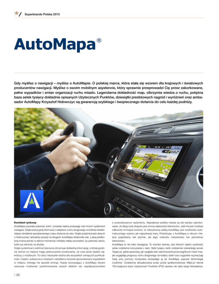 Superbrands Polska 2015 Gdy myślisz o nawigacji – myślisz o AutoMapie. O polskiej marce, która stała się wzorem dla krajowych i światowych producentów nawigacji. Myślisz o swoim mobilnym asystencie, który sprawnie przeprowadzi Cię przez zakorkowane, pełne wypadków i zmian organizacji ruchu miasto. Legendarna dokładność map, olbrzymia wiedza o ruchu, potężna baza setek tysięcy dokładnie opisanych Użytecznych Punktów, dziesiątki prestiżowych nagród i wyróżnień oraz ambasador AutoMapy Krzysztof Hołowczyc są gwarancją szybkiego i bezpiecznego dotarcia do celu każdej podróży. Kontekst rynkowy AutoMapa pozwala pokonać korki i posiada realną przewagę nad innymi systemami nawigacji. Dzięki precyzyjnej informacji o natężeniu ruchu drogowego umożliwia dokładniejsze określenie spodziewanego czasu dotarcia do celu. Dzięki potężnej bazie danych o historycznej i aktualnej sytuacji na drogach AutoMapa doskonale wie, z jaką predkością można jechać w danym momencie i którędy należy prowadzić, by pokonać zatory, korki czy remonty na drodze. Dzięki systemowi LiveDrive! kierowca otrzymuje dokładną informację, o której godzinie dotrze na miejsce mając jednocześnie przekonanie, że czas jazdy będzie najkrótszy z możliwych. To rzecz niezwykle istotna dla wszystkich ceniących punktualność. Często, zwłaszcza w miastach, natrafiamy na korek spowodowany wypadkiem w miejscu, którego nie sposób ominąć. Każdy korzystający z AutoMapy doceni wówczas możliwość poinformowania swoich bliskich lub współpracowników / 20 o przewidywanym opóźnieniu. Największe polskie miasta są tak bardzo zakorkowane, że długi czas dojazdu jest zmorą większości kierowców. Jeśli nie jest możliwe całkowite ominięcie korków, to nieocenioną zaletą AutoMapy jest możliwość automatycznego wyboru jak najszybszej trasy. Podróżując z AutoMapą w obcym mieście pojedziemy tak płynnie, jak jego rodowity mieszkaniec lub zawodowy taksówkarz. AutoMapa to nie tylko nawigacja. To również serwisy, bez których ciężko wyobrazić sobie codzienne korzystanie z sieci. Setki tysięcy osób codziennie odwiedzają serwis Targeo.pl, gdzie sprawdzą, jak wygląda stan zakorkowania poszczególnych miast i tras, jak wyglądają prognozy ruchu drogowego na kolejny dzień oraz wygodnie wyznaczają trasę przy pomocy komputera przesyłając ją do AutoMapy poprzez technologię LiveDrive!. Codziennie aktualizowana przez portal społecznościowy Miplo.pl niemal 750-tysięczna baza Użytecznych Punktów (POI) zawiera nie tylko bazę fotoradarów, automapa Od początku swojego istnienia AutoMapa dostępna była na urządzenia PND oraz palmtopy z systemem Windows Mobile. W 2010 roku pojawiła się wersja dla iPhone i iPada, a dwa lata później wersja dla systemu Android, która w ciągu 24 godzin stała się najbardziej dochodową aplikacją w polskim Google Play. Aktualnie wszystkie wersje AutoMapy są jednymi z najlepiej sprzedających się aplikacji w Polsce. W 2012 roku AutoMapa pojawiła się jako element systemu SMOK w wozach bojowych wszystkich 16 wojewódzkich Komend Państwowej Straży Pożarnej, dwa lata później wprowadziła obsługę kodów lotnisk w standardach IATA/ ICAO. niebezpiecznych miejsc czy stacji benzynowych, lecz także bazy hotelowe, gastronomiczne i inne, zgromadzone w ponad tysiącu kategorii tematycznych. Historia Marki Pojawienie się AutoMapy w 2003 roku było rewolucją na polskim rynku motoryzacyjnym. Polscy kierowcy po raz pierwszy mogli się przekonać, jak wygodnie można podróżować bez papierowych map. Przez lata obecności na rynku AutoMapa stała się wyznacznikiem jakości, dokładności i precyzji nawigacji, a samo słowo AutoMapa – synonimem nawigacji. W ciągu ostatnich dwunastu lat AutoMapa nieustannie wyznaczała kierunki rozwoju nawigacji nie tylko w Polsce, lecz także na świecie. W momencie rynkowej premiery w 2003 roku, AutoMapa jako pierwsza nawigacja wprowadziła obrysy budynków i przypisała do nich dokładne punkty adresowe, które obecnie są niezbędnym elementem w większości systemów nawigacyjnych. Już w 2005 roku w AutoMapie pojawiło się ostrzeganie o radarach i fotoradarach oraz innych Użytecznych Punktach. Również to rozwiązanie jest jednym z najczęściej wykorzystywanych w nawigacji GPS na całym świecie. Rok później uruchomiony został serwis Targeo.pl umożliwiający korzystanie z AutoMapy w Internecie. W 2007 roku AutoMapa udostępniła na swoich mapach trójwymiarowe wizualizacje budynków w polskich i europejskich miastach i miejscowościach, które natychmiast stały się jej znakiem rozpoznawczym. Dwa lata później, w 2009 roku, AutoMapa jako pierwsza nawigacja w Polsce i jedna z pierwszych na świecie wprowadziła system wyznaczania tras w oparciu o aktualne natężenie ruchu drogowego bazujące na najnowocześniejszej technologii IP Traffic, dzięki której informacje o korkach, remontach, zmianach kierunkowości dróg czy nowo otwieranych drogach przekazywane są do AutoMapy poprzez Internet. Równocześnie, jako pierwsza w Polsce umożliwiła wyznaczanie tras dla pojazdów ciężarowych z uwzględnieniem ich wymiarów, masy, nośności drogi, mostów i wiaduktów i wysokości tuneli oraz uruchomiła ostrzeganie o 500 najniebezpieczniejszych strefach na polskich drogach przygotowanych wspólnie z Komendą Główną Policji oraz Fundacją Krzysztofa Hołowczyca „Kierowca Bezpieczny”. Osiągnięcia Przez ponad 12 lat istnienia AutoMapa i jej producenci otrzymali dziesiątki prestiżowych nagród i wyróżnień zarówno w niezależnych rankingach prasowych, konkursach, jak i testach. Marka AutoMapa na trwale wpisała się w obraz Polski i jest w języku potocznym synonimem nawigacji. Od wielu lat jest najczęściej nagradzanym i najchętniej kupowanym programem do nawigacji GPS. Jednak największą wartością AutoMapy są jej aktywni użytkownicy. Potencjałem prawdziwym, s