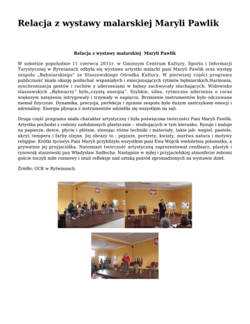 Relacja z wystawy malarskiej Maryli Pawlik Relacja z wystawy malarskiej Maryli Pawlik W sobotnie popołudnie 11 czerwca 2011r. w Gminnym Centrum Kultury, Sportu i Informacji Turystycznej w Rytwianach odbyła się wystawa artystki malarki pani Maryli Pawlik oraz występ zespołu „Bębniarskiego” ze Staszowskiego Ośrodka Kultury. W pierwszej części programu publiczność miała okazję posłuchać wspaniałych i emocjonujących rytmów bębniarskich.Harmonia, synchronizacja gestów i ruchów z uderzeniami w bębny zachwycały słuchających. Widowisko staszowskich „Bębniarzy” było„czystą energią”. Szybkie, silne, rytmiczne uderzenia o coraz większym natężeniu intrygowały i trzymały w napięciu. Brzmienie instrumentów było odczuwane niemal fizycznie. Dynamika, precyzja, perfekcja i zgranie zespołu było dużym zastrzykiem emocji i adrenaliny. Energia płynąca z instrumentów udzieliła się wszystkim na sali. Druga część programu miała charakter artystyczny i była poświęcona twórczości Pani Maryli Pawlik. Artystka pochodzi z rodziny uzdolnionych plastycznie – studiujących w tym kierunku. Rysuje i maluje na papierze, desce, płycie i płótnie, stosując różne techniki i materiały, takie jak: węgiel, pastele, akryl, tempera i farby olejne. Jej obrazy to : pejzaże, portrety, kwiaty, martwa natura i motywy religijne. Krótki życiorys Pani Maryli przybliżyła wszystkim pani Ewa Wójcik wieloletnia polonistka, a prywatnie jej przyjaciółka. Natomiast twórczość artystyczną zaprezentował rzeźbiarz, plastyk i rysownik staszowski pan Władysław Sadłocha. Następnie w miłej i przyjacielskiej atmosferze zebrani goście toczyli miłe rozmowy i snuli refleksje nad sztuką pośród zgromadzonych na wystawie dzieł. Źródło: GCK w Rytwianach. Gmina Rytwiany - www.rytwiany.com.pl