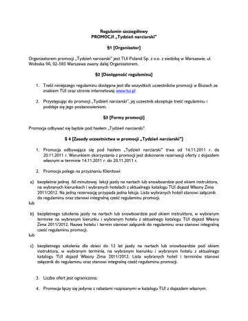 Regulamin szczegółowy PROMOCJI „Tydzień narciarski” §1 [Organizator] Organizatorem promocji „Tydzień narciarski” jest TUI Poland Sp. z o.o. z siedzibą w Warszawie, ul. Wołoska 9A, 02-583 Warszawa zwany dalej Organizatorem. §2 [Dostępność regulaminu] 1. Treść niniejszego regulaminu dostępna jest dla wszystkich uczestników promocji w Biurach ze znakiem TUI oraz stronie internetowej www.tui.pl 2. Przystępując do promocji „Tydzień narciarski”, jej uczestnik akceptuje treść regulaminu i poddaje się jego postanowieniom. §3 [Formy promocji] Promocja odbywać się będzie pod hasłem „Tydzień narciarski”. § 4 [Zasady uczestnictwa w promocji „Tydzień narciarski”] 1. Promocja odbywająca się pod hasłem „Tydzień narciarski” trwa od 14.11.2011 r. do 20.11.2011 r. Warunkiem skorzystania z promocji jest dokonanie rezerwacji oferty z dojazdem własnym w terminie 14.11.2011 r. do 20.11.2011 r. 2. Promocja polega na przyznaniu Klientowi: a) bezpłatnie jednej 60 minutowej lekcji jazdy na nartach lub snowboardzie pod okiem instruktora, na wybranych kierunkach i wybranych hotelach z aktualnego katalogu TUI dojazd Własny Zima 2011/2012. Na jedną rezerwację przypada jedna lekcja. Lista wybranych hoteli stanowi załącznik do regulaminu oraz stanowi integralną cześć regulaminu promocji. lub b) bezpłatnego szkolenia jazdy na nartach lub snowboardzie pod okiem instruktora, w wybranym terminie na wybranym kierunku i wybranym hotelu z aktualnego katalogu TUI dojazd Własny Zima 2011/2012. Nazwa hotelu i termin stanowi załącznik do regulaminu oraz stanowi integralną cześć regulaminu promocji. lub c) bezpłatnego szkolenia dla dzieci do 12 lat jazdy na nartach lub snowboardzie pod okiem instruktora, w wybranym terminie, na wybranym kierunku i wybranym hotelu z aktualnego katalogu TUI dojazd Własny Zima 2011/2012. Lista wybranych hoteli i terminów stanowi załącznik do regulaminu oraz stanowi integralną cześć regulaminu promocji. 3. Liczba ofert jest ograniczona. 4. Promocja łączy się jedynie z rabatami rozpisanymi w katalogu TUI z dojazdem własnym. § 5 [Skutki zmiany rezerwacji] W przypadku rezygnacji z podróży lub zmian dokonywanych już po zarezerwowaniu wycieczki przez uczestnika promocji, zastosowanie mają Ogólne warunki umowy o zorganizowanie imprezy turystycznej TUI Poland. § 6 [Reklamacje] Wszystkie roszczenia, reklamacje, uwagi i zastrzeżenia do przebiegu promocji można składać wyłącznie pisemnie na adres Organizatora. Forma pisemna czynności, o której mowa w zdaniu poprzednim jest zastrzeżona pod rygorem nieważności. § 7 [Postanowienia końcowe] 1. W zakresie nie uregulowanym niniejszym regulaminem stosuje się ogólne warunki umowy o zorganizowanie imprezy turystycznej obowiązujące u Organizatora w dniu zawarcia umowy. 2. Wszelkie spory związane z niniejszą promocja będą rozstrzygane przez właściwe rzeczowo sądy Powszechne dla miasta Warszawy. Załącznik numer 1 PROMOCJA TYDZIEN NARCIARSKI Czas trwania: 14.11.-20.11.11 1 godzinna lekcja z instruktorem gratis Kod Ort Region destynac Kod hotelu Hotel ji INN 12061 Hotel Happy Stubai Neustift im Stubaital Tirol INN 12062 Hotel Burgstall Neustift im Stubaital Tirol INN 12063 Wellnesshotel Milderer Hof Neustift im Stubaital Tirol INN 12064 Activehotel Bergkönig Neustift im Stubaital Tirol INN 12066 Alpenhotel Kindl Neustift im Stubaital Tirol INN 12071 Sporthotel Neustift Neustift im Stubaital Tirol INN 12073 Hotel Garni Sonne Neustift im Stubaital Tirol INN 12077 Hotel Pension Alpenwelt Neustift im Stubaital Tirol INN 31062 Hotel Tirolerhof Fulpmes Tirol INN 31064 Hotel Stubaierhof Fulpmes Tirol INN 36059 Hotel Wiesenhof Mieders Tirol BZO 23052 Rezydencja Kurz Maso Corto Dolomity/Połudnowy Tyrol BZO 23053 Hotel Gerstgras Maso Corto Dolomity/Połudnowy Tyrol BZO 23054 Hotel Senales Maso Corto Dolomity/Połudnowy Tyrol MXP VCE VCE VCE BZO 11040/11041 Aquaseria 63161 63161 63161 1001 Szkolnie z instruktorem gratis dla wszystkich - SNOW MUSIC SHOW Ponte di Legano 3-10.12.2011 Szkolnie z instruktorem gratis dla dzieci do 12 lat - FERIE Z BFC MOLINO Falcade 14-21.01.2012 MOLINO Falcade 28.01-04.02.2012 MOLINO Falcade 04-11.02.2012 VALGRANDA Zoldo 11-18.02.2012 Land kod rezerwacji instructor/szkolen ie Austria Austria Austria Austria Austria Austria Austria Austria Austria Austria Austria Wlochy Wlochy Wlochy INNZSA01 Wlochy MXPZSI01/02 Wlochy Wlochy Wlochy Wlochy VCEZSI02/03 INNZSA01 INNZSA01 INNZSA01 INNZSA01 INNZSA01 INNZSA01 INNZSA01 INNZSA01 INNZSA01 INNZSA01 BZOZSA01 BZOZSA01 BZOZSA01 VCEZSI02/03 VCEZSI02/03 BZOZSI02/03
