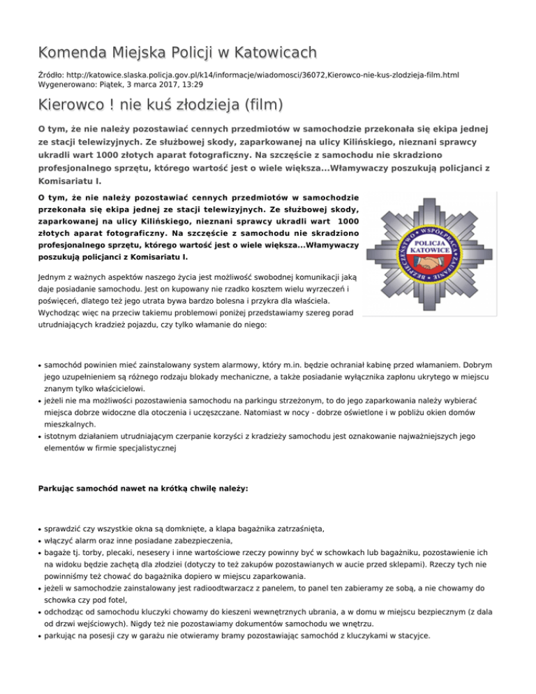 Komenda Miejska Policji w Katowicach Źródło: http://katowice.slaska.policja.gov.pl/k14/informacje/wiadomosci/36072,Kierowco-nie-kus-zlodzieja-film.html Wygenerowano: Piątek, 3 marca 2017, 13:29 Kierowco ! nie kuś złodzieja (film) O tym, że nie należy pozostawiać cennych przedmiotów w samochodzie przekonała się ekipa jednej ze stacji telewizyjnych. Ze służbowej skody, zaparkowanej na ulicy Kilińskiego, nieznani sprawcy ukradli wart 1000 złotych aparat fotograficzny. Na szczęście z samochodu nie skradziono profesjonalnego sprzętu, którego wartość jest o wiele większa...Włamywaczy poszukują policjanci z Komisariatu I. O tym, że nie należy pozostawiać cennych przedmiotów w samochodzie przekonała się ekipa jednej ze stacji telewizyjnych. Ze służbowej skody, zaparkowanej na ulicy Kilińskiego, nieznani sprawcy ukradli wart 1000 złotych aparat fotograficzny. Na szczęście z samochodu nie skradziono profesjonalnego sprzętu, którego wartość jest o wiele większa...Włamywaczy poszukują policjanci z Komisariatu I. Jednym z ważnych aspektów naszego życia jest możliwość swobodnej komunikacji jaką daje posiadanie samochodu. Jest on kupowany nie rzadko kosztem wielu wyrzeczeń i poświęceń, dlatego też jego utrata bywa bardzo bolesna i przykra dla właściela. Wychodząc więc na przeciw takiemu problemowi poniżej przedstawiamy szereg porad utrudniających kradzież pojazdu, czy tylko włamanie do niego: ● samochód powinien mieć zainstalowany system alarmowy, który m.in. będzie ochraniał kabinę przed włamaniem. Dobrym jego uzupełnieniem są różnego rodzaju blokady mechaniczne, a także posiadanie wyłącznika zapłonu ukrytego w miejscu znanym tylko właścicielowi. ● jeżeli nie ma możliwości pozostawienia samochodu na parkingu strzeżonym, to do jego zaparkowania należy wybierać miejsca dobrze widoczne dla otoczenia i uczęszczane. Natomiast w nocy - dobrze oświetlone i w pobliżu okien domów mieszkalnych. ● istotnym działaniem utrudniającym czerpanie korzyści z kradzieży samochodu jest oznakowanie najważniejszych jego elementów w firmie specjalistycznej Parkując samochód nawet na krótką chwilę należy: ● sprawdzić czy wszystkie okna są domknięte, a klapa bagażnika zatrzaśnięta, ● włączyć alarm oraz inne posiadane zabezpieczenia, ● bagaże tj. torby, plecaki, nesesery i inne wartościowe rzeczy powinny być w schowkach lub bagażniku, pozostawienie ich na widoku będzie zachętą dla złodziei (dotyczy to też zakupów pozostawianych w aucie przed sklepami). Rzeczy tych nie powinniśmy też chować do bagażnika dopiero w miejscu zaparkowania. ● jeżeli w samochodzie zainstalowany jest radioodtwarzacz z panelem, to panel ten zabieramy ze sobą, a nie chowamy do schowka czy pod fotel, ● odchodząc od samochodu kluczyki chowamy do kieszeni wewnętrznych ubrania, a w domu w miejscu bezpiecznym (z dala od drzwi wejściowych). Nigdy też nie pozostawiamy dokumentów samochodu we wnętrzu. ● parkując na posesji czy w garażu nie otwieramy bramy pozostawiając samochód z kluczykami w stacyjce. Podróżując samochodem przede wszystkim nie powinniśmy: ● pozostawiać torebek, neseserów, plecaków i innych rzeczy wartościowych na fotelu pasażera czy kanapie z tyłu, ● zabierać autostopowiczów z miejsc podejrzanych, czy osób przypadkowo poznanych podczas postoju; ● zatrzymywać się w miejscach nieoświetlonych, zalesionych czy na pustkowiu; ● pozostawiać auta na postoju bez nadzoru szczególnie, gdy bagaż widoczny jest przez jego szyby; Pamiętaj! Dokładnie rozważ wszelkie próby zatrzymania Cię przez innych użytkowników drogi np. sygnalizujących usterkę Twojego auta. Może to być próba napadu. Lepiej dojechać do najbliższej, większej stacji benzynowej i tam sprawdzić pojazd. Ocena: 0/5 (0) Tweetnij