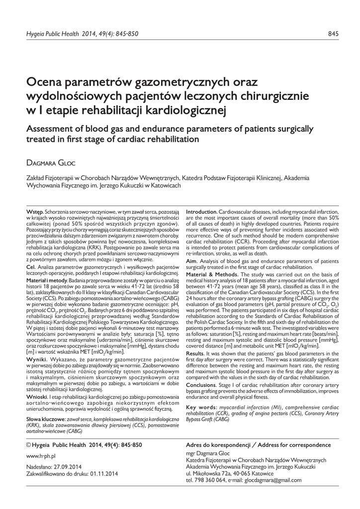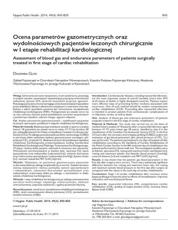 Gloc D. Public Hygeia Ocena Health parametrów 2014, 49(4): gazometrycznych 845-850 oraz wydolnościowych pacjentów leczonych chirurgicznie ... 845 Ocena parametrów gazometrycznych oraz wydolnościowych pacjentów leczonych chirurgicznie w I etapie rehabilitacji kardiologicznej Assessment of blood gas and endurance parameters of patients surgically treated in first stage of cardiac rehabilitation Dagmara Gloc Zakład Fizjoterapii w Chorobach Narządów Wewnętrznych, Katedra Podstaw Fizjoterapii Klinicznej, Akademia Wychowania Fizycznego im. Jerzego Kukuczki w Katowicach Wstęp. Schorzenia sercowo-naczyniowe, w tym zawał serca, pozostają w krajach wysoko rozwiniętych najważniejszą przyczyną śmiertelności całkowitej (ponad 50% spośród wszystkich przyczyn zgonów). Pozostający przy życiu chorzy wymagają coraz skuteczniejszych sposobów przeciwdziałania dalszym zdarzeniom związanym z nawrotem choroby. Jednym z takich sposobów powinna być nowoczesna, kompleksowa rehabilitacja kardiologiczna (KRK). Postępowanie po zawale serca ma na celu ochronę chorych przed powikłaniami sercowo-naczyniowymi z powtórnym zawałem, udarem mózgu i zgonem włącznie. Cel. Analiza parametrów gazometrycznych i wysiłkowych pacjentów leczonych operacyjnie, poddanych I etapowi rehabilitacji kardiologicznej. Materiał i metody. Badania przeprowadzone zostały w oparciu o analizę historii 18 pacjentów po zawale serca w wieku 41-72 lat (średnio 58 lat), zaklasyfikowanych do II klasy w klasyfikacji Canadian Cardiovascular Society (CCS). Po zabiegu pomostowania aortalno-wieńcowego (CABG) w pierwszej dobie wykonano badanie gazometryczne oceniające: pH, prężność CO2, prężność O2. Badanych przez 6 dni poddawano szpitalnej rehabilitacji kardiologicznej przeprowadzanej według Standardów Rehabilitacji Kardiologicznej Polskiego Towarzystwa Kardiologicznego. W piątej i szóstej dobie pacjenci wykonali 6-minutowy test marszowy. Wartościami porównywanymi w analizie były: saturacja [%], tętno spoczynkowe oraz maksymalne [uderzenia/min], ciśnienie skurczowe oraz rozkurczowe spoczynkowe i maksymalne [mmHg], dystans chodu [m] i wartość wskaźnika MET [mlO2/kg/min]. Wyniki. Wykazano, że parametry gazometryczne pacjentów w pierwszej dobie po zabiegu znajdowały się w normie. Zaobserwowano istotną statystycznie różnicę pomiędzy tętnem spoczynkowym i maksymalnym, ciśnieniem skurczowym spoczynkowym oraz maksymalnym w pierwszej dobie po zabiegu, a wartościami w dobie szóstej rehabilitacji kardiologicznej. Wnioski. I etap rehabilitacji kardiologicznej po zabiegu pomostowania aortalno-wieńcowego zapobiega niekorzystnym efektom unieruchomienia, poprawia wydolność i ogólną sprawność fizyczną. Słowa kluczowe: zawał serca, kompleksowa rehabilitacja kardiologiczna (KRK), skala zaawansowania dławicy piersiowej (CCS), pomostowanie aortalno-wieńcowe (CABG) Introduction. Cardiovascular diseases, including myocardial infarction, are the most important causes of overall mortality (more than 50% of all causes of death) in highly developed countries. Patients require more effective ways of preventing further incidents associated with recurrence. One of such method should be modern comprehensive cardiac rehabilitation (CCR). Proceeding after myocardial infarction is intended to protect patients from cardiovascular complications of re-infarction, stroke, as well as death. Aim. Analysis of blood gas and endurance parameters of patients surgically treated in the first stage of cardiac rehabilitation. Material & Methods. The study was carried out on the basis of medical history analysis of 18 patients after a myocardial infarction, aged between 41-72 years (mean age 58 years), classified as class II in the classification of the Canadian Cardiovascular Society (CCS). In the first 24 hours after the coronary artery bypass grafting (CABG) surgery the evaluation of gas blood parameters (pH, partial pressure of CO2, O2) was performed. The patients participated in six days of hospital cardiac rehabilitation according to the Standards of Cardiac Rehabilitation of the Polish Cardiac Society. In the fifth and sixth day of rehabilitation the patients performed a 6-minute walk test. The investigated variables were as follows: saturation [%], resting and maximum heart rate [beats/min], resting and maximum systolic and diastolic blood pressure [mmHg], covered distance [m] and metabolic unit MET [mlO2/kg/min]. Results. It was shown that the patients’ gas blood parameters in the first day after surgery were correct. There was a statistically significant difference between the resting and maximum heart rate, the resting and maximum systolic blood pressure in the first day after surgery as compared with the values in the sixth day of cardiac rehabilitation. Conclusions. Stage I of cardiac rehabilitation after coronary artery bypass grafting prevents the adverse effects of immobilization, improves endurance and overall physical fitness. Key words: myocardial infarction (MI), comprehensive cardiac rehabilitation (CCR), grading of angina pectoris (CCS), Coronary Artery Bypass Graft (CABG) © Hygeia Public Health 2014, 49(4): 845-850 Adres do korespondencji / Address for correspondence www.h-ph.pl mgr Dagmara Gloc Katedra Fizjoterapii w Chorobach Narządów Wewnętrznych Akademia Wychowania Fizycznego im. Jerzego Kukuczki ul. Mikołowska 72a, 40-065 Katowice tel. 798 360 064, e-mail: [email protected] Nadesłano: 27.09.2014 Zakwalifikowano do druku: 01.11.2014 846 Wykaz skrótów CABG – (coronary artery bypass graft) pomostowanie aortalno-wieńcowe skala CCS – (Canadian Cardiovascular Society grading of angina pectoris) skala zaawansowania dławicy piersiowej HDL – (high density lipoprotein) lipoproteiny osocza krwi o wysokiej gęstości (tzw. dobry cholesterol) HR – (heart rate) częstotliwość rytmu serca LDL – (low density lipoprotein) lipoproteiny osocza krwi o niskiej gęstości (tzw. zły 