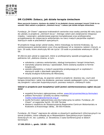 DR CLOWN: Zobacz, jak działa terapia śmiechem Masz poczucie humoru, dystans do siebie? A na dodatek chcesz pomagać innym? Zrób to na wesoło! Weź udział w projekcie „Uśmiech leczy” i zobacz jak działa terapia śmiechem. Fundacja „Dr Clown” zaprasza krakowskich seniorów oraz osoby poniżej 60 roku życia do udziału w projekcie „Uśmiech leczy”, którego celem jest zwiększenie integracji między- i wewnątrz- pokoleniowej poprzez kompleksowe oraz profesjonalne przygotowanie do rozpoczęcia wolontariatu na rzecz małych pacjentów szpitali i starszych osób w placówkach specjalnych. W projekcie mogą wziąć udział osoby, które mieszkają na terenie Krakowa, są zainteresowane wolontariatem oraz chcą spróbować sił w niesieniu radości chorym, w tym: 20 osób, które ukończyły 60 rok życia i 10 osób w przedziale wiekowym 19-59 lat. W ofercie jest udział w zajęciach, które w profesjonalny sposób przygotują do pełnienia roli „doktora clowna, w tym: szkolenia z zakresu wolontariatu, obsługi komputera i terapii śmiechem, warsztaty pisania wierszy i opowiadań, które zostaną wydane w formie książeczek, wesołe odwiedziny u małych pacjentów przebywających w szpitalach i starszych osób z placówek specjalnych, wizytę studyjno-kulturalną do Warszawy. Organizatorzy gwarantują, że poprzez udział w projekcie: dowiesz się, czym jest terapia śmiechem i jakie ma działanie, poznasz zasady pedagogiki cyrku, nauczysz się żonglerki i sztuczek iluzjonistycznych, poznasz nowych, ciekawych ludzi. Udział w projekcie jest bezpłatny! Jeśli jesteś zainteresowana/y zgłoś się już dziś! wypełnij formularz zgłoszeniowy online: www.bit.ly/usmiechleczy-formularz pobierz formularz i prześlij na adres mailowy: mailto:[email protected] wyślij formularz zgłoszeniowy pocztą tradycyjną na adres: Fundacja „Dr Clown” ul.Legionów 5a/10, 33-100 Tarnów dostarcz osobiście do Stowarzyszenia Regionalne Centrum Wolontariatu w Krakowie ul.Krasickiego 18/IIp., 30-503 Kraków. Fundacja „Dr Clown” zaprasza do udziału w otwartych spotkaniach informacyjnych na temat projektu, które odbędą się w Wojewódzkim Specjalistycznym Szpitalu Dziecięcym im. św. Ludwika, ul. Strzelecka 2 (sala konferencyjna) w dwóch terminach: 17.08.2016 r., godz. 18:00 - 19:00, 19.08.2016 r., godz. 9:00 - 10:00. Wstęp wolny, a rejestracja nie jest wymagana. Więcej informacji na temat otwartych spotkań udziela Magdalena Lis - koordynator projektu, tel. 694 400 073, email: mailto:[email protected]. Więcej informacji na temat projektu można znaleźć na stronie www.bit.ly/usmiechleczy lub poprzez kontakt z Espertem ds. wolontariatu – Anną Rodacką – telefonicznie 603 33 42 52 lub mailowo: mailto:[email protected] Zgłoszenia przyjmowane są do 23 sierpnia 2016r.! Do pobrania: Regulamin projektu Formularz zgłoszeniowy Powered by TCPDF (www.tcpdf.org)