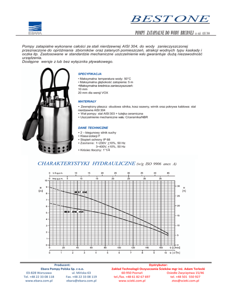 BEST ONE POMPY ZATAPIALNE DO WODY BRUDNEJ ze stali AISI 304 Pompy zatapialne wykonane całości ze stali nierdzewnej AISI 304, do wody zanieczyszczonej przeznaczone do opróżniania zbiorników oraz zalanych pomieszczeń, atrakcji wodnych typu kaskady i oczka itp. Zastosowane w standardzie mechaniczne uszczelnienie wału gwarantuje dużą niezawodność urządzenia. Dostępne wersje z lub bez wyłącznika pływakowego. SPECYFIKACJA • Maksymalna temperatura wody: 50°C • Maksymalna głębokość zatopienia: 5 m •Maksymalna średnica zanieczyszczeń: 10 mm 20 mm dla wersji VOX MATERIAŁY • Zewnętrzny płaszcz obudowa silnika, kosz ssawny, wirnik oraz pokrywa kablowa: stal nierdzewne AISI 304 • Wał pompy: stal AISI 303 + tulejka ceramiczna • Uszczelnienie mechaniczne wału: C/ceramika/NBR DANE TECHNICZNE • 2 – biegunowy silnik suchy • Klasa izolacji F • Stopień ochrony IP 68 • Zasilanie: 1~230V + _10%, 50 Hz 3~400V, + _10%, 50 Hz • Króciec tłoczny: 1”1/4 CHARAKTERYSTYKI HYDRAULICZNE (w/g Producent: Ebara Pompy Polska Sp. z o.o. 03-828 Warszawa ul. Mińska 63 Tel. +48 22 33 08 118 Fax. +48 22 33 08 119 www.ebara.com.pl [email protected] ISO 9906 anex A) Dystrybutor: Zakład Technologii Oczyszczania Ścieków mgr inż. Adam Terlecki 60-950 Poznań Osiedle Zwycięstwa 15/46 1tel./fax. +48 61 82 67 697 tel. +48 501 550 927 www.scieki.com.pl [email protected] BEST ONE POMPY ZATAPIALNE DO WODY BRUDNEJ ze stali AISI 304 Producent: Ebara Pompy Polska Sp. z o.o. 03-828 Warszawa ul. Mińska 63 Tel. +48 22 33 08 118 Fax. +48 22 33 08 119 www.ebara.com.pl [email protected] Dystrybutor: Zakład Technologii Oczyszczania Ścieków mgr inż. Adam Terlecki 60-950 Poznań Osiedle Zwycięstwa 15/46 1tel./fax. +48 61 82 67 697 tel. +48 501 550 927 www.scieki.com.pl [email protected]