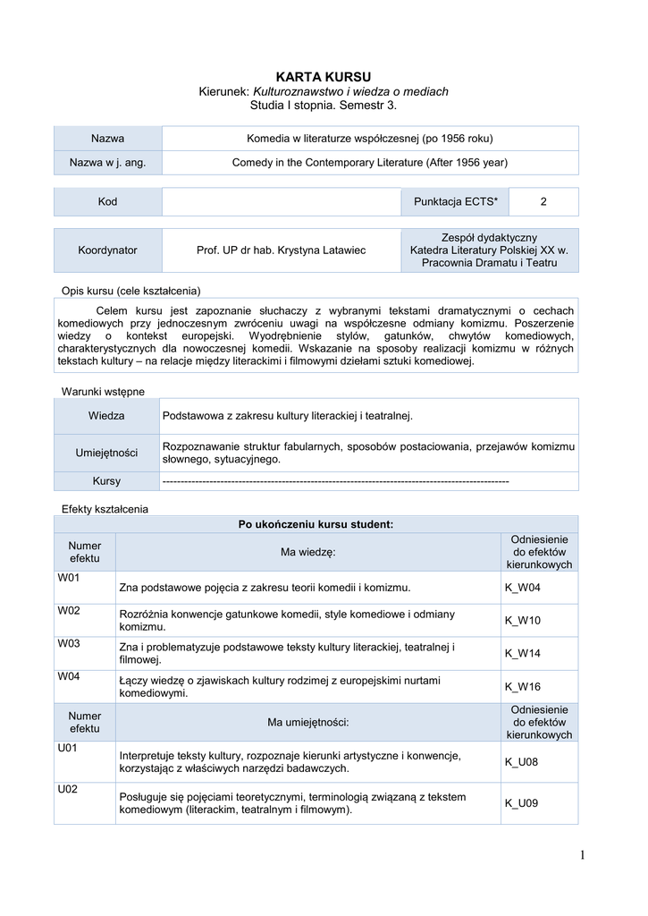 KARTA KURSU Kierunek: Kulturoznawstwo i wiedza o mediach Studia I stopnia. Semestr 3. Nazwa Komedia w literaturze współczesnej (po 1956 roku) Nazwa w j. ang. Comedy in the Contemporary Literature (After 1956 year) Kod Punktacja ECTS* Koordynator Prof. UP dr hab. Krystyna Latawiec 2 Zespół dydaktyczny Katedra Literatury Polskiej XX w. Pracownia Dramatu i Teatru Opis kursu (cele kształcenia) Celem kursu jest zapoznanie słuchaczy z wybranymi tekstami dramatycznymi o cechach komediowych przy jednoczesnym zwróceniu uwagi na współczesne odmiany komizmu. Poszerzenie wiedzy o kontekst europejski. Wyodrębnienie stylów, gatunków, chwytów komediowych, charakterystycznych dla nowoczesnej komedii. Wskazanie na sposoby realizacji komizmu w różnych tekstach kultury – na relacje między literackimi i filmowymi dziełami sztuki komediowej. Warunki wstępne Wiedza Umiejętności Kursy Podstawowa z zakresu kultury literackiej i teatralnej. Rozpoznawanie struktur fabularnych, sposobów postaciowania, przejawów komizmu słownego, sytuacyjnego. ------------------------------------------------------------------------------------------------ Efekty kształcenia Po ukończeniu kursu student: Numer efektu W01 Ma wiedzę: Odniesienie do efektów kierunkowych Zna podstawowe pojęcia z zakresu teorii komedii i komizmu. K_W04 W02 Rozróżnia konwencje gatunkowe komedii, style komediowe i odmiany komizmu. K_W10 W03 Zna i problematyzuje podstawowe teksty kultury literackiej, teatralnej i filmowej. K_W14 W04 Łączy wiedzę o zjawiskach kultury rodzimej z europejskimi nurtami komediowymi. K_W16 Numer efektu U01 U02 Ma umiejętności: Odniesienie do efektów kierunkowych Interpretuje teksty kultury, rozpoznaje kierunki artystyczne i konwencje, korzystając z właściwych narzędzi badawczych. K_U08 Posługuje się pojęciami teoretycznymi, terminologią związaną z tekstem komediowym (literackim, teatralnym i filmowym). K_U09 1 U03 Przygotowuje wystąpienia ustne na temat sposobów przejawiania się K_U11 komizmu w tekstach dramatycznych z wykorzystaniem różnych źródeł wiedzy. Numer efektu K01 K02 Odniesienie do efektów kierunkowych Ma kompetencje społeczne: Student pogłębia świadomość różnorodności kultury współczesnej, integruje pozyskane informacje z innymi dziedzinami wiedzy. K_K06 Student uczestniczy w życiu kulturalnym, korzysta z jego form literackich i teatralnych. K_K13 Organizacja Forma zajęć Ćwiczenia w grupach Wykład (W) A Liczba godzin K L S P E 16 Opis metod prowadzenia zajęć Zajęcia wstępne poświęcone zapoznaniu słuchaczy z ogólną teorią komizmu jako wprowadzenie do estetyki śmiechu (śmieszności). Interpretacja wybranych utworów i problemów z zastosowaniem narzędzi z zakresu poetyki tekstu komediowego. Wypowiedzi ustne – wyodrębnianie, nazywanie przejawów komizmu, różnicowanie jego odmian. Porównywanie interpretacji, ocenianie ich jakości merytorycznej i językowej. Formułowanie argumentów, ich klasyfikowanie ze względu na skuteczność perswazyjną. Oglądanie fragmentów wybranych spektakli – omawianie gry aktorskiej, zamysłu interpretacyjnego reżysera, semantycznej funkcji znaków wizualnych. Dyskusja nad przygotowanymi przez studentów mikroprezentacjami. Kryteria oceny Inne Egzamin pisemny Egzamin ustny x x x x x x x x x Praca pisemna (esej) x x x x x x x x x Referat Udział w dyskusji Projekt indywidualny Praca laboratoryjna Zajęcia terenowe Ćwiczenia w szkole Projekt grupowy W01 W02 W03 W04 U01 U02 U03 K01 K02 Gry dydaktyczne E – learning Formy sprawdzania efektów kształcenia x x x x x x x x x Aktywność na zajęciach, sprawność komunikacyjna referatów i prezentacji, umiejętność pracy w grupie, oryginalność formułowanych argumentów i wniosków. 2 Uwagi Zajęcia łączą elementy teorii komizmu z praktyczną interpretacją tekstów kultury (literackiej i teatralnej), powstałych po 1956 roku, ewentualnie wcześniejszych, lecz w Polsce poznanych po tym roku, gdy rozluźnieniu uległy obowiązujące w czasach stalinizmu polityczne ograniczenia. Treści merytoryczne (wykaz tematów) -Funkcjonowanie terminu „komedia” w pracach badaczy. -Zarys historii i teorii gatunku. -Komizm jako kategoria światopoglądowa w XX wieku. -Mechanizmy komizmu, jego środowiskowe uwarunkowania (obyczaj, konwenans). -Rozróżnienia: farsa, tragikomedia, czarna komedia, komedia absurdalna, komedia zagrożenia. -Komediowy rodowód teatru absurdu (humor absurdalny). -Współczesna komedia a estetyka groteski. -Parodia konwencji romantycznych, parodia dramatu mieszczańskiego. Wykaz literatury podstawowej Teksty Dürrenmatt Friedrich, Romulus Wielki lub Wizyta starszej pani [w:] Friedrich Dürrenmatt, Teatr, przeł. Irena Krzywicka i inni, Warszawa 1972. Gombrowicz Witold, Operetka [w:] tegoż, Dramaty, Kraków 1988 i nast. Grochowiak Stanisław, Chłopcy [w:] tegoż, Dialogi, Warszawa 1975. Głowacki Janusz, Ścieki, skrzeki, karaluchy. Utwory prawie wszystkie, Warszawa 1996 (wybrany utwór) Głowacki Janusz, 5 ½. Dramaty, Warszawa 2007 (wybrany utwór). Koterski Marek, Życie wewnętrzne, „Dialog” 1987, nr 8 lub Dzień świra, „Dialog” 2000, nr 8. Wydanie książkowe: tegoż, Dzień świra, Izabelin 2002. Mrożek Sławomir, Zabawa, Na pełnym morzu [w:] tegoż, Utwory sceniczne, t. 1, Kraków 1973; Krawiec [w:] tegoż, Dzieła zebrane. Teatr 1-3, Warszawa 1995-1997. Nowakowski Doman, Ketchup Schroedera, Warszawa 2007. Schaeffer Bogusław, Utwory sceniczne, t. I-III, Salzburg 1992, 1994, 1998 (wybrany utwór). Wojcieszek Przemysław, Made in Poland, [w:] Made in Poland, oprac. Roman Pawłowski, Kraków 2006. Opracowania Błoński Jan, Historia i operetka [w:] Gombrowicz i krytycy, oprac. Zdzisław Łapiński, Kraków 1984. Błoński Jan, Mrożka droga do komedii [w:] tegoż, Romans z tekstem, Kraków 1981. Humor absurdalny w teatrze i w życiu. Rozmowy o dramacie, „Dialog” 1958, nr 8. Krajewska Anna, Komediowe rodowody absu