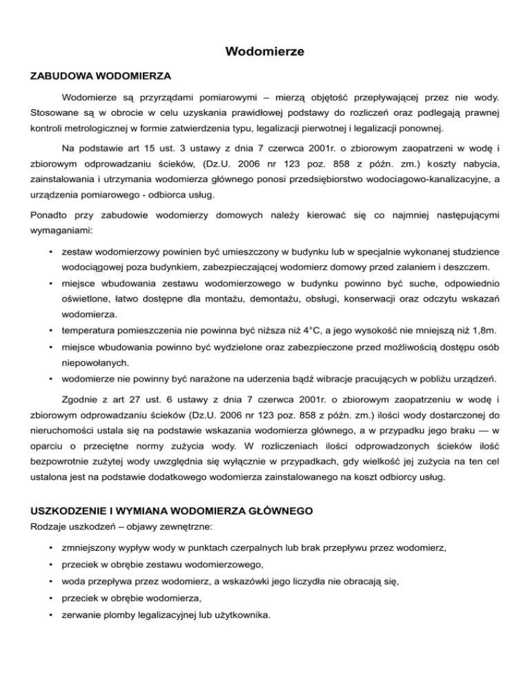 Wodomierze ZABUDOWA WODOMIERZA Wodomierze są przyrządami pomiarowymi – mierzą objętość przepływającej przez nie wody. Stosowane są w obrocie w celu uzyskania prawidłowej podstawy do rozliczeń oraz podlegają prawnej kontroli metrologicznej w formie zatwierdzenia typu, legalizacji pierwotnej i legalizacji ponownej. Na podstawie art 15 ust. 3 ustawy z dnia 7 czerwca 2001r. o zbiorowym zaopatrzeni w wodę i zbiorowym odprowadzaniu ścieków, (Dz.U. 2006 nr 123 poz. 858 z późn. zm.) koszty nabycia, zainstalowania i utrzymania wodomierza głównego ponosi przedsiębiorstwo wodociagowo-kanalizacyjne, a urządzenia pomiarowego - odbiorca usług. Ponadto przy zabudowie wodomierzy domowych należy kierować się co najmniej następującymi wymaganiami: • zestaw wodomierzowy powinien być umieszczony w budynku lub w specjalnie wykonanej studzience wodociągowej poza budynkiem, zabezpieczającej wodomierz domowy przed zalaniem i deszczem. • miejsce wbudowania zestawu wodomierzowego w budynku powinno być suche, odpowiednio oświetlone, łatwo dostępne dla montażu, demontażu, obsługi, konserwacji oraz odczytu wskazań wodomierza. • temperatura pomieszczenia nie powinna być niższa niż 4°C, a jego wysokość nie mniejszą niż 1,8m. • miejsce wbudowania powinno być wydzielone oraz zabezpieczone przed możliwością dostępu osób niepowołanych. • wodomierze nie powinny być narażone na uderzenia bądź wibracje pracujących w pobliżu urządzeń. Zgodnie z art 27 ust. 6 ustawy z dnia 7 czerwca 2001r. o zbiorowym zaopatrzeniu w wodę i zbiorowym odprowadzaniu ścieków (Dz.U. 2006 nr 123 poz. 858 z późn. zm.) ilości wody dostarczonej do nieruchomości ustala się na podstawie wskazania wodomierza głównego, a w przypadku jego braku — w oparciu o przeciętne normy zużycia wody. W rozliczeniach ilości odprowadzonych ścieków ilość bezpowrotnie zużytej wody uwzględnia się wyłącznie w przypadkach, gdy wielkość jej zużycia na ten cel ustalona jest na podstawie dodatkowego wodomierza zainstalowanego na koszt odbiorcy usług. USZKODZENIE I WYMIANA WODOMIERZA GŁÓWNEGO Rodzaje uszkodzeń – objawy zewnętrzne: • zmniejszony wypływ wody w punktach czerpalnych lub brak przepływu przez wodomierz, • przeciek w obrębie zestawu wodomierzowego, • woda przepływa przez wodomierz, a wskazówki jego liczydła nie obracają się, • przeciek w obrębie wodomierza, • zerwanie plomby legalizacyjnej lub użytkownika. Odbiorca nie ma prawa do naruszania plomb wodomierza, jego osłon, przemieszczania bez pisemnej zgody przedsiębiorstwa. O uszkodzeniu plomby lub wodomierza Odbiorca winien natychmiast powiadomić Dostawcę wody pisemnie lub telefonicznie. Klient pokrywa koszty naprawy lub wymiany wodomierza w przypadku gdy do uszkodzenia doszło z jego winy (np. uszkodzenia mechaniczne, zamarznięcie wodomierza). Kontakt: • Gospodarka Komunalna tel. /22/ 789-70-31 (poniedziałek-piątek w godz. od 7:30-15:30) LEGALIZACJA WODOMIERZY Wodomierz powinien mieć ważną i nienaruszoną cechę legalizacyjną. Zgodnie z rozporządzeniem Ministra Gospodarki, Pracy i Polityki Społecznej z dnia 2 kwietnia 2004 r. w sprawie prawnej kontroli metrologicznej przyrządów pomiarowych okres ważności cech legalizacji wodomierzy do wody zimnej, ciepłej i gorącej o nominalnym strumieniu objętości nie większym niż 500 m 3/h wynosi 5 lat. Okres ważności dowodu legalizacji wtórnej również obowiązuje 5 lat (załącznik nr 35 do rozporządzenia). Cecha legalizacyjna traci ważność przed upływem okresu w przypadku: • uszkodzenia wodomierza, • uszkodzenia cechy legalizacyjnej lub którejkolwiek z cech urzędu (zabezpieczających) • stwierdzenia, że błędy wskazań wodomierza przekraczają dopuszczalne błędy graniczne. Okresową legalizację wodomierzy zapewnia nieodpłatnie Dostawca wody. EKSPERTYZA WODOMIERZA W razie wątpliwości co do prawidłowości wskazań wodomierza Odbiorca wody może złożyć pisemny wniosek o wydanie ekspertyzy wodomierza. Zlecenie dokonania ekspertyzy (sprawdzenia) wodomierza można złożyć osobiście w siedzibie Gospodarki Komunalnej w Celestynowie przy ul. Reguckiej 5 lub przesłać faksem (tel./fax 22 789 70 52). Ekspertyzę wykonuje Okręgowy Urząd Miar w Warszawie i wydaje „Świadectwo Ekspertyzy”, w którym podaje wynik. Jeżeli wynik ekspertyzy wodomierza nie wykażą nieprawidłowego działania wodomierza pokrywa Odbiorca Usług (Wnioskodawca). W przypadku stwierdzenia w wyniku urzędowego sprawdzenia prawidłowości działania wodomierza, że wskazania wodomierza przekraczają błąd graniczny dopuszczalny, ilość faktycznie pobranej przez Odbiorcę Usług wody ustala się korygując ilość wskazaną przez wodomierz odpowiednio w dół lub w górę. Korekta obejmuje okres od daty wystąpienia nierzetelnego pomiaru, a jeżeli ustalenie tej daty nie jest możliwe, to od ostatniego odczytu wodomierza. WODOMIERZ OGRODOWY W przypadku używania wody do celów ogrodowych istnieje możliwość pomniejszenia ilości odprowadzanych ścieków. W tym celu należy złożyć pisemny wniosek o wydanie warunków zamontowania dodatkowego zestawu wodomierzowego - podlicznika i zgodnie z uzyskanymi warunkami zamontować na instalacji wewnętrznej w nieruchomości dodatkowy licznik jako podlicznik wodomierza głównego, przeznaczony do pomiaru ilości wody bezpowrotnie zużytej. Całość prac instalacyjnych, łącznie z zakupem wodomierza, ewentualną naprawą i ponowną legalizacją licznika wody (co 5 lat), wykonuje inwestor/właściciel nieruchomości na własny koszt. PRAWO WSTĘPU DO NIERUCHOMOŚCI ODBIORCÓW USŁUG. Zgodnie z art.7 ust. 1, 2 ustawy z dnia 7 czerwca 2001 r. o zbiorowym zaopatrzeniu w wodę i zbiorowym odprowadzaniu ścieków (Dz.U. z 2006 r. nr 123 poz. 858 z poźn. zm.) osoby reprezentujące Gospodarkę Komunalną w Celestynowie, po okazaniu legitymacji służbowej i pisemnego upoważnienia, mają prawo ws