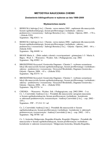 METODYKA NAUCZANIA CHEMII Zestawienie bibliograficzne w wyborze za lata 1999-2009 Wydawnictwa zwarte 1. BERECKA Jadwiga [i in.] : Chemia : nowa matura 2005 : suplement dla nauczyciela liceum ogólnokształcącego, liceum profilowanego i technikum : zakresy podstawowy i rozszerzony / Jadwiga Berecka [i in.]. - Gdynia : Operon, 2005. - 176 s. - (Szkoła XXI) Sygnatura : Mg 43411 / w 2. BERECKA Jadwiga [i in.] : Chemia : nowa matura 2006 : suplement dla nauczyciela liceum ogólnokształcącego, liceum profilowanego i technikum : zakresy podstawowy i rozszerzony / Jadwiga Berecka [i in.]. - Gdynia : Operon, 2005. - 64 s. (Szkoła XXI) Sygnatura : Mg 44440 / w 3. BIGOS Maria A. : Zbiór zadań z chemii z rozwiązaniami : gimnazjum 1-3 / Maria A. Bigos. -Wyd. 5. - Warszawa : Wydaw. Szk. i Pedagogiczne, cop. 2002 Sygnatura : Mg 42082 / w 4. BRODZIŃSKI Krzysztof, Gosiewska Dagmara : Chemia 2 : wybrane scenariusze lekcji dla nauczyciela liceum ogólnokształcącego, liceum profilowanego i technikum : zakresy - podstawowy i rozszerzony / Krzysztof Brodziński, Dagmara Gosiewska. Gdynia : Operon, 2004. - 43 s. - (Szkoła XXI) Sygnatura : Mg 43375 / w 5. BRODZIŃSKI Krzysztof, Gosiewska Dagmara : Chemia 3 : wybrane scenariusze lekcji dla nauczyciela liceum ogólnokształcącego, liceum profilowanego i technikum : zakresy - podstawowy i rozszerzony / Krzysztof Brodziński, Dagmara Gosiewska. Gdynia : Operon, 2004. - 46 s. - (Szkoła XXI) Sygnatura : Mg 43376 / w 6. CHEMIA . - Warszawa : Wydaw. Szk. i Pedagogiczne, cop. 2002-2004. - 3 cz. Cz. 1, Czerwiński Andrzej [i in.] : Poradnik dla nauczyciela i program nauczania w liceum ogólnokształcącym, liceum profilowanym i technikum : kształcenie w zakresach podstawowym, rozszerzonym / Andrzej Czerwiński [i in.]. - cop. 2002 239 s. Sygnatura : PIP – 37.214 / E / ud Cz. 2, Czerwiński Andrzej [i inn.] : Poradnik dla nauczyciela w liceum ogólnokształcącym, liceum profilowanym i technikum : kształcenie w zakresach podstawowym, rozszerzonym / Andrzej Czerwiński [i inn.]. - cop. 2002. - 145 s. Sygnatura : Mg 38788 / ud Cz. 3, Jeziorska Małgorzata, Rogulska Klaudia, Rogulski Zbigniew : Poradnik dla nauczyciela w liceum ogólnokształcącym, liceum profilowanym i technikum : kształcenie w zakresie rozszerzonym / Małgorzata Jeziorska, Klaudia Rogulska, Zbigniew Rogulski. - cop. 2004. - 133 s. Sygnatura : Mg 43007 / ud 7. CHEMIA : ćwiczenia do liceów i techników. - Warszawa : Krzysztof Pazdro, 2003. - 2 cz. Cz. 1 / Krzysztof M. Pazdro, Małgorzata Czaja. - 120 s. Sygnatura : Mg P-3117 / ud; Mg P-1293 / w Cz. 2 / Krzysztof M. Pazdro, Anna Rabajczyk. - 119 s. Sygnatura : Mg P-3118 / ud ; Mg P-1294 / w 8. DYDAKTYKa chemii / red. Andrzej Burewicz, Hanna Gulińska. - Wyd. 2 rozsz. – Poznań : Wydaw. Naukowe UAM, 2002. - 757 s. Sygnatura : Mg 36931 / w 9. GOBIS Ewa : Chemia 2 : przewodnik dla nauczyciela gimnazjum / Ewa Gobis. Gdynia : Operon, 2004. - 176 s. - (Szkoła XXI) Sygnatura : Mg 43401 / ud 10. GOBIS Ewa, Brychta Lidia : Chemia 1 : przewodnik dla nauczyciela gimnazjum / Ewa Gobis, Lidia Brychta. - Gdynia : Operon, 2004. - 168 s. - (Szkoła XXI) Sygnatura : Mg 42499 / ud 11. HEJWOWSKA Stanisława, Pajor Gabriela, Zielińska Alina : Chemia 1 : przewodnik dla nauczyciela liceum ogólnokształcącego, liceum profilowanego i technikum : zakresy - podstawowy i rozszerzony / Stanisława Hejwowska, Gabriela Pajor, Alina Zielińska. - Rumia : Operon, 2002. - 103 s. - (Szkoła XXI) Sygnatura : Mg 42373 / ud 12. HEJWOWSKA Stanisława, Pajor Gabriela, Zielińska Alina : Chemia 2 : chemia organiczna : przewodnik dla nauczyciela liceum ogólnokształcącego, liceum profilowanego i technikum : zakresy - podstawowy i rozszerzony / Stanisława Hejwowska, Gabriela Pajor, Alina Zielińska. - Gdynia : Operon, 2003. - 103 s. (Szkoła XXI) Sygnatura : Mg 42382 / ud 13. HEJWOWSKA Stanisława, Pajor Gabriela, Zielińska Alina : Chemia 3 : równowagi i procesy jonowe : przewodnik dla nauczyciela liceum ogólnokształcącego, liceum profilowanego i technikum : zakresy - podstawowy i rozszerzony / Stanisława Hejwowska, Gabriela Pajor, Alina Zielińska. - Gdynia : Operon, 2003. - 71 s. (Szkoła XXI) Sygnatura : Mg 42383 / ud ; Mg 42404 / w 14. HERRON Dudley James: Lekcja chemii : o skutecznym sposobie uczenia / James Dudley Herron. - Warszawa : Wydaw. Naukowe PWN, 2000. - 377 s. Sygnatura : Mg 32000 / w 15. KAŁUŻA Bożena, Reich Andrzej : Poradnik dla nauczyciela : [gimnazjum] / Bożena Kałuża, Andrzej Reich. - Warszawa : Żak Wydaw. Edukacyjne Zofii Dobkowskiej, 2001.- 2 cz. Cz. 1, Chemia ogólna i nieorganiczna. - 2008 s. Sygnatura : Mg 43610 / ud Cz.2, Chemia organiczna. - 128 s. Sygnatura : Mg 43611 / ud 16. KRALA Elżbieta i in. : Zbiór zadań otwartych z chemii : [dla liceum i technikum] / [Elżbieta Krala i in.]. - Kielce : MAC Edukacja, 2002. - 96 s. Sygnatura : Mg 37187 / w ; Mg 37188 / w 17. KSIĄŻKA nauczyciela : rozkłady materiałów, konspekty lekcji, zadania do sprawdzianów / [red. merytor. Tadeusz Bieszczad]. - Gdańsk : M. Rożak, cop. 2002. 142 s. Sygnatura : Mg 40204 / ud 18. KULIG Jacek, Bednarczyk Joanna : Wybrane doświadczenia chemiczne dla licealistów : [liceum ogólnokształcące, profilowane i technikum : [zakres podstawowy] / Jacek Kulig, Joanna Bednarczyk. - Kielce : Mac Edukacja, cop. 2003. 158 s. Sygnatura : Mg 40582 / w 19. LITWIN Maria, Styka-Wlazło Szarota : Rozkład materiału nauczania i testy dla liceum ogólnokształcącego, liceum profilowanego i technikum [chemia ogólna i nieorganiczna] kształcenie ogólne w zakresie podstawowym / Maria Litwin, Szarota Styk-Wlazło.- Warszawa : Nowa Era, cop. 2002. - 122 s. Sygnatura : Mg 37247 / ud 20. PAJOR Gabriela, Zielińska Alina : Chemia : Chemia ogólna, nieorganiczna i organiczna : gimnazjum / Gabriela Pajor, Alina Zielińska. - Łódź : ANNAŁ, 2000. 127 s. - (Sprawdziany Wiedzy i Umiejętności) Sygnatura : Mg 33066 / w 21. PAZDRO Krzysztof M. : Ćwiczenia : rozdziały 1 i 