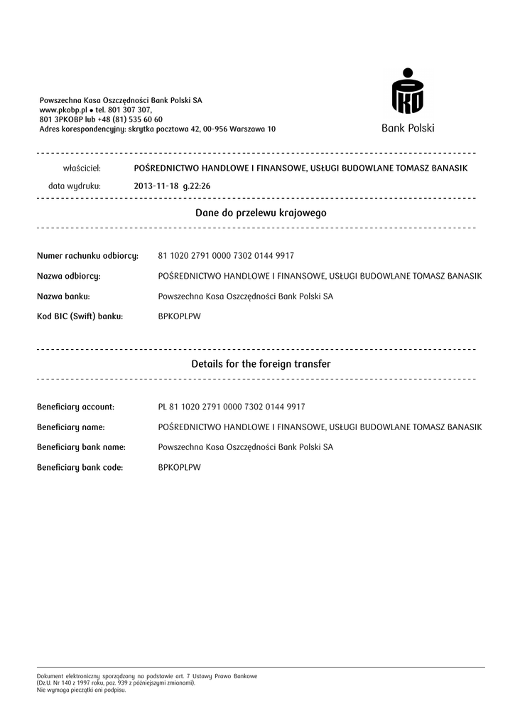 Powszechna Kasa Oszczędności Bank Polski SA www.pkobp.pl • tel. 801 307 307, 801 3PKOBP lub +48 (81) 535 60 60 Adres korespondencyjny: skrytka pocztowa 42, 00-956 Warszawa 10 właściciel: data wydruku: POŚREDNICTWO HANDLOWE I FINANSOWE, USŁUGI BUDOWLANE TOMASZ BANASIK 2013-11-18 g.22:26 Dane do przelewu krajowego Numer rachunku odbiorcy: 81 1020 2791 0000 7302 0144 9917 Nazwa odbiorcy: POŚREDNICTWO HANDLOWE I FINANSOWE, USŁUGI BUDOWLANE TOMASZ BANASIK Nazwa banku: Powszechna Kasa Oszczędności Bank Polski SA Kod BIC (Swift) banku: BPKOPLPW Details for the foreign transfer Beneficiary account: PL 81 1020 2791 0000 7302 0144 9917 Beneficiary name: POŚREDNICTWO HANDLOWE I FINANSOWE, USŁUGI BUDOWLANE TOMASZ BANASIK Beneficiary bank name: Powszechna Kasa Oszczędności Bank Polski SA Beneficiary bank code: BPKOPLPW Dokument elektroniczny sporządzony na podstawie art. 7 Ustawy Prawo Bankowe (Dz.U. Nr 140 z 1997 roku, poz. 939 z późniejszymi zmianami). Nie wymaga pieczątki ani podpisu.
