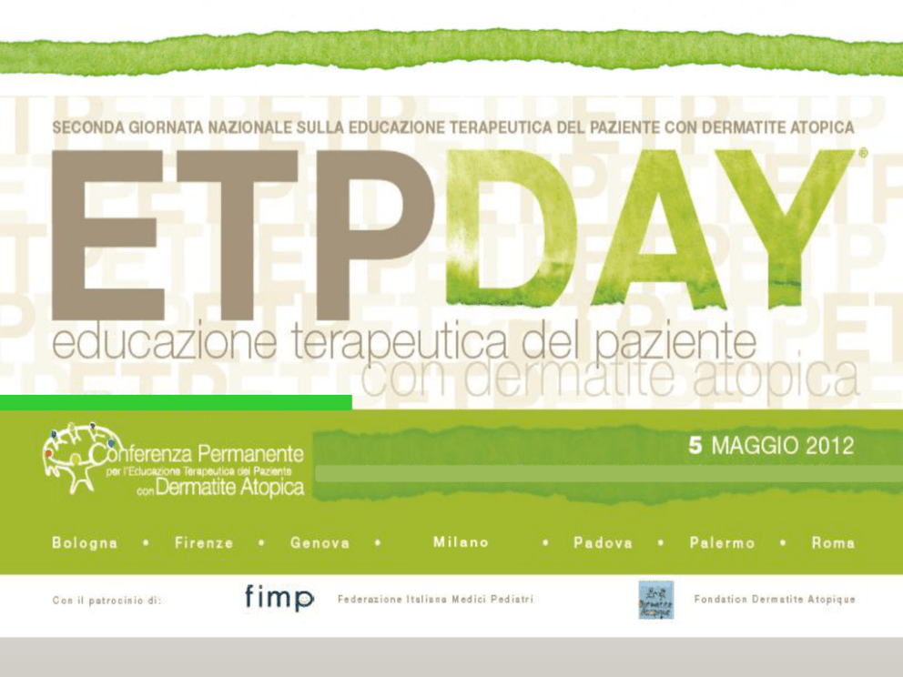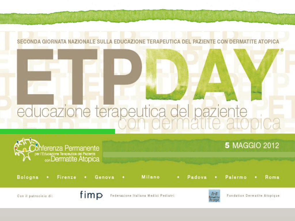 MIASTA … BOLOGNA Villa Gandolfi Pallavicini GENOVA Castello Simon Boccanegra MILANO Clinica Dermatologica Università di Milano PADOVA Clinica Dermatologica Università di Padova PALERMO Ordine dei Medici di Palermo ROMA Pontificia Università Urbaniana FIRENZE Convitto della Calza QUE KOMITET SCIENTFIC STAŁA KONFERENCJA DSEDUKACJI THERAPEUTICS POKOJU Salvatore Amato (Palermo), Anna Belloni Fortina (Padova), Anna Graziella Burroni (Genova), Cristiana Colonna (Milano), Maya El Hachem (Roma), Carlo Gelmetti (Milano), Loredana Anna Giovane (Milano), Massimo Gola (Firenze), Mirella Milioto (Palermo), Aurora Parodi (Genova), Annalisa Patrizi (Bologna), Giampaolo Ricci (Bologna), Paola Vizziello (Milano) KOLEGIA LOCAL CENTRUM ETP PERSONEL STAŁEJ KONFERENCJI DORADCA NAUKOWY KOMUNIKACJA PEDIATRICS FMP DYREKTOR REGIONALNY CELE 1. zwiększenie leczenia formacji pacjentów z atopowym zapaleniem skóry, 2. 3. 3. jako część klinicznego wyprysku promowania edukacji jako narzędzia terapeutycznego w celu właściwego zarządzania klinicznego atopowego zapalenia skóry, podkreślając znaczenie kluczowe koncepcje, takie jak znaczenie prawidłowego mycia i relaksu odpowiedniej poprawa sieci szpitalnej Territory / Network Professional wzmocnienie szpitala rejonowego w obszarze, racjonalne wykorzystanie zasobów naszego systemu opieki zdrowotnej amiliorate na jakość życia pacjentów z atopowym zapaleniem skóry Poprawa jakości życia pacjentów z atopowym zapaleniem skóry Aby poprawić PO-SCORAD znaczenie w monitorowaniu klinicznego przebiegu atopowego zapalenia skóry TEMAS • zł pica zapalenie skóry minut: wpływ epidemiologia i społecznej Atopowe zapalenie skóry: epidemiologiczny i społeczny wpływ to atopowe zapalenie skóry: dane epidemiologiczne y el wpływ społeczny • Rola ogólnego zarządu praktykujący klinicznej minut zapalenia skóry gryzie rolę Athena o Naciśnij przycisk ¡ria w zarządzaniu minut zapaleniem skóry klan pic • Atopowe zapalenie skóry: Rzeka klanu trasy i terapeutyczne Atopowe zapalenie skóry: atopowe zapalenie skóry terapeutyczne klan ścieżki • Po-SCORAD rolę w monitorowaniu klinicznego przebiegu atopowego zapalenia skóry po-SCORAD: jaką rolę w zarządzaniu atopowego zapalenia skóry klanu • interaktywna sesja APOIO WE WSPÓŁPRACY Z: • Fundacja na atopowe zapalenie skóry UZNANIE • FIMP • SIP • SIAP • SIDEMAST • ADOI • SIDERP • ___________ a.m. AGENDA 9.15 - 09.30 • OPENING SESSION 09.30 – 10.30 • ETP Programme: Institution: state of the art (epidemiology, costs, educational activity etc.) (30 min) • SCIENTIFIC SOCIETY Scientific society role in ETP: state of the art and future perspective (5 min / Society) 10.30-12.00 • ETP & DIAGNOSTIC-TERAPEUTIC ITINERARY: Territorial Area-hospital net ETP ACTORS THE PATIENT: THE PAETDIATRIC THE DERMATOLOGIST DISCUSSION 12.00-13.30 • CLINICAL CASE (PO SCORAD) (30 min) 13.30- 14.30 • LUNCH 14.30-16.00 • WORKING GROUP • • • • p.m. emollients corticophoby diets Ambient and clothes (10 min) (20 min) (10 min) (20 min) 16.00 – 17.30 WORKING GROUP OUTCOME: PRESENTATION (60 min) 17.30 • CME 17.00 – 17.30 • ETP FUTURE PERSPECTIVE: Guidelne, Patient Journey… etc ZDJĘCIA Bologna Milano 1 Milano 2 Aby znaleźć wszystkie adres kontaktowy Dialecticon Dialecticon srl Via Ceresio 6 • 20154 Milano lub wpisz site: www.dermatitatopica.net Wstępne wyniki O WIZARDS … O WIZARDS … JEŚLI JAKOŚĆ W OPINII UCZESTNIKÓW …
