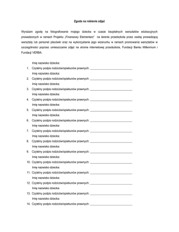 Zgoda na robienie zdjęć Wyrażam zgodę na fotografowanie mojego dziecka w czasie bezpłatnych warsztatów edukacyjnych prowadzonych w ramach Projektu „Finansowy Elementarz” na terenie przedszkola przez osobę prowadzącą warsztaty lub personel placówki oraz na wykorzystanie jego wizerunku w ramach promowania warsztatów w szczególności poprzez umieszczanie zdjęć na stronie internetowej przedszkola, Fundacji Banku Millennium i Fundacji VERBA. Imię nazwisko dziecka: 1. Czytelny podpis rodziców/opiekunów prawnych: ____________________________ Imię nazwisko dziecka: 2. Czytelny podpis rodziców/opiekunów prawnych: ____________________________ Imię nazwisko dziecka: 3. Czytelny podpis rodziców/opiekunów prawnych: ____________________________ Imię nazwisko dziecka: 4. Czytelny podpis rodziców/opiekunów prawnych: ____________________________ Imię nazwisko dziecka: 5. Czytelny podpis rodziców/opiekunów prawnych: ____________________________ Imię nazwisko dziecka: 6. Czytelny podpis rodziców/opiekunów prawnych: ____________________________ Imię nazwisko dziecka: 7. Czytelny podpis rodziców/opiekunów prawnych: ____________________________ Imię nazwisko dziecka: 8. Czytelny podpis rodziców/opiekunów prawnych: ____________________________ Imię nazwisko dziecka: 9. Czytelny podpis rodziców/opiekunów prawnych: ____________________________ Imię nazwisko dziecka: 10. Czytelny podpis rodziców/opiekunów prawnych: ____________________________ Imię nazwisko dziecka: 11. Czytelny podpis rodziców/opiekunów prawnych: ____________________________ Imię nazwisko dziecka: 12. Czytelny podpis rodziców/opiekunów prawnych: ____________________________ Imię nazwisko dziecka: 13. Czytelny podpis rodziców/opiekunów prawnych: ____________________________ Imię nazwisko dziecka: 14. Czytelny podpis rodziców/opiekunów prawnych: ____________________________ Imię nazwisko dziecka: 15. Czytelny podpis rodziców/opiekunów prawnych: ____________________________ Imię nazwisko dziecka: 16. Czytelny podpis rodziców/opiekunów prawnych: ____________________________ Imię nazwisko dziecka 17. Czytelny podpis rodziców/opiekunów prawnych: ____________________________ Imię nazwisko dziecka: 18. Czytelny podpis rodziców/opiekunów prawnych: ____________________________ Imię nazwisko dziecka: 19. Czytelny podpis rodziców/opiekunów prawnych: ____________________________ Imię nazwisko dziecka: 20. Czytelny podpis rodziców/opiekunów prawnych: ____________________________ Imię nazwisko dziecka: 21. Czytelny podpis rodziców/opiekunów prawnych: ____________________________ Imię nazwisko dziecka: 22. Czytelny podpis rodziców/opiekunów prawnych: ____________________________ Imię nazwisko dziecka: 23. Czytelny podpis rodziców/opiekunów prawnych: ____________________________ Imię nazwisko dziecka: 24. Czytelny podpis rodziców/opiekunów prawnych: ____________________________ Imię nazwisko dziecka: 25. Czytelny podpis rodziców/opiekunów prawnych: ____________________________ Przedszkole (pieczęć): Grupa: Data i miejsce: