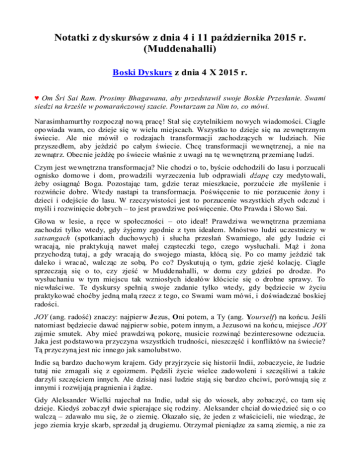 Notatki z dyskursów z dnia 4 i 11 października 2015 r. (Muddenahalli) Boski Dyskurs z dnia 4 X 2015 r. ♥ Om Śri Sai Ram. Prosimy Bhagawana, aby przedstawił swoje Boskie Przesłanie. Swami siedzi na krześle w pomarańczowej szacie. Powtarzam za Nim to, co mówi. Narasimhamurthy rozpoczął nową pracę! Stał się czytelnikiem nowych wiadomości. Ciągle opowiada wam, co dzieje się w wielu miejscach. Wszystko to dzieje się na zewnętrznym świecie. Ale nie mówił o rodzajach transformacji zachodzących w ludziach. Nie przyszedłem, aby jeździć po całym świecie. Chcę transformacji wewnętrznej, a nie na zewnątrz. Obecnie jeżdżę po świecie właśnie z uwagi na tę wewnętrzną przemianę ludzi. Czym jest wewnętrzna transformacja? Nie chodzi o to, byście odchodzili do lasu i porzucali ognisko domowe i dom, prowadzili wyrzeczenia lub odprawiali dźapę czy medytowali, żeby osiągnąć Boga. Pozostając tam, gdzie teraz mieszkacie, porzućcie złe myślenie i rozwińcie dobre. Wtedy nastąpi ta transformacja. Poświęcenie to nie porzucenie żony i dzieci i odejście do lasu. W rzeczywistości jest to porzucenie wszystkich złych odczuć i myśli i rozwinięcie dobrych – to jest prawdziwe poświęcenie. Oto Prawda i Słowo Sai. Głowa w lesie, a ręce w społeczności – oto ideał! Prawdziwa wewnętrzna przemiana zachodzi tylko wtedy, gdy żyjemy zgodnie z tym ideałem. Mnóstwo ludzi uczestniczy w satsangach (spotkaniach duchowych) i słucha przesłań Swamiego, ale gdy ludzie ci wracają, nie praktykują nawet małej cząsteczki tego, czego wysłuchali. Mąż i żona przychodzą tutaj, a gdy wracają do swojego miasta, kłócą się. Po co mamy jeździć tak daleko i wracać, walcząc ze sobą. Po co? Dyskutują o tym, gdzie zjeść kolację. Ciągle sprzeczają się o to, czy zjeść w Muddenahalli, w domu czy gdzieś po drodze. Po wysłuchaniu w tym miejscu tak wzniosłych ideałów kłócicie się o drobne sprawy. To niewłaściwe. Te dyskursy spełnią swoje zadanie tylko wtedy, gdy będziecie w życiu praktykować choćby jedną małą rzecz z tego, co Swami wam mówi, i doświadczać boskiej radości. JOY (ang. radość) znaczy: najpierw Jezus, Oni potem, a Ty (ang. Yourself) na końcu. Jeśli natomiast będziecie dawać najpierw sobie, potem innym, a Jezusowi na końcu, miejsce JOY zajmie smutek. Aby mieć prawdziwą pokorę, musicie rozwinąć bezinteresowne odczucia. Jaka jest podstawowa przyczyna wszystkich trudności, nieszczęść i konfliktów na świecie? Tą przyczyną jest nic innego jak samolubstwo. Indie są bardzo duchowym krajem. Gdy przyjrzycie się historii Indii, zobaczycie, że ludzie tutaj nie zmagali się z egoizmem. Pędzili życie wielce zadowoleni i szczęśliwi a także darzyli szczęściem innych. Ale dzisiaj nasi ludzie stają się bardzo chciwi, porównują się z innymi i rozwijają pragnienia i żądze. Gdy Aleksander Wielki najechał na Indie, udał się do wiosek, aby zobaczyć, co tam się dzieje. Kiedyś zobaczył dwie spierające się rodziny. Aleksander chciał dowiedzieć się o co walczą – zdawało mu się, że o ziemię. Okazało się, że jeden z właścicieli, nie wiedząc, że jego ziemia kryje skarb, sprzedał ją drugiemu. Otrzymał pieniądze za samą ziemię, a nie za skarb. Kupujący uważał, że zapłacił tylko za ziemię, a nie za skarb, dlatego chciał, by ten pierwszy wziął skarb dla siebie! Pierwotny właściciel upierał się jednak, że ponieważ sam nic nie wiedział o skarbie, nowy właściciel powinien go zatrzymać. W tym duchu spierali się. Dzisiaj właściciel ziemi chce mieć też ziemię swojego sąsiada i przedstawi wszelkiego rodzaju dokumenty, aby przypisać sobie jego ziemię. Dlatego ciągle mówię Narasimhamurthy’mu, aby dokładnie sprawdzał wszystkie dokumenty, gdy kupuje ziemię. W dawnych czasach było inaczej. Ludzie byli bezinteresowni. Gdy spierali się, szli do starszych i tam szukali sprawiedliwości. „Starszy” znaczy tutaj najstarszy człowiek we wiosce. To on, opierając się na swoim doświadczeniu, rozstrzygał spór. W tamtym sporze żadna strona nic nie wiedziała o skarbie. Teraz toczyli spór, każdy utrzymując, że skarb należy do rozmówcy. Obaj mieli dzieci. Jeden miał córkę, a drugi syna. Starszy wioski powiedział, że ich dzieci powinny pobrać się, a jako dar ślubny niech dostaną ów skarb. Takie znaleziono rozwiązanie. Historia Indii wskazuje, że kraj ten nigdy nie najechał na kraj zewnętrzny. Ponieważ w Indiach ludziom dobrze się powodziło, najeżdżały na nie inne kraje. Ludzie tu wiedli życie, zadowalając się tym, co mieli. Hindusi byli wewnętrznie bardzo bogaci. Ich skarbem był skarb duchowy. Celem mojego podróżowania po świecie jest uczenie i dzielenie się duchowymi skarbami oraz nauczanie bezinteresowności. Wszystkie kraje są jak przedziały pociągu. Indie są lokomotywą tego pociągu. Gdy jest lokomotywa, może ona pociągnąć pociąg na dowolną odległość. Ale ponieważ nie mieliśmy dobrego maszynisty, lokomotywa stanęła w martwym punkcie. Teraz lokomotywa ponownie ruszyła. Dzisiaj można spotkać ludzi z Indii niosących ten duchowy skarb za granicę, wszędzie nauczających ludzi i rozprzestrzeniających radość (JOY). Także wielu mędrców i świętych Indii wyjeżdżało do wielu krajów, by szerzyć duchowe przesłania. Śirdi Baba urodził się wstanie Maharasztra. Prema Baba rodzi się w stanie Karnataka i będzie jeździł po świecie szerząc duchowe nauki. Śirdi Baba ograniczał się tylko do Maharasztry, gdzie głosił duchowe nauki. Sathya Sai Baba podróżował po całych Indiach, ustanowił liczne ośrodki i instytucje oraz uczył ludzi duchowości. Ale gdy nastanie Prema Sai, wyruszy do wszystkich krajów i tam będzie szerzył duchowe przesłania. Pierwszy awatar (zstąpienie boskości) działał tylko w jednym stanie, drugi służył całemu narodowi, a trzeci pójdzie na cały świat. Obec