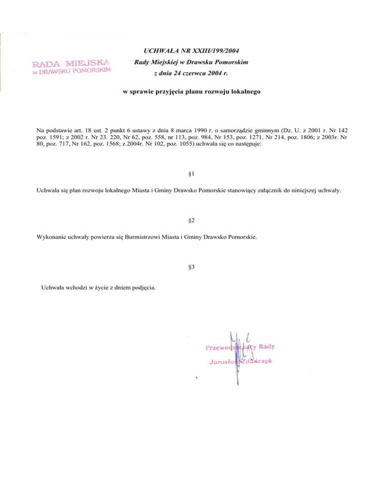 UCHWAŁA NR XXIII/199/2004 Rady Miejskiej w Drawsku Pomorskim z dnia 24 czerwca 2004 r. w sprawie przyjęcia planu rozwoju lokalnego Na podstawie art. 18 ust. 2 punkt 6 ustawy z dnia 8 marca 1990 r. o samorządzie gminnym (Dz. U. z 2001 r. Nr 142 poz. 1591; z 2002 r. Nr 23. 220, Nr 62, poz. 558, nr 113, poz. 984, Nr 153, poz. 1271, Nr 214, poz. 1806; z 2003r. Nr 80, poz. 717, Nr 162, poz. 1568; z 2004r. Nr 102, poz. 1055) uchwala się co następuje: §1 Uchwala się plan rozwoju lokalnego Miasta i Gminy Drawsko Pomorskie stanowiący załącznik do niniejszej uchwały. §2 Wykonanie uchwały powierza się Burmistrzowi Miasta i Gminy Drawsko Pomorskie. §3 Uchwała wchodzi w życie z dniem podjęcia. Przyjęcie planu rozwoju lokalnego jest obowiązkiem gminy ze względu na akcesję Polski do Unii Europejskiej i przepisów akcesyjnych z tego wynikających. Warunkiem złożenia wniosku o pomoc finansową z UE jest posiadanie planu rozwoju lokalnego. Aby starać się o dofinansowanie inwestycji z funduszy strukturalnych plan rozwoju lokalnego gmina winna przyjąć do końca czerwca2004 roku. Plan rozwoju lokalnego określa szczegółowo rodzaje zadań, jakie będą realizowane na terenie gminy w latach 2004-2006. PRL jest dokumentem, który powstał na podstawie strategii Miasta i Gminy Drawsko Pomorskie, Studium Uwarunkowań i Kierunków Zagospodarowania Przestrzennego Gminy Drawsko Pomorskie, budżetu na 2004 rok i wieloletniego planu inwestycyjnego. PLAN ROZWOJU LOKALEGO GMINY DRAWSKO POMORSKIE NA LATA 2004 - 2006 INSTYTUT ROZWOJU REGIONALNEGO SZCZECIN 2004 OBSZAR I CZAS REALIZACJI PLANU ROZWOJU LOKALNEGO Plan rozwoju lokalnego dla Gminy Drawsko Pomorskie określa szczegółowo rodzaje zadań, jakie będą realizowane na terenie gminy w latach 2004-2006 oraz ogólny zakres zadań na lata następne. AKTUALNA SYTUACJA SPOŁECZNO-GOSPODARCZA NA OBSZARZE GMINY DRAWSKO POMORSKIE Położenie, powierzchnia i ludność Drawsko Pomorskie administracyjnie wchodzi w skład województwa zachodniopomorskiego ze stolicą w Szczecinie. Gmina zajmuje obszar 344,5 km2 w środkowej części województwa. Geograficznie obszar gminy Drawsko Pomorskie wchodzi w skład Pojezierza Drawskiego, które jest częścią składową większej jednostki - Pojezierza Pomorskiego. Sąsiaduje z gminami: od wsch. Złocieniec, od pn. Ostrowice, Brzeźno, Łobez, od zach. Węgorzyno, Ińsko oraz z Gminą Kalisz Pomorski od południa. Na terenie gminy występuje bardzo zróżnicowana rzeźba terenu ukształtowana przez ostatnie zlodowacenie zwane Bałtyckim. Cechą charakterystyczną gminy jest występowanie dużej ilości jezior (22 jeziora o pow. pow. 5 ha) i znaczne zalesienie (34% powierzchni gminy). Drawsko Pomorskie posiada dogodne połączenia drogowe i kolejowe z resztą kraju. Odległość od Szczecina, Koszalina i Piły jest jednakowa i wynosi 100 km. Do przejścia granicznego w Kołbaskowie oraz do bazy promowej w Świnoujściu odległość wynosi 120 km. Ludność Liczba ludności w gminie - 17366 miasto - 12061 mieszkańców wieś – 5305 mieszkańców (stan na maj 2002 r.) Średnia gęstość zaludnienia gminy wynosi tylko 50 os./km2, przy czym w mieście = 549 os/ km2. Gmina składa się z 33 miejscowości w tym z miasta Drawsko Pomorskie oraz 13 wsi sołeckich: 1. Gudowo; 2. Konotop (w tym: Karwice, Żołędowo); 3. Linowno; 4. Łabędzie; 5. Mielenko Drawskie (w tym: Woliczno, Ziemsko, Oleszno); 6. Nętno (w tym: Lasocin); 7. Rydzewo; 8. Suliszewo (w tym: Paprotno, Zagórki); 9. Zagozd (w tym: Gajewko, Gajewo, Golina, Cianowo); 10. Zarańsko (w tym: Roztoki); 11. Jankowo (w tym: Krzynno, Kumki, Ustok, Zbrojewo); 12. Żółte (w tym: Olchowiec, Żółcin) 13. Dalewo; Na 100 mężczyzn w gminie przypada 104,8 kobiet, jednak w mieście ta nadwyżka jest większa i wynosi 106,6. W ciągu ostatnich 16 lat (1985 –2000) ludność miasta wzrosła o 2847 osób. Daje to przyrost równy 177 osób średniorocznie. Liczba osób w ciągu pierwszego półrocza 2002 r. znacznie wzrosła porównując z ww. przyrostem średniorocznym (liczba mieszkańców w ciągu 6 miesięcy wzrosła o 344). Niewielkie tempo charakteryzował przyrost osób na wsi, przy czym od kilku lat można zaobserwować ciągły spadek ludności wiejskiej. Środowisko przyrodnicze Północna część gminy charakteryzuje się bardzo pofałdowanym terenem i jest określana jako Wysoczyzna Morenowa, która nie opada poniżej 150 m npm. (okolice wsi Łabędzie). Natomiast cześć południowa stanowi Równinę Sandrową. Wśród wielu porośniętych lasem wzniesień moreny czołowej znajdują się 22 jeziora o powierzchni powyżej 5 ha, począwszy od małych oczek wodnych po ciągi jezior rynnowych. Przez gminę przebiega główny wododział Pomorza a w związku z tym niektóre rzeki (w tym Drawa) płyną „w odwrotnym kierunku” tzn. z północy na południe. Gmina Drawsko Pomorskie w 34% pokryta jest lasami, które obfitują w runo leśne a także stanowią niewątpliwą atrakcję dla myśliwych. Pod względem geologicznym profil tego terenu składa się z zalegających warstw (ok. 140 – 170 m) utworów czwartorzędowych zalegających na piaskach, mułkach i iłach trzeciorzędowych oraz starszych osadach kredowych i jurajskich. Na południe od Drawska Pomorskiego miąższość utworów czwartorzędowych wynosi 70-80 m. Osady polodowcowe tworzą piaski i żwiry akumulacji rzeczno – lodowcowej tzw. sandry, gliny zwałowe, piaski z głazami, piaski ze żwirem i skupienia głazów akumulacji czołowo – lodowcowej. Występujące tu podłoże jest jednocześnie bazą do powstawania dość ubogich gleb bielicowych piaszczystych lub gliniastych, rzadko brunatnych i tylko śladowo mad (w bezpośrednim sąsiedztwie wód). Na terenie Gminy Drawsko Pomorskie znajdują się cztery pomniki przyrody (dęby szypułkowe: 3 w Drawsku Pom i 1 w Suliszewie) oraz uznane za użytek ekologiczny o pow. 5,96 ha zlokalizowane w okolicach wsi Łabędzie. Skład gatunkowy d