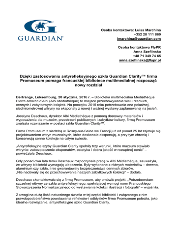 Osoba kontaktowa: Luisa Marchina +352 28 111 860 [email protected] Osoba kontaktowa FlyPR Anna Szeflinska +48 71 349 74 65 [email protected] Dzięki zastosowaniu antyrefleksyjnego szkła Guardian Clarity™ firma Promuseum pomaga francuskiej bibliotece multimedialnej rozpocząć nowy rozdział Bertrange, Luksemburg, 20 stycznia, 2016 r. – Biblioteka multimedialna Médiathèque Pierre Amalric d’Albi (Albi Médiathèque) to miejsce przechowywania wielu rzadkich, cennych i zabytkowych książek. Na początku 2015 roku potrzebowała ona pokaźnej, siedmiometrowej witryny na eksponaty z nowej i ważnej wystawy zaplanowanej na jesień. Jocelyne Deschaux, dyrektor Albi Médiathèque z pomocą dostawcy materiałów i wyposażenia dla muzeów, przestrzeni publicznych i zabytków kultury, firmą Promuseum znalazła rozwiązanie w postaci szkła Guardian Clarity™. Firma Promuseum z siedzibą w Rosny-sur-Seine we Francji już od ponad 25 lat zajmuje się projektowaniem witryn muzealnych, które doskonale eksponują, a przy tym chronią i konserwują cenne kolekcje na całym świecie. „Antyrefleksyjne szyby Guardian Clarity spełniły trzy warunki, które muzeum stawiało witrynie: zabezpieczenie eksponatów, estetyka i dobra jakość w rozsądnej cenie” – powiedziała Deschaux. Gdy ponad dwa lata temu Deschaux rozpoczynała pracę w Albi Médiathèque, zauważyła, że witryny biblioteki wymagają ulepszenia. Były wykonane z różnych materiałów – drewna, aluminium czy szkła, i nie gwarantowały bezpieczeństwa cennych zbiorów. „Nie nadawały się do przechowywania naszych zabytkowych kolekcji” – dodała. Deschaux skontaktowała się z firmą Promuseum, aby omówić projekt. „Potrzebowałam szczelnej witryny ze szkła antyrefleksyjnego, spełniającej wymogi norm Francuskiego Stowarzyszenia Normalizacyjnego do wystawiania kolekcji ilustracji i fotografii” – wyjaśniła. Z uwagi na dużą ilość naturalnego światła w tej części biblioteki i związanego z nim prawdopodobieństwa powstawania refleksów i odbłysków firma Promuseum poleciła, jako idealne rozwiązanie, antyrefleksyjne szkło Guardian Clarity. W zeszłym roku przedstawiciele firm Promuseum i Guardian Industries’ Glass Group w Europie spotkali się, aby wspólnie opracować ofertę witryn z antyrefleksyjnego szkła Guardian Clarity™. Współpraca była wynikiem szeroko zakrojonych poszukiwań firmy Promuseum w celu odnalezienia szkła o wysokiej jakości, które pozwoliłoby muzeom doskonale zaprezentować swoje kolekcje. „W Albi Médiathèque nie słyszano o szkle Guardian Clarity” – komentuje Juliette Bourdillon, dyrektor Promuseum. Przedstawiciel firmy Guardian, David Allouche przedstawił próbki i zapewnił wsparcie techniczne, objaśniając zalety szkła Guardian Clarity. „Firma Promuseum przekonana do zalet tego szkła wierzyła, że będzie to doskonałe rozwiązanie dla Albi Médiathèque. Postanowili spróbować”. Firma Promuseum skonstruowała siedmiometrową witrynę mocowaną do ściany, której cały przód stanowiła szyba ze szkła Guardian Clarity. „Największym wyzwaniem były duże wymiary” – przyznała Bourdillon. „Ponadto witryna musiała pasować do wnęki. Efekt końcowy był jednak doskonały i w każdym calu spełniał oczekiwania Albi Médiathèque”. Firma Guardian Industries’ Glass Group w Europie to wiodący producent wysokiej jakości wyrobów szklanych do obiektów handlowych i mieszkaniowych, wnętrz, a także dla przemysłu motoryzacyjnego. Jej dwustronnie powlekane, antyrefleksyjne szyby powstają z zastosowaniem niezwykle zaawansowanej technologii magnetronowego napylania szkła. Dzięki temu szkło Guardian Clarity zapewnia przepuszczalność światła na poziomie 97% i refleksyjność poniżej 1%. Porównując: architektoniczne szkło float zapewnia przepuszczalność rzędu 90% i refleksyjność 8%. Szkło Guardian Clarity opracowano z uwzględnieniem konieczności sprostania wysokim wymaganiom optycznym gości muzealnych. Zapewnia ono najlepsze właściwości antyrefleksyjne na rynku: eliminuje niepożądane refleksy i odbłyski przy największej, możliwej przejrzystości. Firma Guardian zapewniła także szkolenia i wsparcie techniczne oraz pomogła zespołowi Bourdillon nawiązać kontakt z miejscowymi producentami, którzy mogliby dostarczyć szyby. Leon Broekman, kierownik ds. rozwoju produktów Guardian InGlass oraz David Allouche ściśle współpracowali z firmą Promuseum przez cały okres realizacji projektu. Firma Promuseum złożyła zamówienie na szyby w lipcu i zamontowała witrynę robioną na zamówienie w Albi Médiathèque z końcem września. Już 6 października biblioteka multimedialna zainaugurowała wystawę zabytkowych książek zatytułowaną “Czerń: historia koloru”, którą można podziwiać do 2 stycznia 2016 roku. Deschaux wyjaśnia, że wystawa stanowi adaptację książki Michela Pastoureau pod tym samym tytułem. Wykorzystując książki i grafiki autor przybliża fascynującą historię czerni, jej odbioru w różnych społeczeństwach i postrzegania przez kolejne cywilizacje na przestrzeni wieków. Na temat nowej witryny Deschaux powiedziała: „Jestem zadowolona z antyrefleksyjnych właściwości szkła Guardian Clarity. Muszę przyznać, że gościom bardzo podoba się wygląd nowej witryny”. Po sukcesie oferty witryn muzealnych do zespołu firmy Promuseum dołączył Bernard Rey. Będzie odpowiadał za rynek witryn spersonalizowanych i robionych na zamówienie i za pogłębianie kontaktów z innymi francuskimi muzeami. „Po sukcesie projektu firmy Guardian Glass Europe i Promuseum zaprezentują dwustronnie powlekane szyby Guardian Clarity z powłoką antyrefleksyjną podczas Targów SITEM w styczniu 2016 roku, aby przedstawić różnice pomiędzy tym produktem i innymi rodzajami szkła” – powiedział Bernard Rey. „Aktualnie proponujemy antyrefleksyjne szyby Guardian Clarity we wszystkich