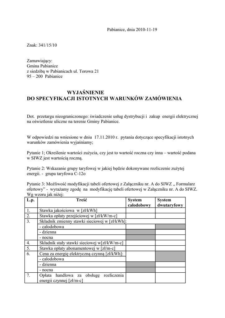 Pabianice, dnia 2010-11-19 Znak: 341/15/10 Zamawiający: Gmina Pabianice z siedzibą w Pabianicach ul. Torowa 21 95 – 200 Pabianice WYJAŚNIENIE DO SPECYFIKACJI ISTOTNYCH WARUNKÓW ZAMÓWIENIA Dot. przetargu nieograniczonego: świadczenie usług dystrybucji i zakup energii elektrycznej na oświetlenie uliczne na terenie Gminy Pabianice. W odpowiedzi na wniesione w dniu 17.11.2010 r. pytania dotyczące specyfikacji istotnych warunków zamówienia wyjaśniamy; Pytanie 1; Określenie wartości zużycia, czy jest to wartość roczna czy inna – wartość podana w SIWZ jest wartością roczną. Pytanie 2: Wskazanie grupy taryfowej w jakiej będzie dokonywane rozliczenie zużytej energii. - grupa taryfowa C-12o Pytanie 3: Możliwość modyfikacji tabeli ofertowej z Załączniku nr. A do SIWZ „ Formularz ofertowy” - wyrażamy zgodę na modyfikację tabeli ofertowej w Załączniku nr. A do SIWZ. Wg wzoru jak niżej: L.p. Treść System System całodobowy dwutaryfowy 1. Stawka jakościowa w [zł/kWh] 2. Stawka opłaty przejściowej w [zł/kW/m-c] 3. Składnik zmienny stawki sieciowej w [zł/kWh]: - całodobowa - dzienna - nocna 4. Składnik stały stawki sieciowej w[zł/kW/m-c] 5. Stawka opłaty abonamentowej w [zł/m-c] 6. Cena za energię elektryczną czynną [zł/kWh]: - całodobowa - dzienna - nocna 7. Opłata handlowa za obsługę rozliczenia energii czynnej [zł/m-c]