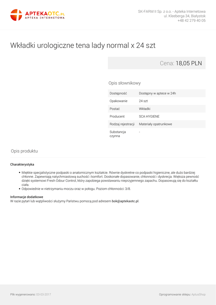 SK-FARM II Sp. z o.o. - Apteka Internetowa ul. Kleeberga 34, Białystok +48 42 279 40 05 Wkładki urologiczne tena lady normal x 24 szt Cena: 18,05 PLN Opis słownikowy Dostępność Dostępny w aptece w 24h Opakowanie 24 szt Postać Wkładki Producent SCA HYGIENE Rodzaj rejestracji Materiały opatrunkowe Substancja czynna - Opis produktu Charakterystyka Miękkie specjalistyczne podpaski o anatomicznym kształcie. Równie dyskretne co podpaski higieniczne, ale dużo bardziej chłonne. Zapewniają natychmiastową suchość i komfort. Doskonałe dopasowanie, chłonność i dyskrecja. Większa pewność dzięki systemowi Fresh Odour Control, który zapobiega powstawaniu nieprzyjemnego zapachu. Dopasowują się do kształtu ciała. Odpowiednie w nietrzymaniu moczu oraz w połogu. Poziom chłonności: 3/8. Informacje dodatkowe W razie pytań lub wątpliwości służymy Państwu pomocą pod adresem [email protected]. Plik wygenerowano: 03-03-2017 Powered by TCPDF (www.tcpdf.org) Oprogramowanie sklepu: AptusShop