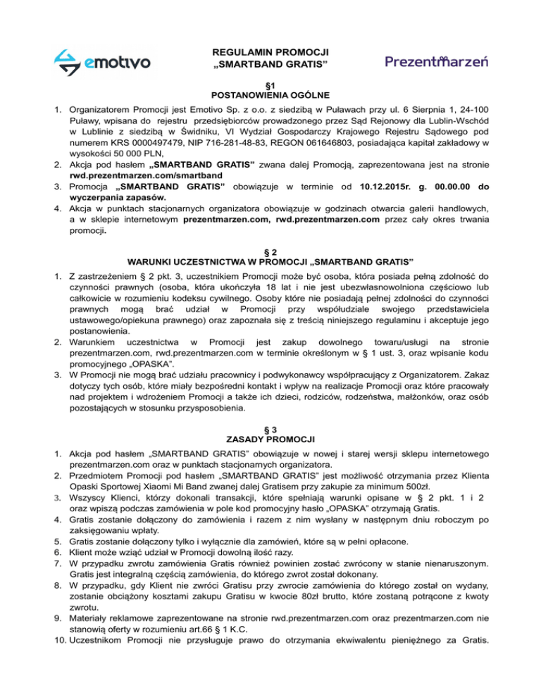REGULAMIN PROMOCJI „SMARTBAND GRATIS” §1 POSTANOWIENIA OGÓLNE 1. Organizatorem Promocji jest Emotivo Sp. z o.o. z siedzibą w Puławach przy ul. 6 Sierpnia 1, 24-100 Puławy, wpisana do rejestru przedsiębiorców prowadzonego przez Sąd Rejonowy dla Lublin-Wschód w Lublinie z siedzibą w Świdniku, VI Wydział Gospodarczy Krajowego Rejestru Sądowego pod numerem KRS 0000497479, NIP 716-281-48-83, REGON 061646803, posiadająca kapitał zakładowy w wysokości 50 000 PLN, 2. Akcja pod hasłem „SMARTBAND GRATIS” zwana dalej Promocją, zaprezentowana jest na stronie rwd.prezentmarzen.com/smartband 3. Promocja „SMARTBAND GRATIS” obowiązuje w terminie od 10.12.2015r. g. 00.00.00 do wyczerpania zapasów. 4. Akcja w punktach stacjonarnych organizatora obowiązuje w godzinach otwarcia galerii handlowych, a w sklepie internetowym prezentmarzen.com, rwd.prezentmarzen.com przez cały okres trwania promocji. §2 WARUNKI UCZESTNICTWA W PROMOCJI „SMARTBAND GRATIS” 1. Z zastrzeżeniem § 2 pkt. 3, uczestnikiem Promocji może być osoba, która posiada pełną zdolność do czynności prawnych (osoba, która ukończyła 18 lat i nie jest ubezwłasnowolniona częściowo lub całkowicie w rozumieniu kodeksu cywilnego. Osoby które nie posiadają pełnej zdolności do czynności prawnych mogą brać udział w Promocji przy współudziale swojego przedstawiciela ustawowego/opiekuna prawnego) oraz zapoznała się z treścią niniejszego regulaminu i akceptuje jego postanowienia. 2. Warunkiem uczestnictwa w Promocji jest zakup dowolnego towaru/usługi na stronie prezentmarzen.com, rwd.prezentmarzen.com w terminie określonym w § 1 ust. 3, oraz wpisanie kodu promocyjnego „OPASKA”. 3. W Promocji nie mogą brać udziału pracownicy i podwykonawcy współpracujący z Organizatorem. Zakaz dotyczy tych osób, które miały bezpośredni kontakt i wpływ na realizacje Promocji oraz które pracowały nad projektem i wdrożeniem Promocji a także ich dzieci, rodziców, rodzeństwa, małżonków, oraz osób pozostających w stosunku przysposobienia. §3 ZASADY PROMOCJI 1. Akcja pod hasłem „SMARTBAND GRATIS” obowiązuje w nowej i starej wersji sklepu internetowego prezentmarzen.com oraz w punktach stacjonarnych organizatora. 2. Przedmiotem Promocji pod hasłem „SMARTBAND GRATIS” jest możliwość otrzymania przez Klienta Opaski Sportowej Xiaomi Mi Band zwanej dalej Gratisem przy zakupie za minimum 500zł. 3. Wszyscy Klienci, którzy dokonali transakcji, które spełniają warunki opisane w § 2 pkt. 1 i 2 oraz wpiszą podczas zamówienia w pole kod promocyjny hasło „OPASKA” otrzymają Gratis. 4. Gratis zostanie dołączony do zamówienia i razem z nim wysłany w następnym dniu roboczym po zaksięgowaniu wpłaty. 5. Gratis zostanie dołączony tylko i wyłącznie dla zamówień, które są w pełni opłacone. 6. Klient może wziąć udział w Promocji dowolną ilość razy. 7. W przypadku zwrotu zamówienia Gratis również powinien zostać zwrócony w stanie nienaruszonym. Gratis jest integralną częścią zamówienia, do którego zwrot został dokonany. 8. W przypadku, gdy Klient nie zwróci Gratisu przy zwrocie zamówienia do którego został on wydany, zostanie obciążony kosztami zakupu Gratisu w kwocie 80zł brutto, które zostaną potrącone z kwoty zwrotu. 9. Materiały reklamowe zaprezentowane na stronie rwd.prezentmarzen.com oraz prezentmarzen.com nie stanowią oferty w rozumieniu art.66 § 1 K.C. 10. Uczestnikom Promocji nie przysługuje prawo do otrzymania ekwiwalentu pieniężnego za Gratis. Wszelkie wizerunki Gratisów zamieszczone w materiałach promocyjnych mają charakter wyłącznie informacyjny i nie mogą być podstawą do roszczeń Klientów. 11. W wypadku wątpliwości, co do stosowania Regulaminu Klient ma w każdym czasie prawo zwrócić się do Organizatora o dokonanie właściwej wykładni jego postanowień. 12. Przystąpienie do Promocji jest równoznaczne z zapoznaniem się Klienta z treścią niniejszego Regulaminu i jego akceptacją. §4 OGRANICZENIA PROMOCJI „SMARTBAND GRATIS” 1. Ilość produktów dostępnych w Promocji „SMARTBAND GRATIS” jest ograniczona do pierwszych 350 zakupów na określoną w par. 3 ust. 2. 2. Promocja nie dotyczy transakcji dokonanych za pomocą giftcardów/kart podarunkowych. 3. Promocja „SMARTBAND GRATIS” nie łączy się z innymi akcjami promocyjnymi w sklepie internetowym prezentmarzen.com i pozostałych punktach sprzedaży tradycyjnej Prezent Marzeń. §5 ZASADY POSTĘPOWANIA REKLAMACJI ZAKUPU W PROMOCJI „SMARTBAND GRATIS” 1. Reklamacja powinna zawierać imię, nazwisko i adres do korespondencji składającego reklamację, jak również opis podstawy reklamacji. 2. Reklamacja powinna zawierać żądanie określonego zachowania się przez Organizatora. 3. Reklamujący zobowiązany jest wraz z reklamacją doręczyć wszelkie dokumenty oraz przytoczyć wszystkie okoliczności faktyczne bądź prawne uzasadniające żądanie. 4. Reklamacje mogą być składane przez cały czas trwania Promocji, jednak nie później niż w terminie 14 dni od dnia jej zakończenia. Reklamacje, które otrzyma Organizator po tej dacie nie będą rozpatrywane. 5. Reklamacje rozpatrywane będą przez Organizatora w terminie 14 dni od dnia otrzymania reklamacji. O wyniku rozpatrzenia reklamacji Uczestnik zostanie poinformowany drogą mailową w terminie 21 dni od daty rozpatrzenia reklamacji. 6. Przy rozpatrywaniu reklamacji Organizator opiera się na treści niniejszego regulaminu oraz obowiązujących przepisach prawa polskiego. §6 POSTANOWIENIA KOŃCOWE 1. W sprawach nieuregulowanych niniejszym Regulaminem ma zastosowanie Regulamin dostępny na stronie prezentmarzen.com/regulamin oraz przepisy powszechnie obowiązującego prawa.