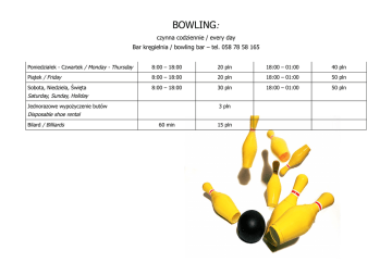 BOWLING: czynna codziennie / every day Bar kręgielnia / bowling bar – tel. 058 78 58 165 Poniedziałek - Czwartek / Monday - Thursday 8:00 – 18:00 20 pln 18:00 – 01:00 40 pln Piątek / Friday 8:00 – 18:00 20 pln 18:00 – 01:00 50 pln Sobota, Niedziela, Święta 8:00 – 18:00 30 pln 18:00 – 01:00 50 pln Saturday, Sunday, Holiday Jednorazowe wypożyczenie butów 3 pln Disposable shoe rental Bilard / Billiards 60 min 15 pln