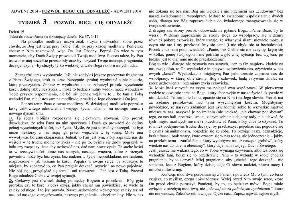 ADWENT 2014 - POZWÓL BOGU CIĘ ODNALEŹĆ - ADWENT 2014 TYDZIEŃ 3 – POZWÓL BOGU CIĘ ODNALEŹĆ Dzień 15 Tekst do rozważania na dzisiejszy dzień: Ez 37, 1-14 Na początku modlitwy uczyń znak krzyża i uświadom sobie przez chwilę, że Bóg jest teraz przy Tobie. Tak jak przy każdej modlitwie. Ponieważ chcesz z Nim rozmawiać, więc On Jest Obecny. Poproś Go więc w tym momencie, aby Duch Święty prowadził Twoją modlitwę. Poproś także, by Pan usuwał w niej wszelkie przeszkody oraz by oczyścił Twoje intencje, pragnienia, decyzje, czyny - by służyły tylko większej chwale Boga i dobru innych ludzi. Zaangażuj teraz wyobraźnię. Jeśli nie zdążyłeś jeszcze przeczytać fragmentu z Pisma Świętego, zrób to teraz. Następnie spróbuj wyobrazić sobie historię, którą przeczytałeś. Zobacz w wyobraźni to, co zobaczył prorok: wyschnięte kości, dolinę jakby bez życia… może to będzie smutny widok, może wzbudzi w Tobie przykre wspomnienia, nie bój się jednak wejść w to… bo tam z Tobą wchodzi Pan, nie jesteś sam na modlitwie, prosiłeś o Jego obecność i On jest. Poproś teraz Pana o owoc modlitwy. W dzisiejszej modlitwie poproś o łaskę całkowitego odnowienia Twojego życia, nadania mu nowego sensu i nowego dynamizmu. 1/. Ta scena biblijna rozpoczyna się ciekawymi słowami. Oto prorok doświadcza, że ręka Pana na nim spoczywa i Duch go prowadzi do doliny pełnej wyschniętych kości, bez życia. Myślę, że jest to ważny szczegół, bo być może niektórzy z nas mają lęk przed wejściem w tę scenę. Może ona wywoływać bolesne skojarzenia. Jednak to Pan jest tym, który zaprasza nas do wejścia w te trudne momenty życia – nie po to, byśmy się znów pogrążyli w bólu czy rozpaczy, lecz aby uzdrowić nas, dać nam nowe życie. Te suche kości to w rzeczywistości obraz nas samych, naszego wnętrza, które z różnych powodów może być bez życia, bez nadziei… życie niepoukładane, nie scalone, rozproszone – jak właśnie te kości. Popatrz w swoje serce, by zobaczyć te miejsca, by zobaczyć to, co Pan pragnie dotknąć, ożywić i na nowo pojednać. Nie bój się, „przyglądać się temu”, ani rozważać – Pan jest z Tobą. Pozwól Bogu odnaleźć Ciebie w twojej sytuacji. 2/. Ciekawy jest również dialog pomiędzy Bogiem a prorokiem. Bóg pyta proroka, czy te kości kiedyś ożyją, jakby chciał mu powiedzieć, że wiele tu zależy od niego. I to jest prawda. Nasze uzdrowienie wewnętrzne zależy też od nas, od naszego zaangażowania, naszego pragnienia – chęci zmiany. Nic w nas nie dokona się bez nas, Bóg nie wejdzie i nie przemieni nas „cudownie” bez naszej świadomości i współpracy. Miłość to świadome współdziałanie dwóch osób, dlatego też Bóg zaprasza ciebie do świadomego zaangażowania się w twoje uzdrowienie. Z drugiej zaś strony prorok odpowiada na pytanie Boga: „Panie Boże, Ty to wiesz”. Widzimy zaproszenie ze strony Boga do współpracy, ale widzimy również pokorę człowieka, który uznaje, że własnymi siłami niewiele może, o czym nie raz i my przekonaliśmy się sami (i nie obyło się to bezboleśnie). Prorok chce nam podpowiedzieć: „Panie, bez Ciebie nic nie uczynię, kręcę się w kółko, gonię swój ogon i nie potrafię wyjść z tej sytuacji bez wyjścia; po ludzku jest to dla mnie nie do przeskoczenia”. Bóg to wie i dlatego nie zostawia nas samych, lecz to On najpierw kładzie na nas swoją dłoń, to On wychodzi z inicjatywą uzdrowienia nas, ożywienia w nas owych „kości”. Wychodząc z inicjatywą Pan jednocześnie zaprasza nas do współpracy, w której obie strony: Bóg i człowiek, będą aktywnie działać na rzecz uzdrowienia i przemiany życia człowieka. 3/. Może ktoś zapytać: na czym ma polegać owa współpraca? W pierwszym rzędzie to otwarcie serca na Boga, który chce wejść w nasze życie i aktywnie w nim działać. To zaufanie Jemu, oparcie się na Nim i na Jego słowie. Prorok ma za zadanie prorokować nad tymi wyschniętymi kośćmi. Moglibyśmy powiedzieć, że naszym zadaniem jest uświadomić sobie te wszystkie martwe miejsca w nas, nazywać je po imieniu (nie uciekać, „nie chować pod dywan” tego, co nas boli, przeraża, smuci, z czym sobie nie dajemy rady, nie udawać, że tych miejsc martwych nie ma) i przedstawiać Panu, który chce to ożywiać. To również podejmować trudne decyzje, by przebaczyć, pojednać się, pogodzić się z czymś nieuniknionym, pogodzić się ze sobą. To przyjąć naszą beznadzieję, brak ufności, brak wiary, które czasem się w nas rodzą, ale jednocześnie – jakby na przekór temu – zaufać Panu, który wydobywa nas „z naszych grobów”, który wiedzie nas do „ziemi obiecanej”, który daje nam swojego Ducha Świętego. Jeśli jeszcze nie widzisz tego, co w Tobie wymaga ożywienia, albo też boisz się wchodzić tam, boisz się to przedstawić Panu – to wzbudź w sobie chociaż pragnienie, by to uczynić. Miej pragnienie, aby „chcieć” tego dotknąć – nie samemu, lecz z Bogiem, który dzisiaj daje Ci słowo nadziei, słowo mocy i miłości miłosiernej. Kończąc modlitwę porozmawiaj z Panem i powiedz Mu o tym, co teraz czujesz, co myślisz, czego doświadczasz. Wylej przed Nim swoje serce, które On przed chwilą poruszył. Pamiętaj, by to, co będziesz mówił Bogu miało związek z przebytą modlitwą, nie „chowaj się za pobożnymi ogólnikami”, które nic nie wnoszą. Zakończ odmawiając: Ojcze nasz. Zapisz najważniejsze myśli. Dzień 16 Tekst do rozważania na dzisiejszy dzień: Łk 5, 1-11 Na początku modlitwy uczyń znak krzyża i uświadom sobie przez chwilę, że oto Bóg jest teraz przy Tobie. Tak jak przy każdej modlitwie. Ponieważ chcesz z Nim rozmawiać, więc On Jest Obecny. Poproś Go więc w tym momencie, aby Duch Święty prowadził Twoją modlitwę. Podobnie jak wczoraj i jak każdego dnia. Zaangażuj teraz wyobraźnię. Nas