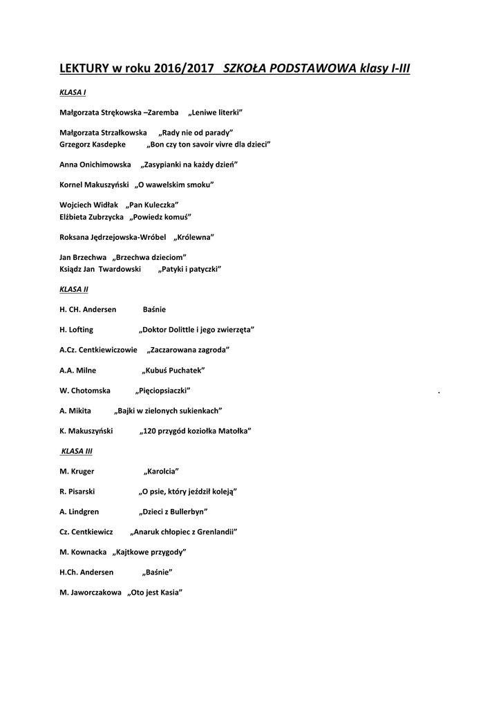 LEKTURY w roku 2016/2017 SZKOŁA PODSTAWOWA klasy I-III KLASA I Małgorzata Strękowska –Zaremba „Leniwe literki” Małgorzata Strzałkowska „Rady nie od parady” Grzegorz Kasdepke „Bon czy ton savoir vivre dla dzieci” Anna Onichimowska „Zasypianki na każdy dzień” Kornel Makuszyński „O wawelskim smoku” Wojciech Widłak „Pan Kuleczka” Elżbieta Zubrzycka „Powiedz komuś” Roksana Jędrzejowska-Wróbel „Królewna” Jan Brzechwa „Brzechwa dzieciom” Ksiądz Jan Twardowski „Patyki i patyczki” KLASA II H. CH. Andersen Baśnie H. Lofting „Doktor Dolittle i jego zwierzęta” A.Cz. Centkiewiczowie A.A. Milne W. Chotomska A. Mikita K. Makuszyński „Zaczarowana zagroda” „Kubuś Puchatek” „Pięciopsiaczki” „Bajki w zielonych sukienkach” „120 przygód koziołka Matołka” KLASA III M. Kruger „Karolcia” R. Pisarski „O psie, który jeździł koleją” A. Lindgren „Dzieci z Bullerbyn” Cz. Centkiewicz „Anaruk chłopiec z Grenlandii” M. Kownacka „Kajtkowe przygody” H.Ch. Andersen „Baśnie” M. Jaworczakowa „Oto jest Kasia” . LEKTURY w roku 2016/2017 SZKOŁA PODSTAWOWA klasy IV-VI KLASA IV Sempe i Goscinny R. Dahl „Mikołajek” „MATYLDA” J.OLECH „DYNASTIA MIZIOŁKÓW” A. Nowak „Yellow Bahama w prążki” Legendy, nowele KLASA V F. H. Burnett „Tajemniczy ogród” J. Verne „W 80 dni dookoła świata” F. Molnar „CHŁOPCY Z PLACU BRONI” K. Makuszyński „Szatan z siódmej klasy” Legendy, nowele, mity KLASA VI H. Sienkiewicz „W pustyni i w puszczy” E. Niziurski J.K. Rowling „Sposób na Alcybiadesa” „Harry Potter i kamień filozoficzny” I. Jurgielewiczowa „Ten obcy”