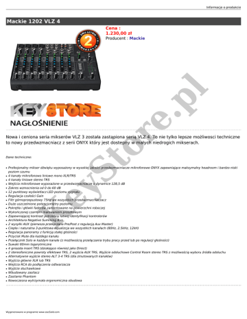 Informacje o produkcie Mackie 1202 VLZ 4 Cena : 1.230,00 zł or e. pl Producent : Mackie Nowa i ceniona seria mikserów VLZ 3 została zastąpiona serią VLZ 4. To nie tylko lepsze możliwosci techniczne to nowy przedwzmacniacz z serii ONYX który jest dostepny w małych niedrogich mikserach. ● ● ● ● ● ● ● ● ● ● ● ● ● ● ● ● ● ● ● ● ● ● ● ● ● ● ey ● Profesjonalny mikser dźwięku wyposażony w wysokiej jakości przedwzmacniacze mikrofonowe ONYX zapewniające maksymalny headroom i bardzo niski poziom szumu 4 kanały mikrofonowo liniowe mono XLR/TRS 4 kanały liniowe stereo TRS Wejścia mikrofonowe wyposażone w przedwzmacniacze o dynamice 128,5 dB Zakres wzmocnienia od 0 do 60 dB 12 punktowy wyświetlacz LED poziomu sygnału Regulacja czułości Gain Filtr górnoprzepustowy 75Hz we wszystkich przedwzmacniaczacz Duże uszczelnione potencjometry poziomu Pokrętła i główki faderów zamontowane na powierzchni roboczej Wykończonej czarnym malowaniem proszkowym Zapewniającej kontrast potrzebny łatwej identyfikacji kontrolerów Architektura Negative Summing Bus 2 wysyłki AUX (pierwsza przełączana Pre/Post z regulacją Aux Master) Ciepła i naturalna 3-punktowa equalizcja we wszystkich kanałach (80Hz, 2.5kHz, 12kH) Regulacja panoramy z funkcją stałej głośności Przycisk Mute dla każdego kanału Przełącznik Solo w każdym kanale (z możliwością przełączania trybu pracy przed lub po regulacji głośności) Suwaki 60mm logarytmiczne 4 gniazda insert TRS (działające również jako Direct) 2 stereofoniczne powroty efektowe TRS, 2 wyjścia AUX TRS, Wyjście odsłuchowe Control Room stereo TRS z możliwością wyboru źródła odsłuchu Alternatywne wyjście stereo ALT 3-4 TRS (dla zmutowanych kanałów) Wyjścia główne XLR lub TRS Wejścia RCA do podłączenia odtwarzacza Wyjście słuchawkowe Wbudowany zasilacz Zasilanie Phantom Nowoczesna wytrzymała ergonomiczna obudowa K ● St Dane techniczne: Wygenerowano w programie www.oscGold.com